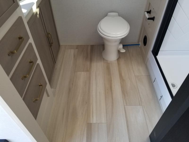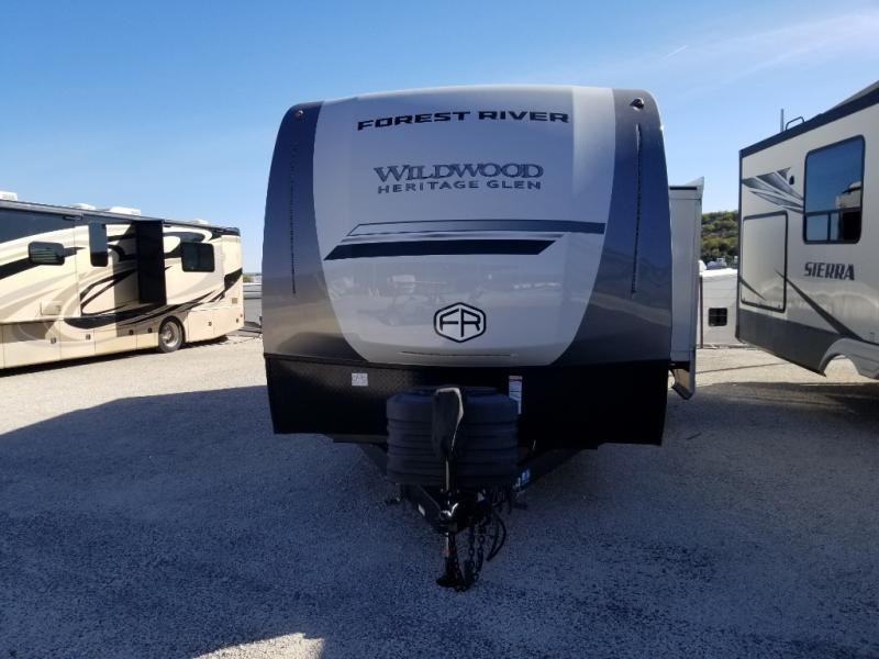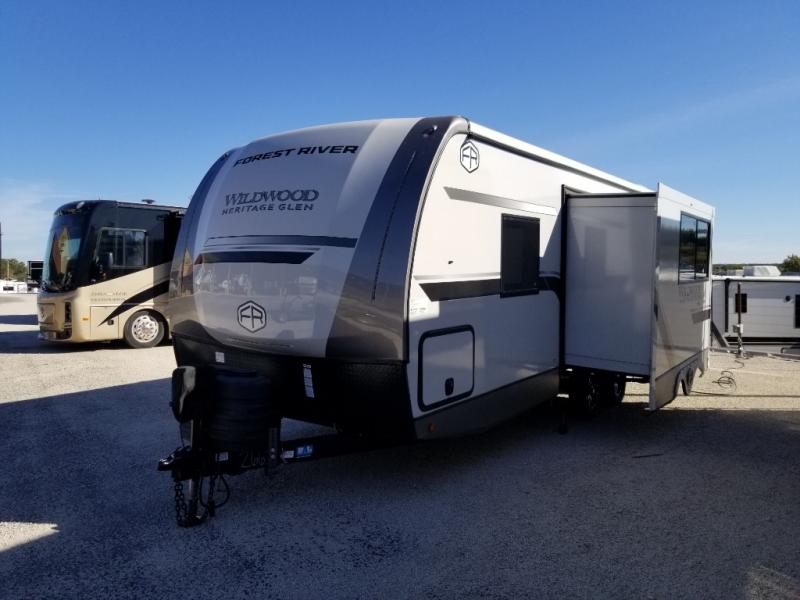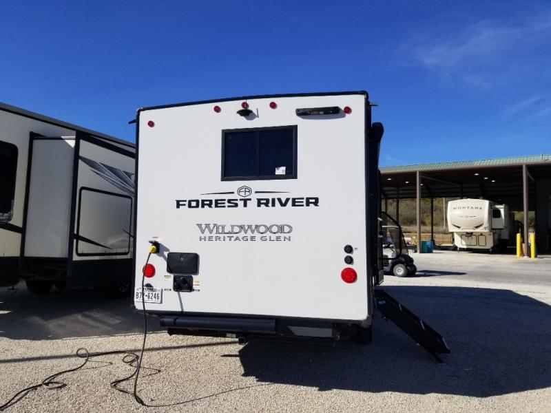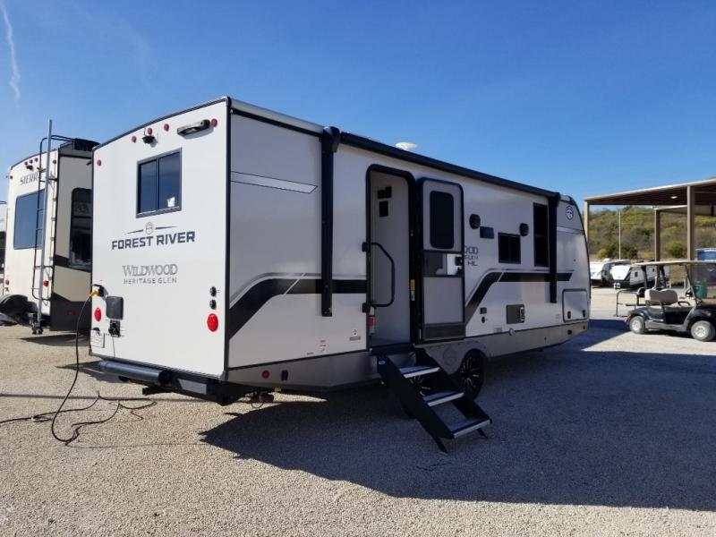 The Wildwood Heritage Glen Hyper-Lyte travel trailer by Forest River offers stability with a wide stance axle system, easy setup with a power tongue jack with an LED docking light, and safe entry with the Step Above aluminum entry steps. The interior includes Temple Cherry cabinetry with matte gold hardware, hidden hinges on the cabinet doors, and a residential single bowl undermount sink. You will also find a back-up camera prep and solar prep, an outdoor shower, Maxxis radial tires, and many more exterior conveniences.