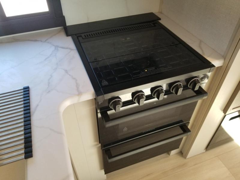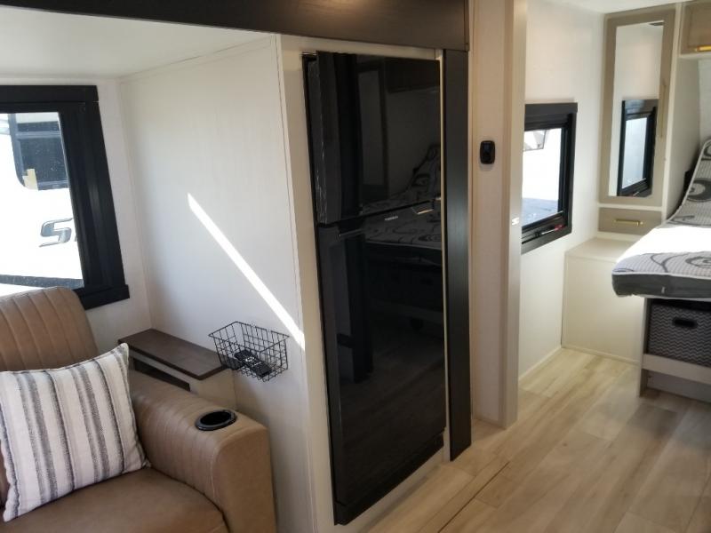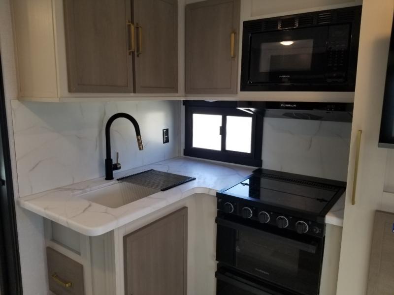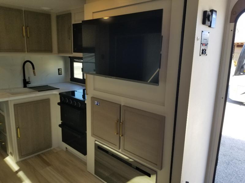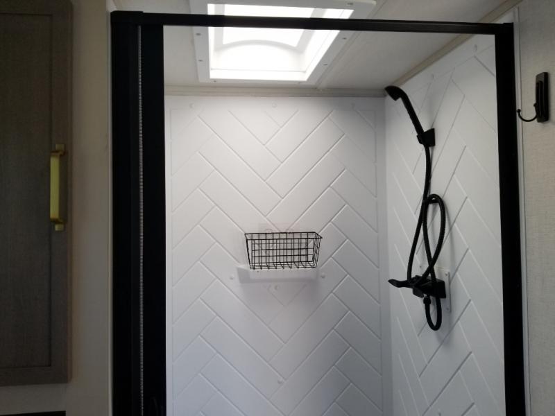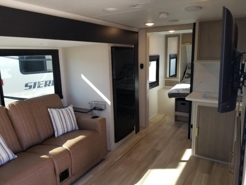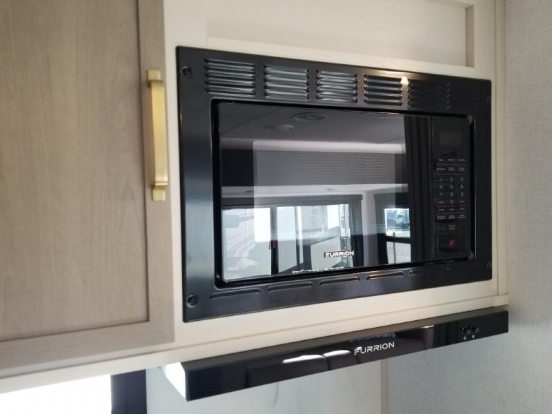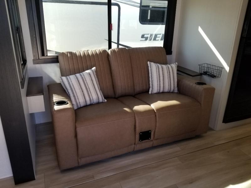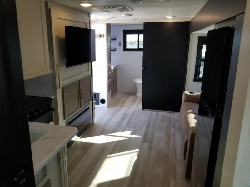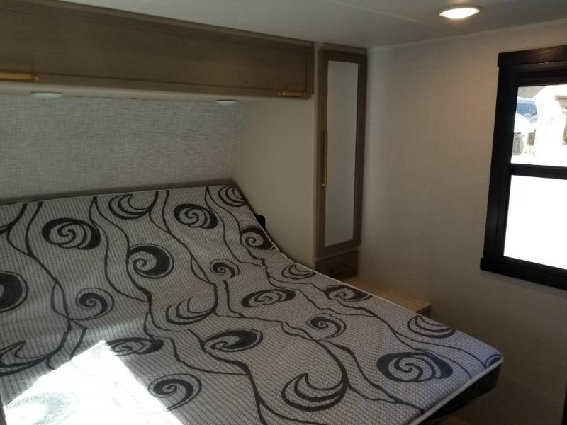 If you like to be different, this couples trailer offers theater seating and a removable table that you can relax on and dine at. There is also a swing-open entertainment center and a fireplace right across from the seats for perfect viewing. The kitchen has full amenities including a 12V black refrigerator and hidden storage behind the TV. The rear bath offers a walk-in shower with a skylight for more natural lighting, a large linen cabinet for all your essentials, a wardrobe and everything else you need to stay refreshed and clean without having to use the public facilities. The front bedroom offers a space savings door, a queen bed with Versa Tilt and dual wardrobes. You will also find a Texas-sized pass-through compartment outside for the outdoor gear such as camping chairs, charcoal, and such.