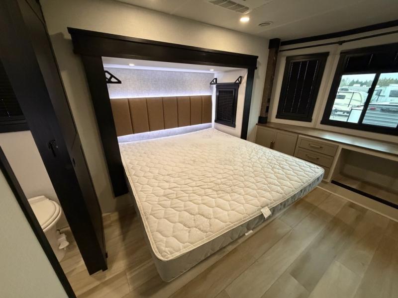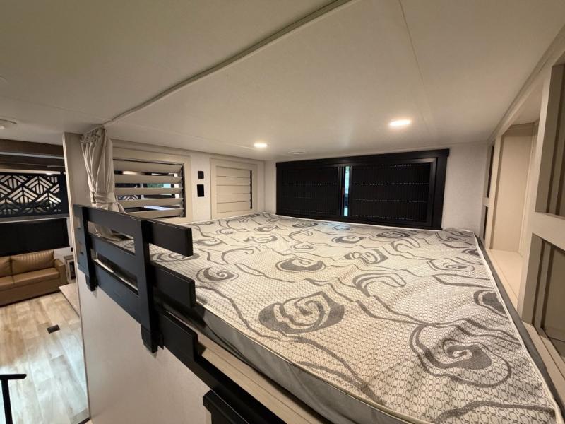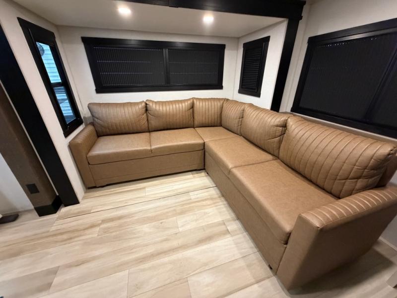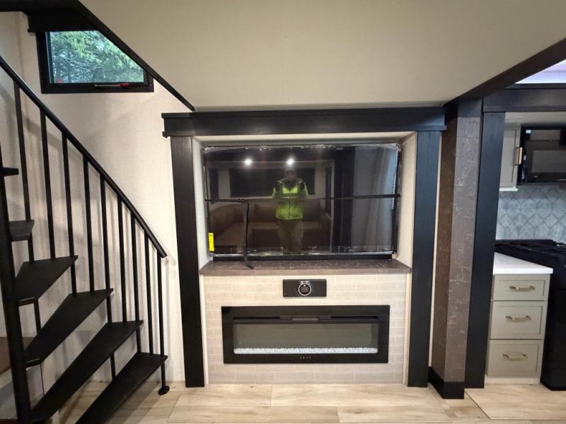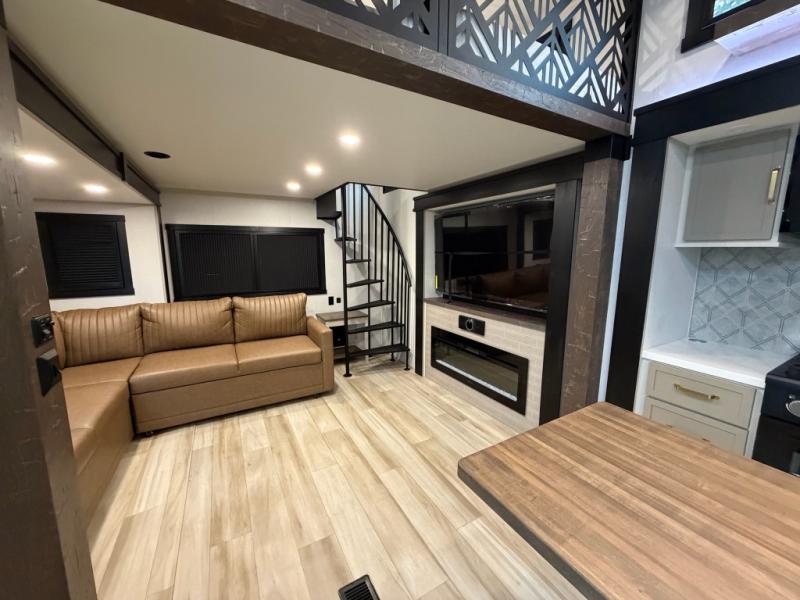 Introducing a new RV of its kind, the ROOST43 is a destination-style fifth wheel you are sure to love! There are two levels, making it feel more like home, and you can sleep six to eight each night. The master bedroom includes a custom king bed slide out, a 32" TV and fireplace, a desk/vanity, plus a half bath for convenience. A custom king-size bed is also found in the front loft, and there are storage cubbies plus a coax/110V outlet here to plug in chargers or a laptop. The second loft in the back includes spiral stairs, two bunk mats, a wardrobe, and cubby cubes here also for your guests' things. Some of the stand-out features you'll find on the first level are the sectional sofa with a coffee table, an entertainment center with a 65" TV, a kitchen island with five chairs, and a fully-equipped kitchen. The 20 cu. ft. 12V refrigerator and pull-out pantry will let you stock up on food, and the kitchen hutch will be perfect for nice dishes. The full bath on this model is one to remember; there is a one-piece fiberglass shower with a teak seat, a flip-up shelf and a washer/dryer, a backlit mirror, and more. And we haven't even touched on the exterior features, such as the pull-out tray, outdoor refrigerators, 20' awning, and more!