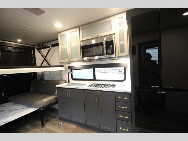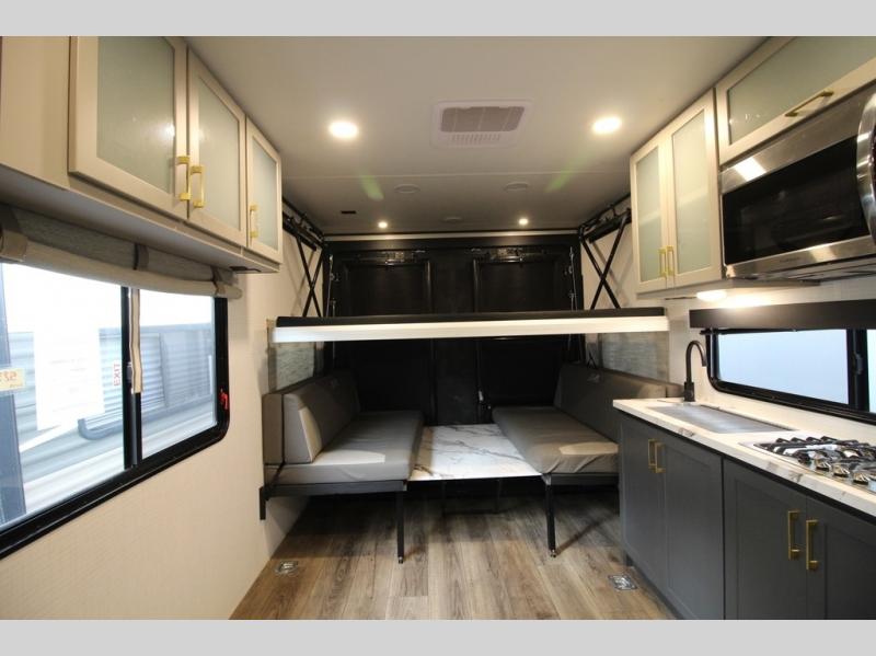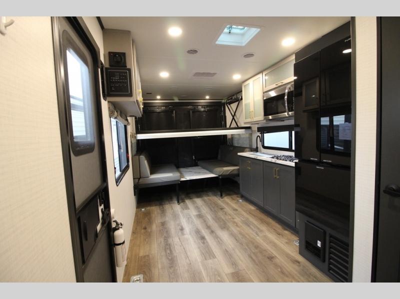 This versatile toy hauler is ready for adventure when you are! After you've unloaded your toys using the 3,000 lb. capacity ramp door, you can relax on the sofas with a removable dinette table in between. There is also a queen-size Euro bed lift above the sofas for more sleeping space. The chef of your group can make meals on the three burner cooktop or in the convection microwave oven, and there is a full bath on board to freshen up each day. This model also includes a Murphy bed up front plus a sofa that can be used once the bed is put away; how convenient!