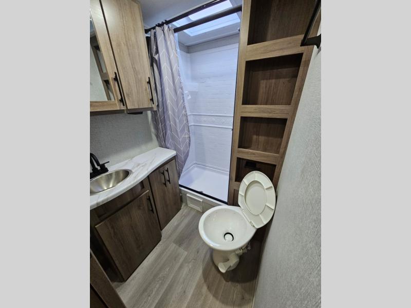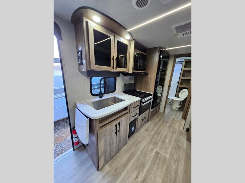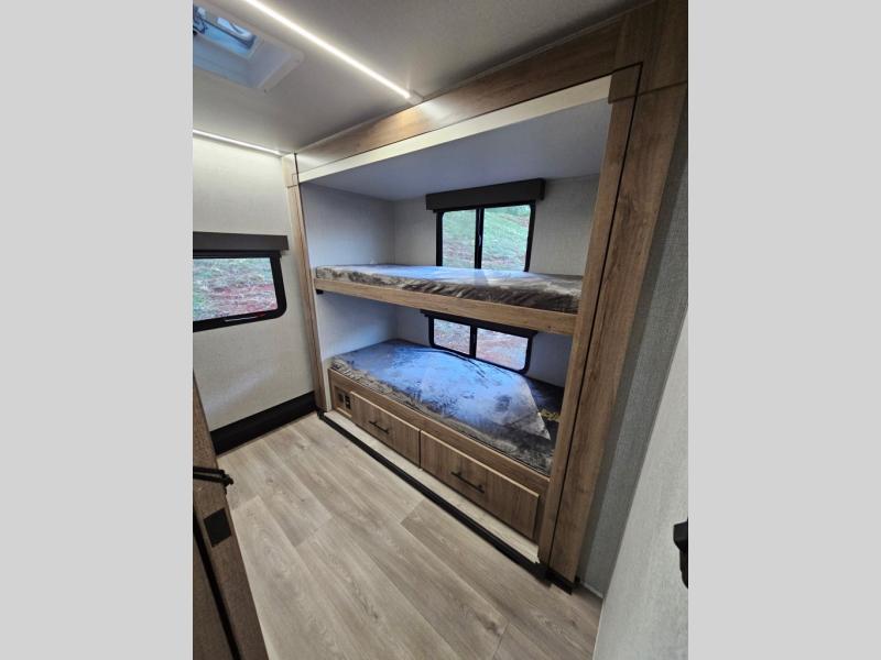 Your family will love camping in this spacious and versatile trailer thanks to the double slides and Murphy bed provided. During the day the Murphy bed is tucked away to provide more space and seating, and at night when folded down, there is a curtain for some privacy as you sleep. The booth dinette slides out to provide even more space and features windows on three sides so you can look out at your surroundings while you enjoy breakfast. The 30" flip top and bottom bunks each have some privacy with the sliding door, and the bunks are right next to the full bathroom for easy access in the middle of the night. The kitchen features everything you need to create meals and snacks as you travel, and you can have some more prep space by using the flip-up countertop extension.
