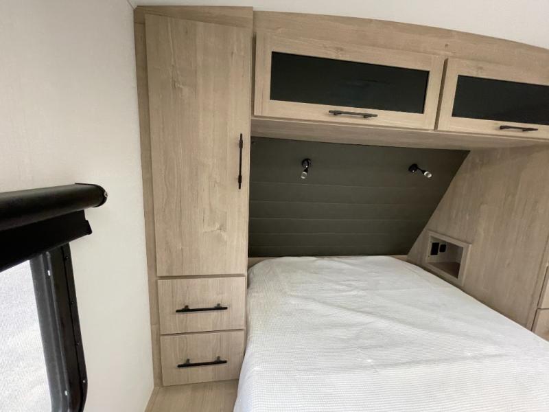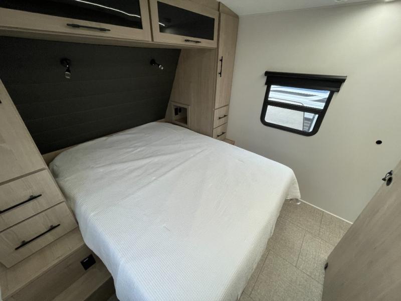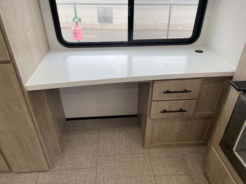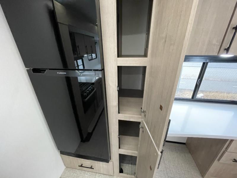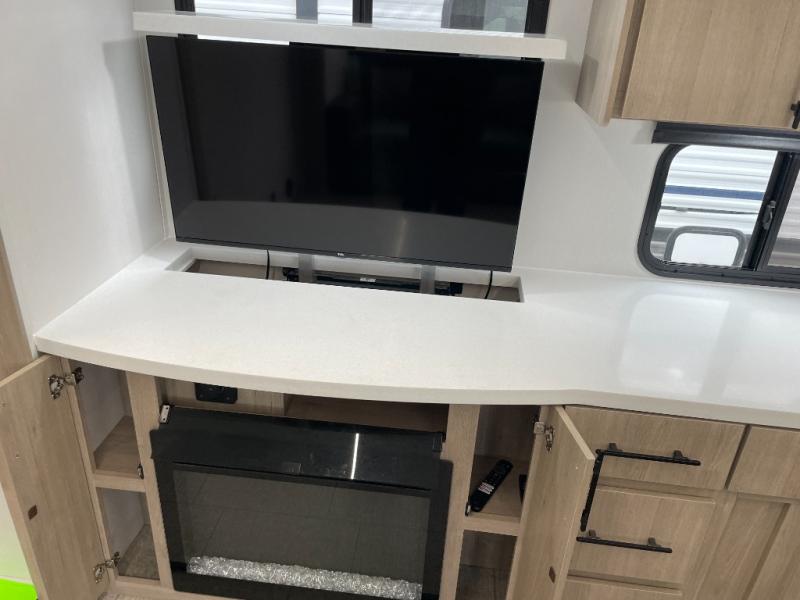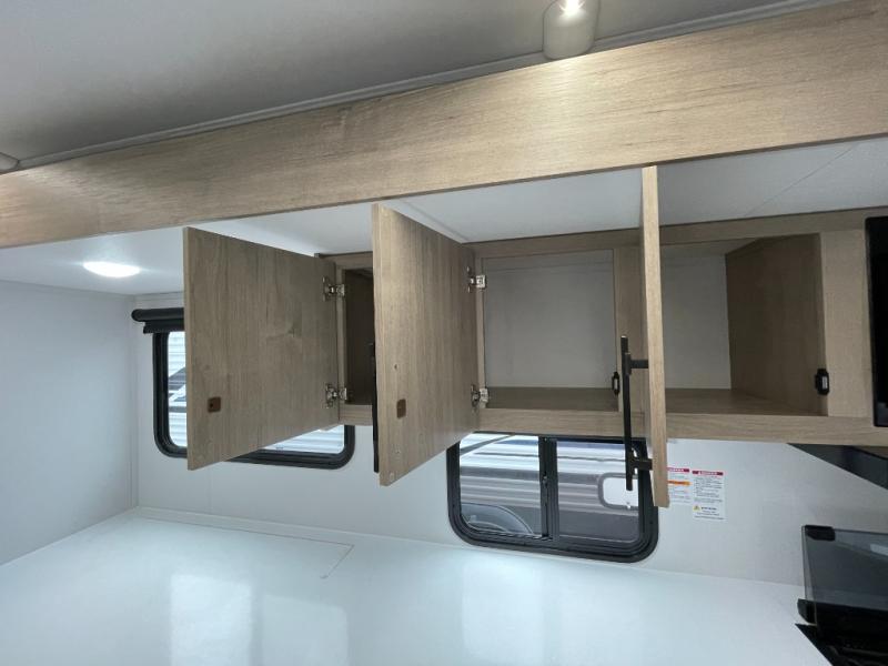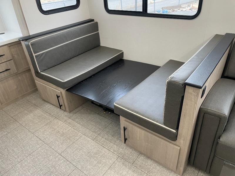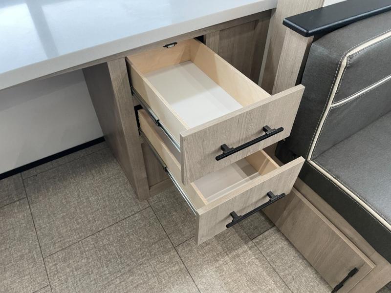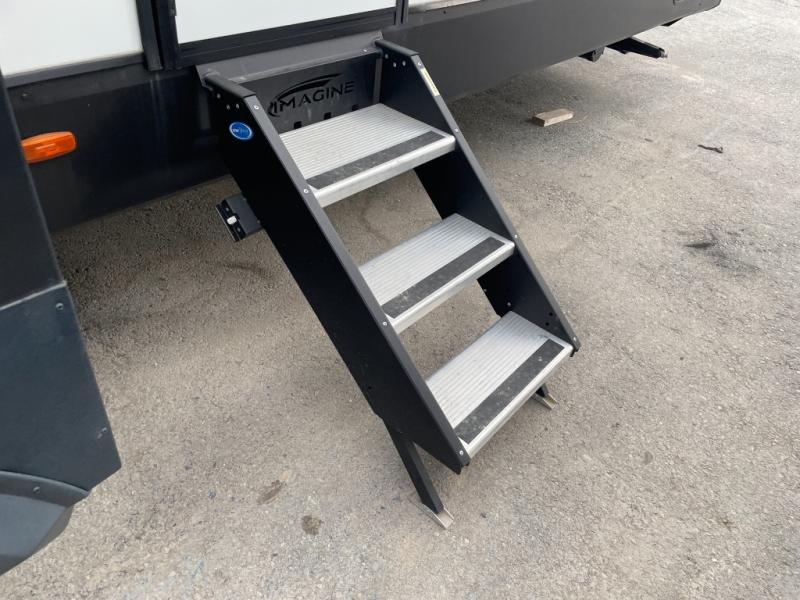 With this Imagine travel trailer, you can work while you're on the road because it offers you a desk in the main living area. You won't have to miss out on the action since you'll be right next to the booth dinette and tri-fold sofa, and there is even a pantry directly to the left of the desk for you to grab a quick snack while you're working. Once you're done with work, you can relax on the tri-fold sofa while you watch the telescoping LED HDTV, and the private bedroom offers you a 60" x 80" queen bed to rest on when you're ready to call it a night.