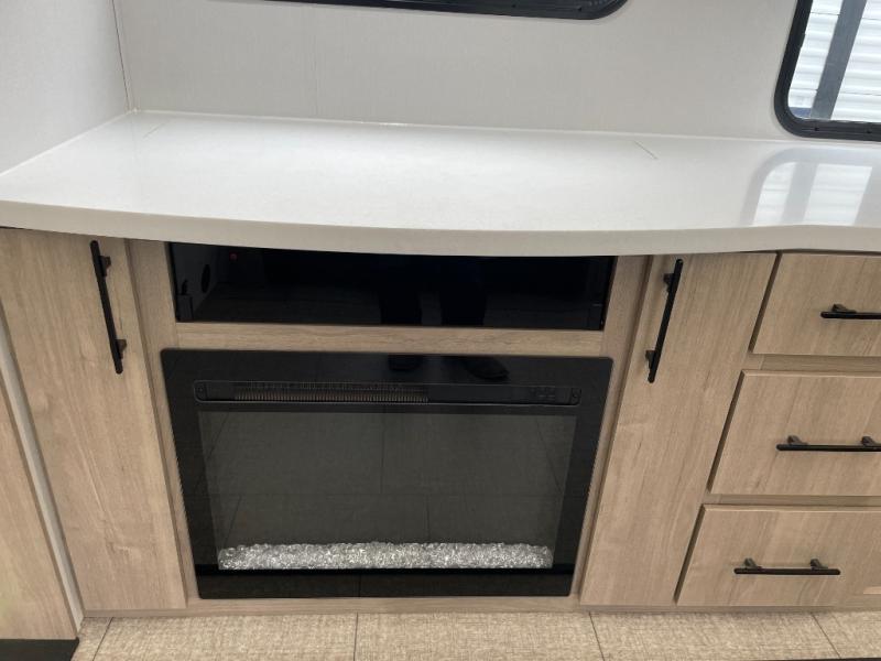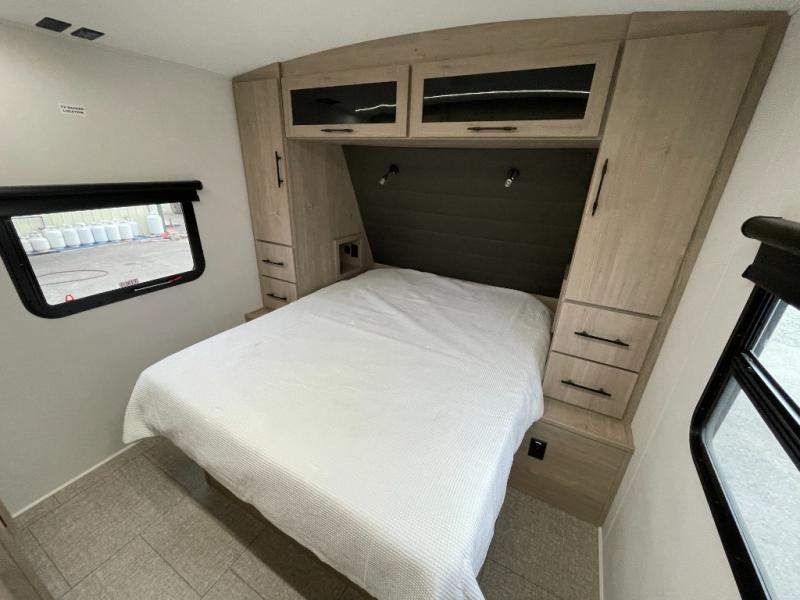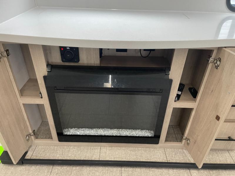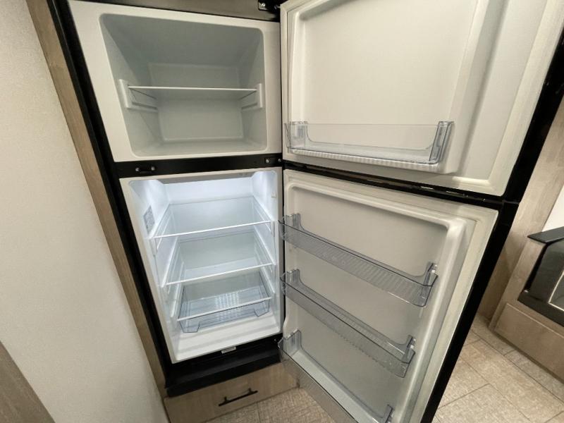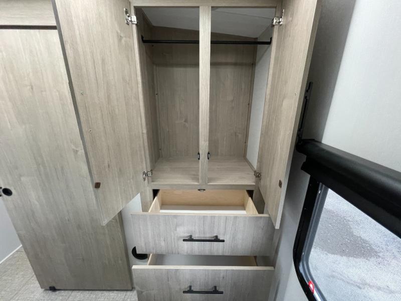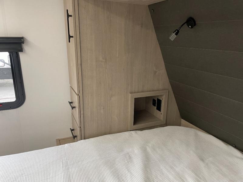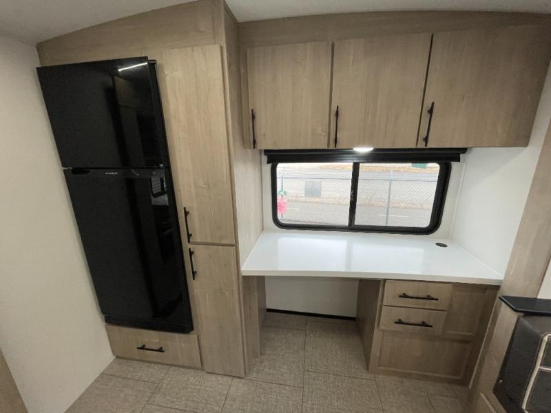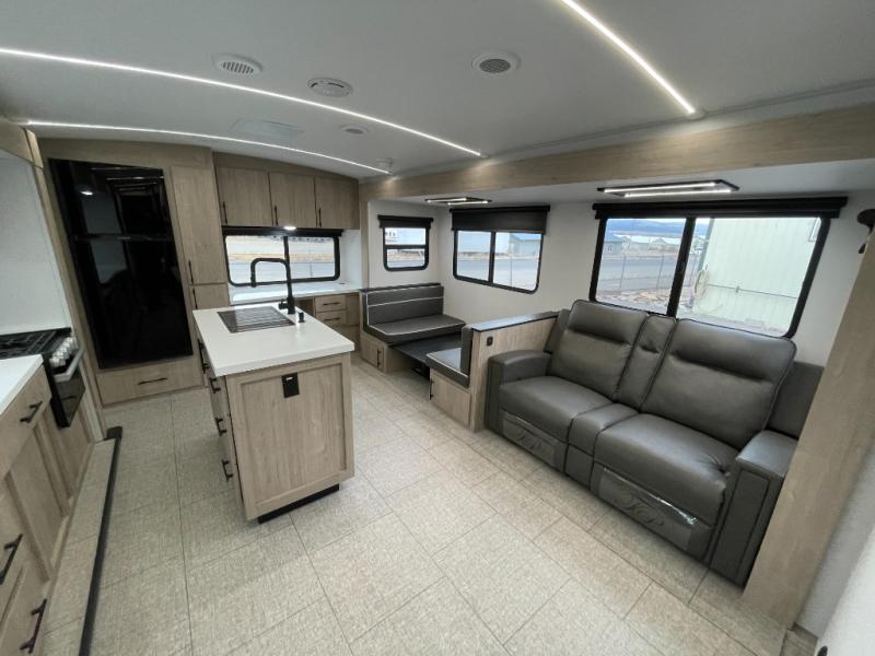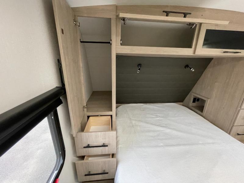 With this Imagine travel trailer, you can work while you're on the road because it offers you a desk in the main living area. You won't have to miss out on the action since you'll be right next to the booth dinette and tri-fold sofa, and there is even a pantry directly to the left of the desk for you to grab a quick snack while you're working. Once you're done with work, you can relax on the tri-fold sofa while you watch the telescoping LED HDTV, and the private bedroom offers you a 60" x 80" queen bed to rest on when you're ready to call it a night.