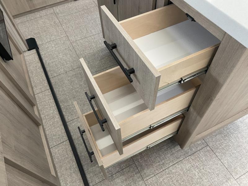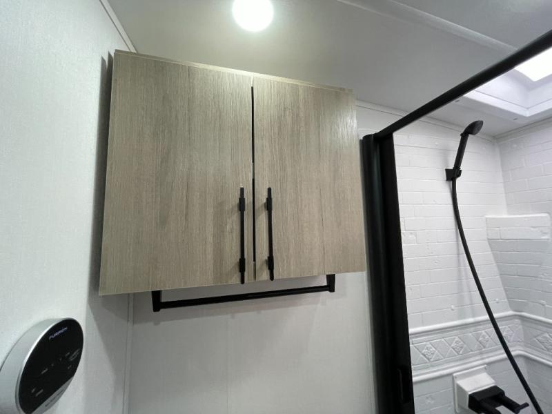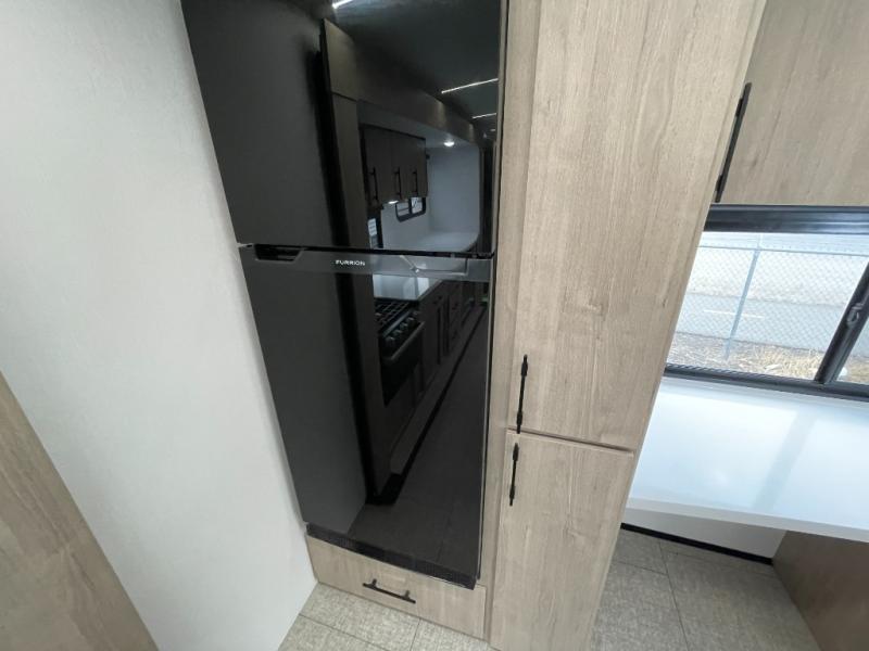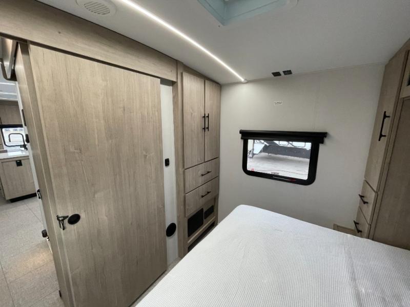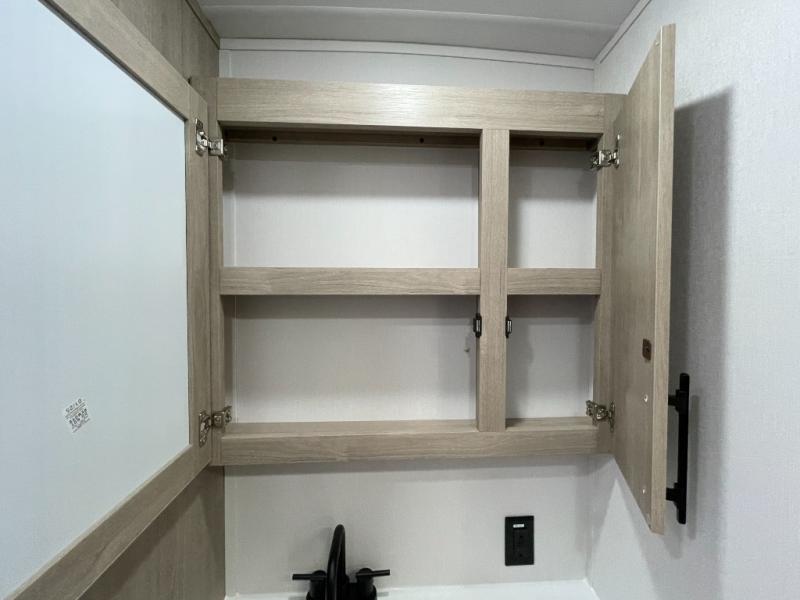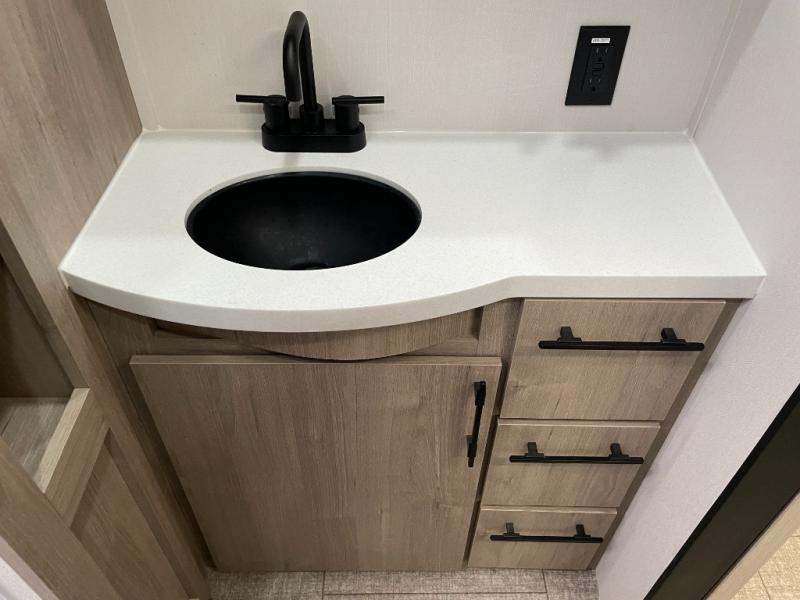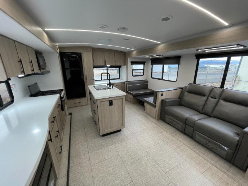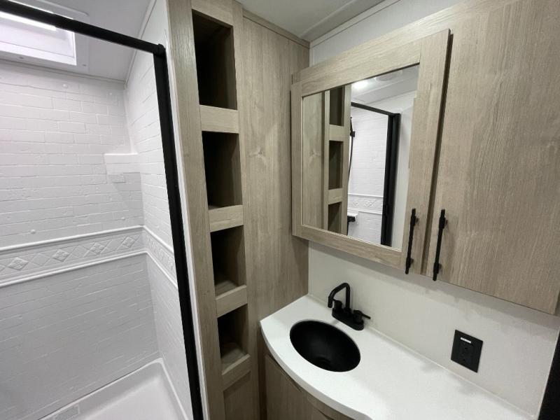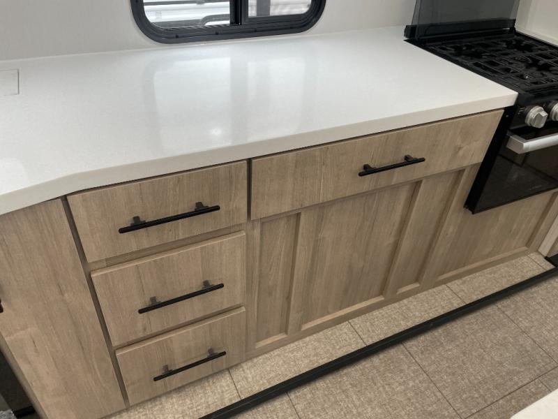 With this Imagine travel trailer, you can work while you're on the road because it offers you a desk in the main living area. You won't have to miss out on the action since you'll be right next to the booth dinette and tri-fold sofa, and there is even a pantry directly to the left of the desk for you to grab a quick snack while you're working. Once you're done with work, you can relax on the tri-fold sofa while you watch the telescoping LED HDTV, and the private bedroom offers you a 60" x 80" queen bed to rest on when you're ready to call it a night.