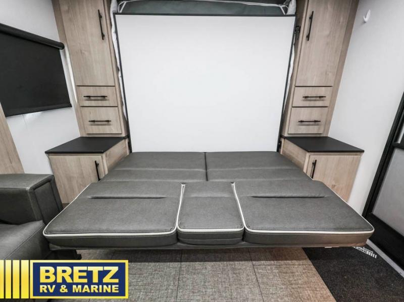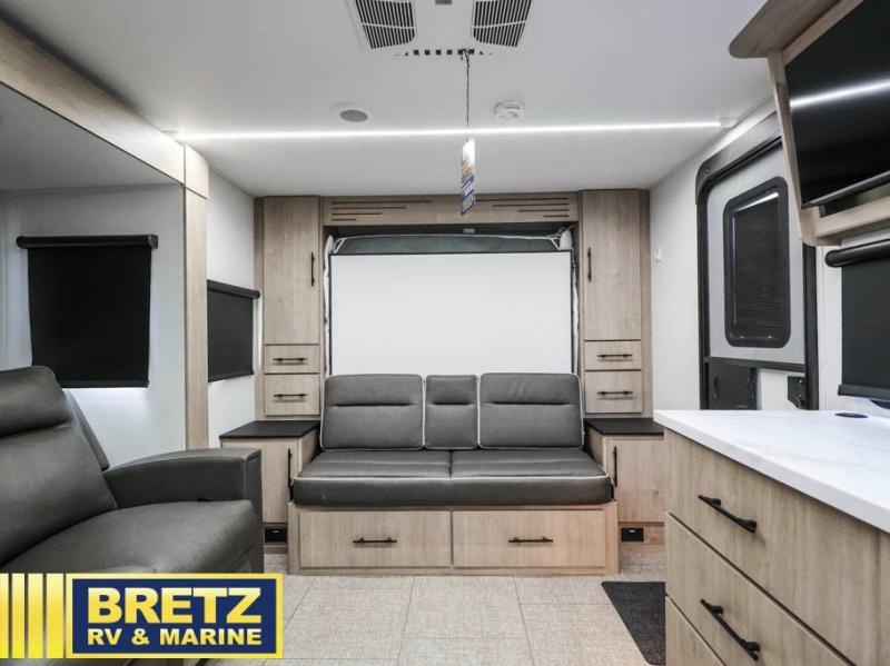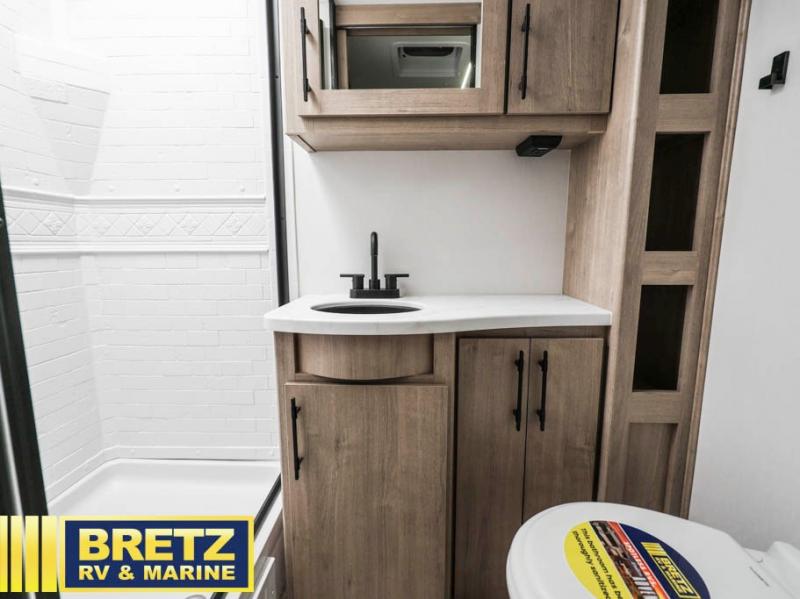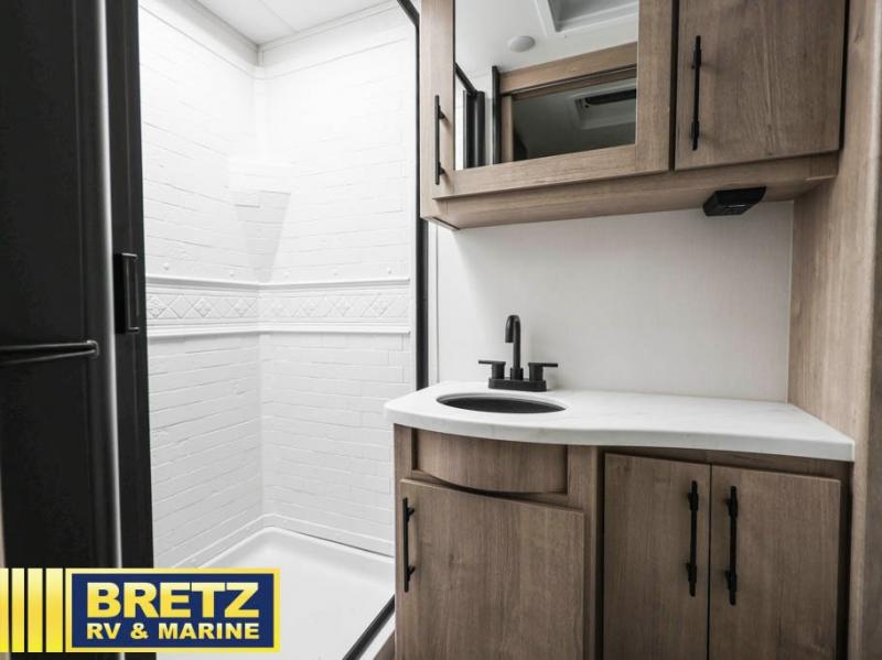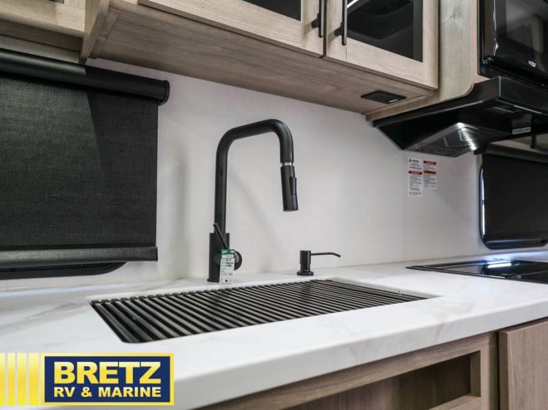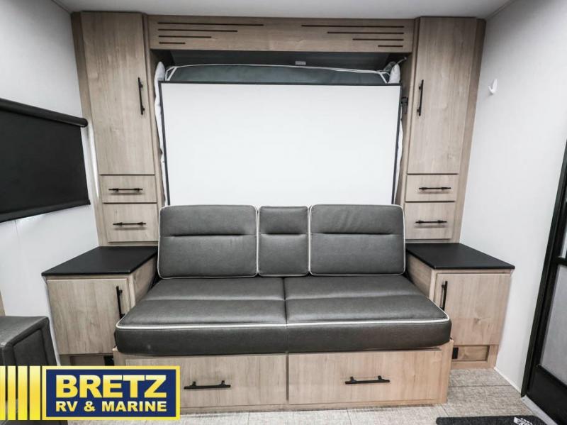 The Murphy bed is the eye-catching feature on this Imagine XLS travel trailer! Not only can it fold away in the morning to reveal a sofa for lounging, but it will also provide you with drawer storage under the sofa. Another functional feature is the theater dinette with a removable table in front or you can choose the optional U-shaped dinette if you like to gather around for game night. It rests on the single slide so that there is more floor space, and it offers you great comfort while you dine across from the LED HDTV. A full bathroom will keep you clean and fresh with its residential walk-in shower, skylight, linen closet, vanity, toilet, and power vent fan.