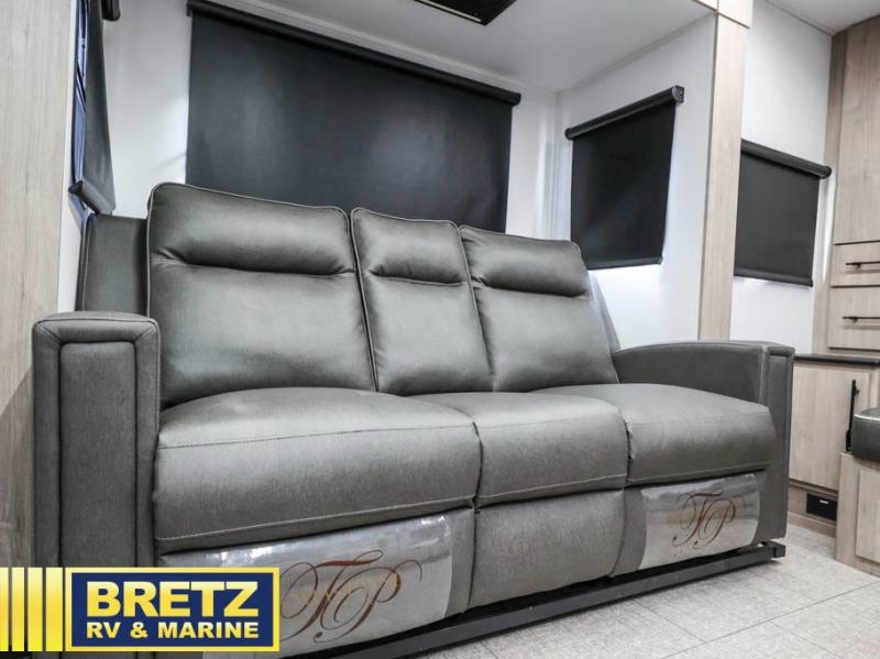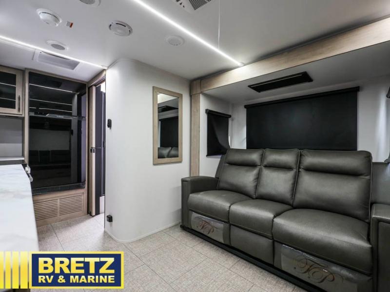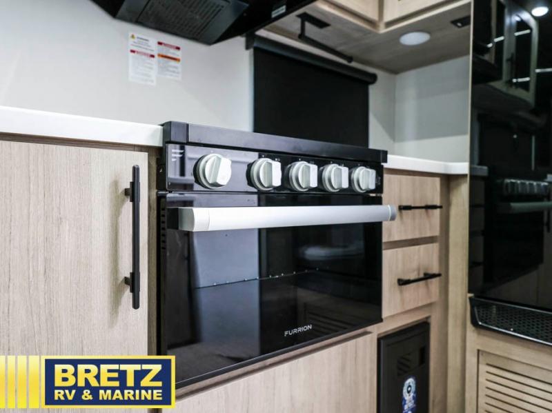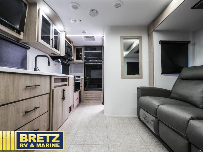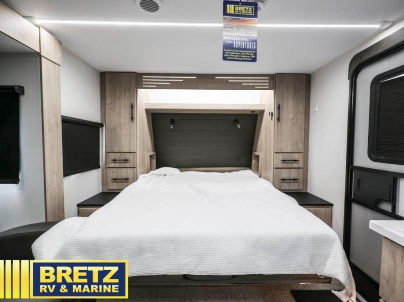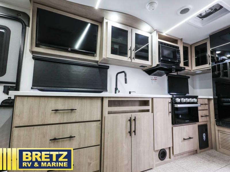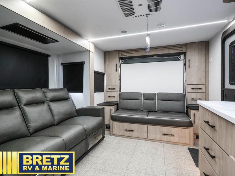 The Murphy bed is the eye-catching feature on this Imagine XLS travel trailer! Not only can it fold away in the morning to reveal a sofa for lounging, but it will also provide you with drawer storage under the sofa. Another functional feature is the theater dinette with a removable table in front or you can choose the optional U-shaped dinette if you like to gather around for game night. It rests on the single slide so that there is more floor space, and it offers you great comfort while you dine across from the LED HDTV. A full bathroom will keep you clean and fresh with its residential walk-in shower, skylight, linen closet, vanity, toilet, and power vent fan.