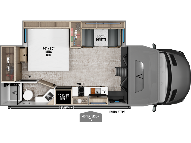 - Spacious 70" x 80" king bed located in the full-wall slide