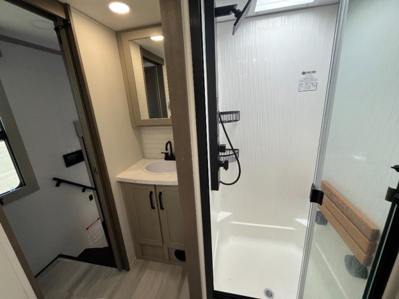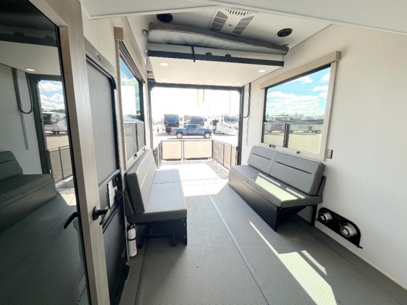 You want a toy hauler to carry your toys to the trails, and include many at-home comforts, and that's just what this unit delivers. A 14' separate garage includes an adjustable tie-down system, an optional Lifesuite System for more sleeping space, an optional half bath, plus washer and dryer prep. There is an overhead loft bed and an L-shaped sofa with recline in the main living area that offers sleeping space as well. Everyone can watch a movie on the LED TV with a fireplace below while sitting on the sofa. The chef will have upgraded appliances to make meals for everyone, an L-shaped countertop with a kitchen sink, and a USB charging outlet. You will love the shower with seat in the full bathroom with two space savings sliding doors that lead into the hallway, and into the front bedroom where you will have a walk-around queen bed, a slide out wardrobe and more USB charging outlets.