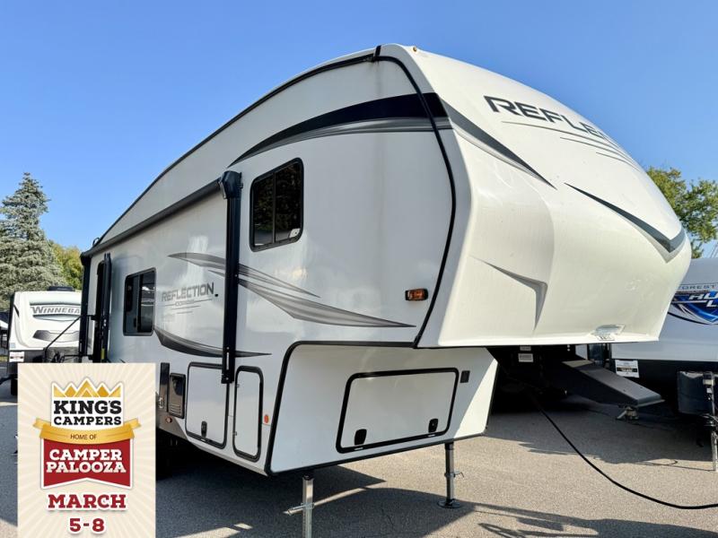 Each Reflection 100 Series fifth wheel by Grand Design is affordable and packed with luxury for unforgettable camping memories! The MorRyde CRE3000 suspension system and Goodyear Endurance tires will provide smooth towing from home to campground. And the solar package with a 180W solar panel, 60 Amp charge controller and 12V refrigerator will allow you to camp for longer periods of time and in more locations! A heated and enclosed underbelly with circulating heat is included in the Arctic 4-Seasons Protection Package, along with a double insulated roof and front cap, and thermofoil insulation under the holding tanks so you can camp all year long if you choose. You will appreciate having an on-demand water heater for hot showers after exploring, and the universal all-in-one docking station will let you monitor your RVs tanks levels and functions with ease. These models also include many luxurious interior features, such as premium Congoleum flooring, pleated shades, residential cabinetry, and matte black fixtures and hardware. Don't let the Reflection 100 Series fifth wheels pass you by!