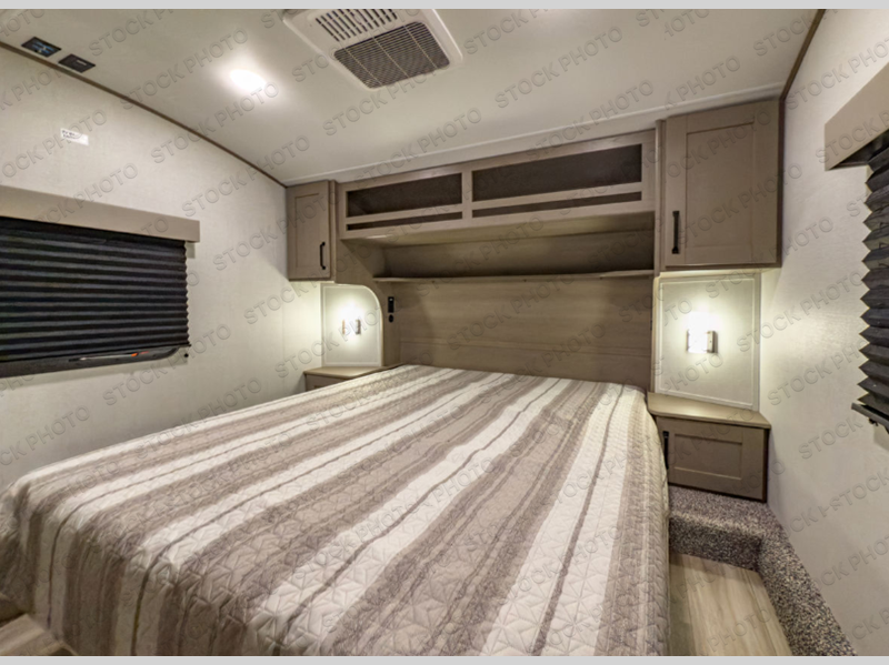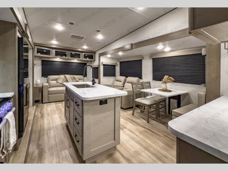 You'll love the amount of space you have in this fifth wheel thanks to the dual opposing slides in the rear living area/kitchen. Your friends and family can relax on the tri-fold sofa or theater seating across from the high-definition 40" LED TV. There is also a booth dinette or you can choose the optional swivel dinette if you prefer that seating. The chef of your group will appreciate having a kitchen island that will provide more counter space, plus there is a hutch with overhead cabinets for nice dishes. A full bath onboard lets you clean up each day and the front private bedroom includes a queen bed just like at home. You'll also love spending time outdoors under the electric awning, and there is an unobstructed pass-thru storage for fishing poles, hiking gear, and camp chairs!