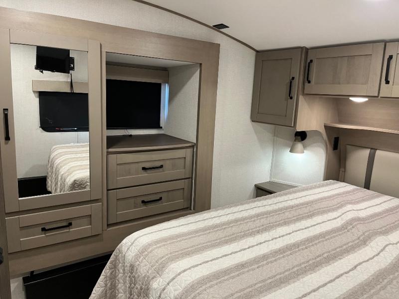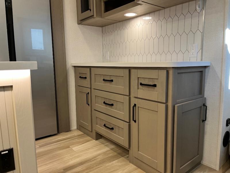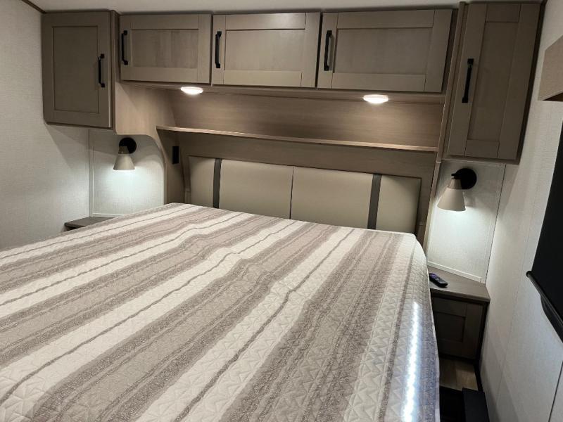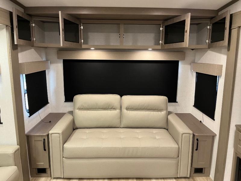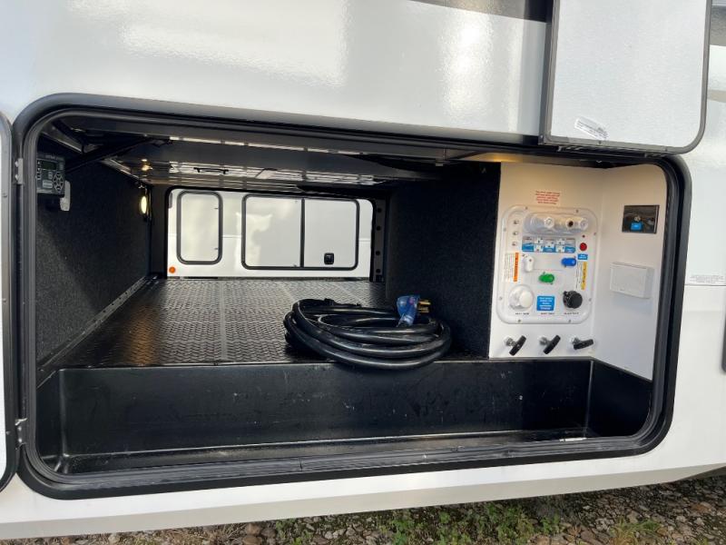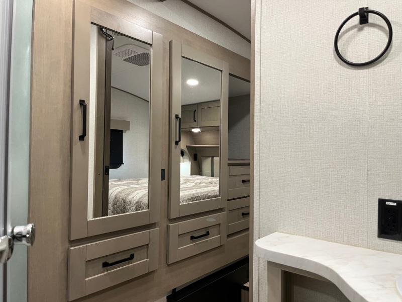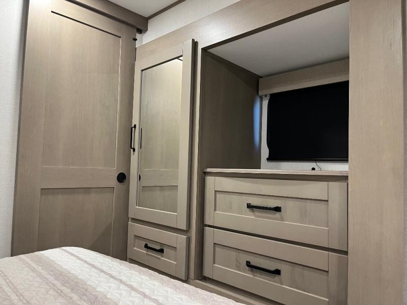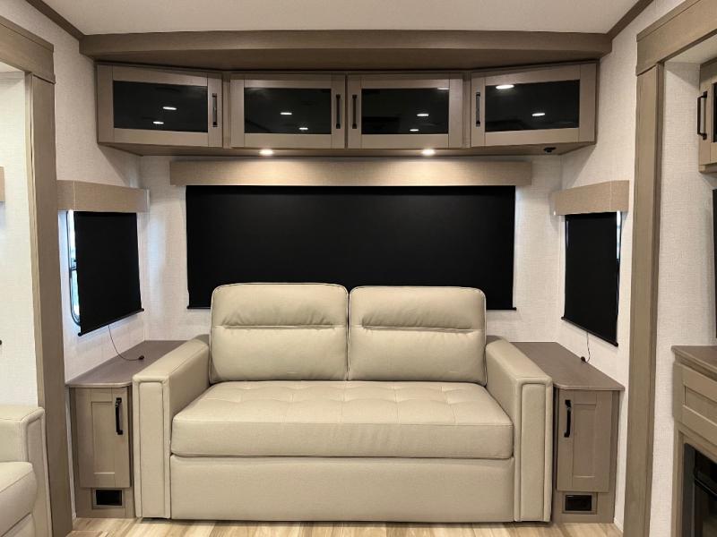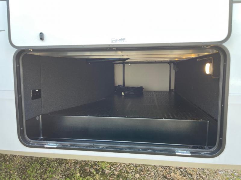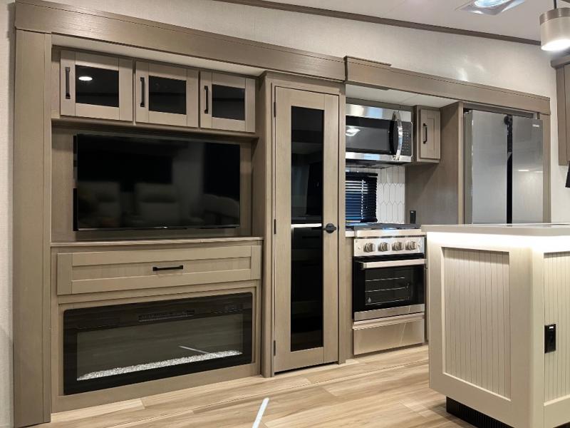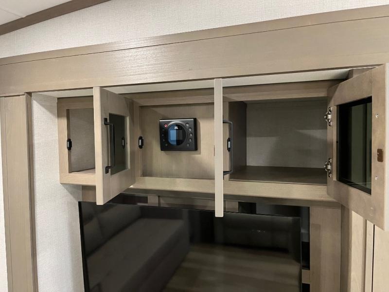 Whether you travel for pleasure or work, you will love the spacious main living and kitchen area with a rear tri-fold sofa that doubles as extra sleeping space, and the theater seating directly across from the entertainment center with a 40" LED HDTV and a fireplace below. The kitchen island will make meal prepping and drying the dishes easier and the hutch is the perfect place to place your picture frames, nice dishes, and extra cooking items. There is even a pantry that is big enough to store all of your favorite snacks, dry ingredients and such. Outside you can enjoy two electric awnings that provide protection from the elements as you relax and visit with other RVers, and your camping chairs can easily be stored in the pass-through compartment. The double entry bathroom is convenient especially at night when you can slide the door to enter from the front master bedroom. You will find plenty of storage for your clothing and gear, plus the bedroom slide out gives you drawers and linen storage that stretches into the full bathroom.