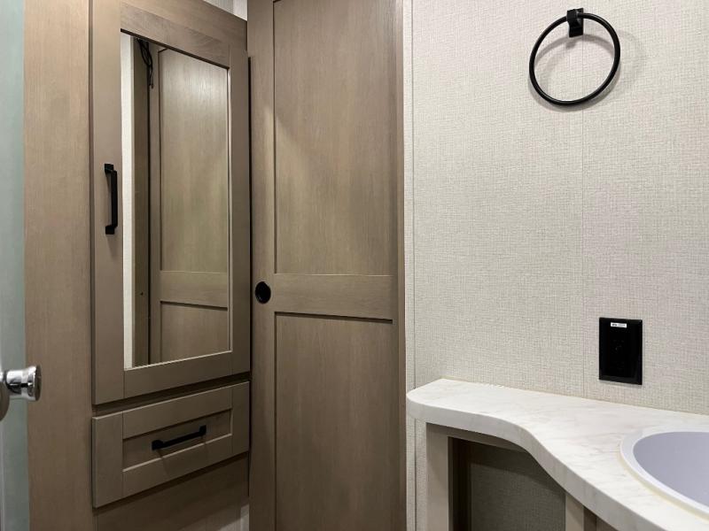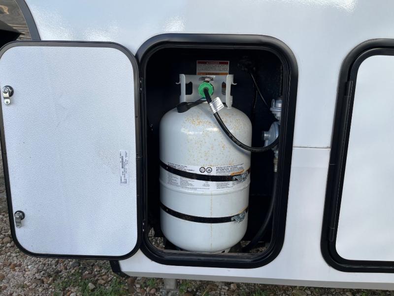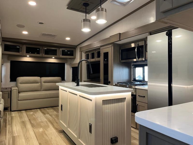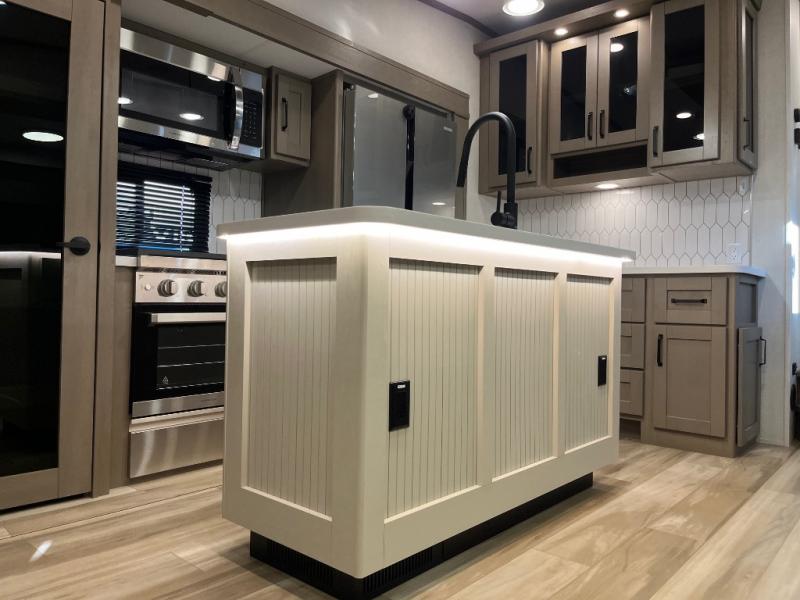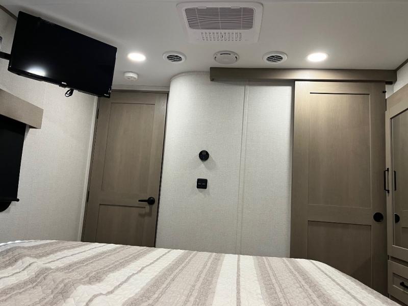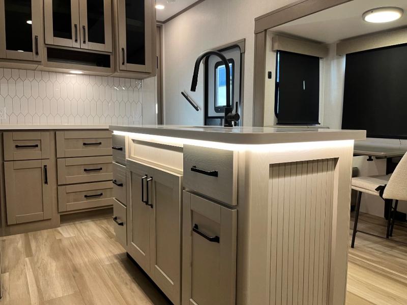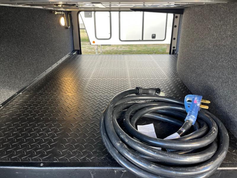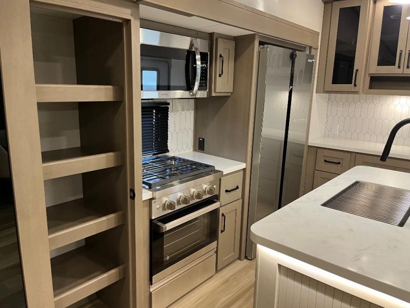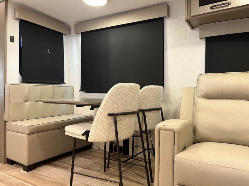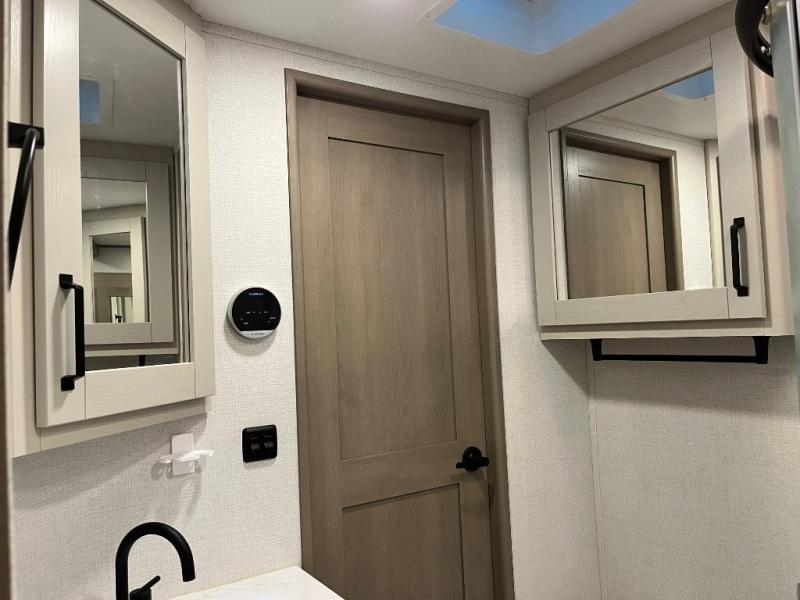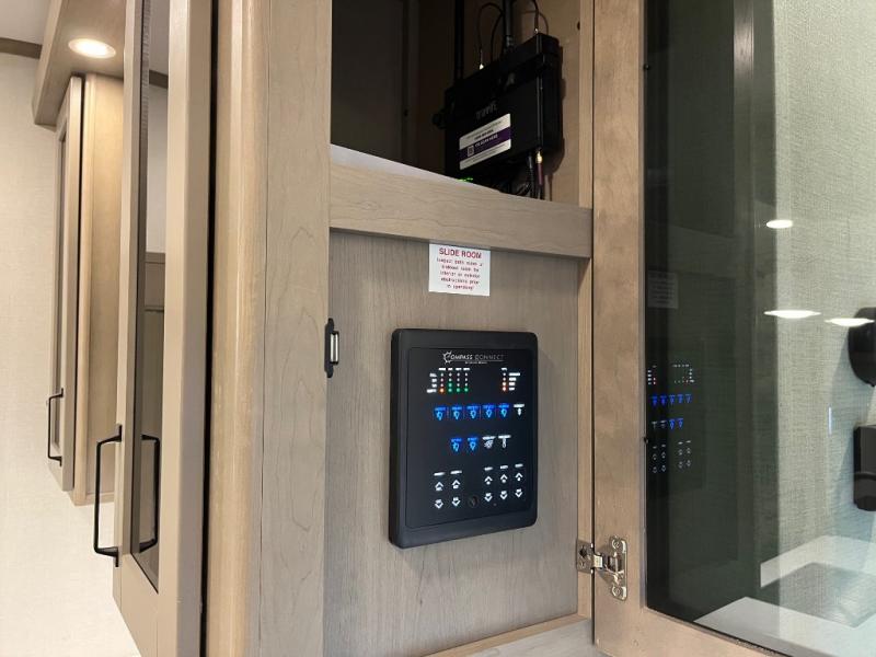 Whether you travel for pleasure or work, you will love the spacious main living and kitchen area with a rear tri-fold sofa that doubles as extra sleeping space, and the theater seating directly across from the entertainment center with a 40" LED HDTV and a fireplace below. The kitchen island will make meal prepping and drying the dishes easier and the hutch is the perfect place to place your picture frames, nice dishes, and extra cooking items. There is even a pantry that is big enough to store all of your favorite snacks, dry ingredients and such. Outside you can enjoy two electric awnings that provide protection from the elements as you relax and visit with other RVers, and your camping chairs can easily be stored in the pass-through compartment. The double entry bathroom is convenient especially at night when you can slide the door to enter from the front master bedroom. You will find plenty of storage for your clothing and gear, plus the bedroom slide out gives you drawers and linen storage that stretches into the full bathroom.