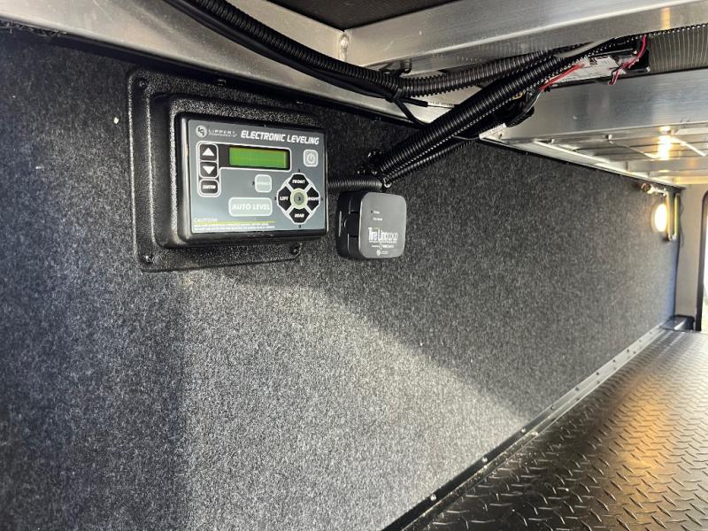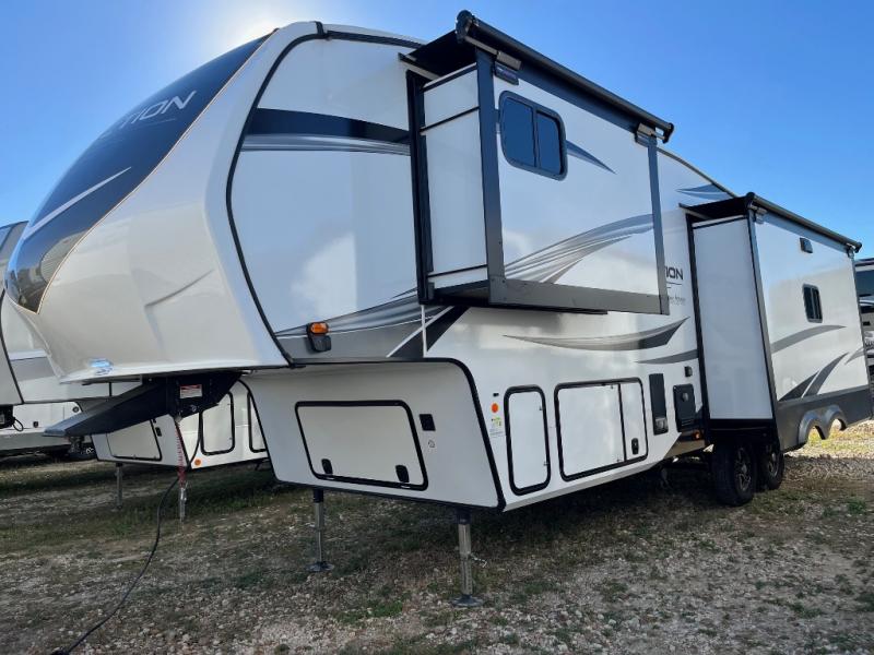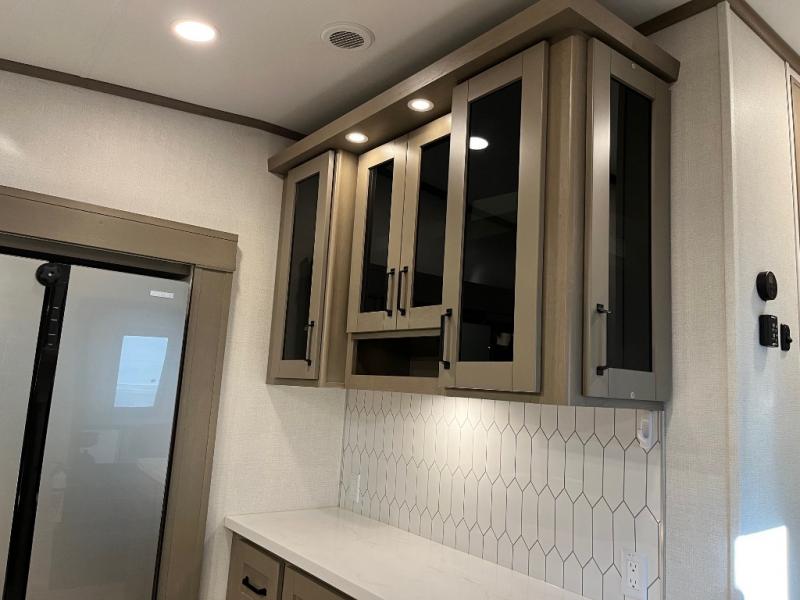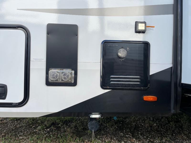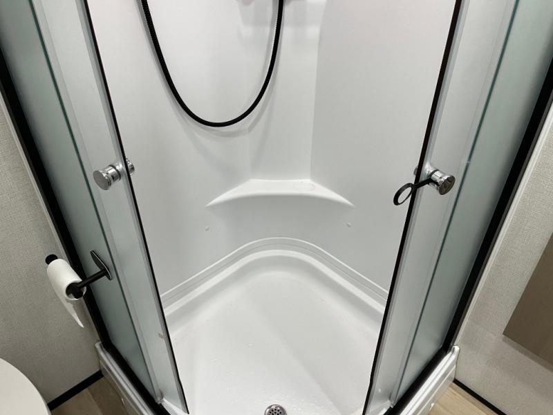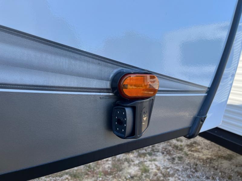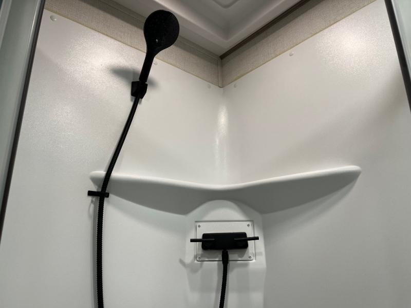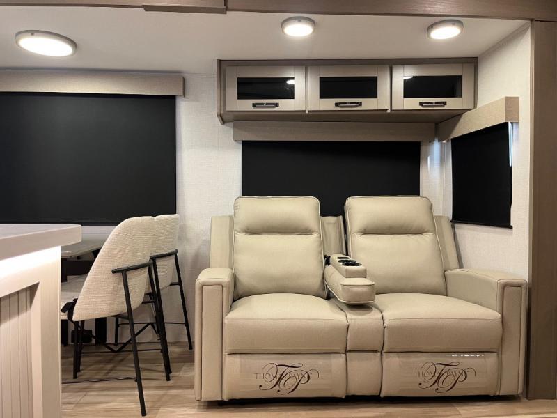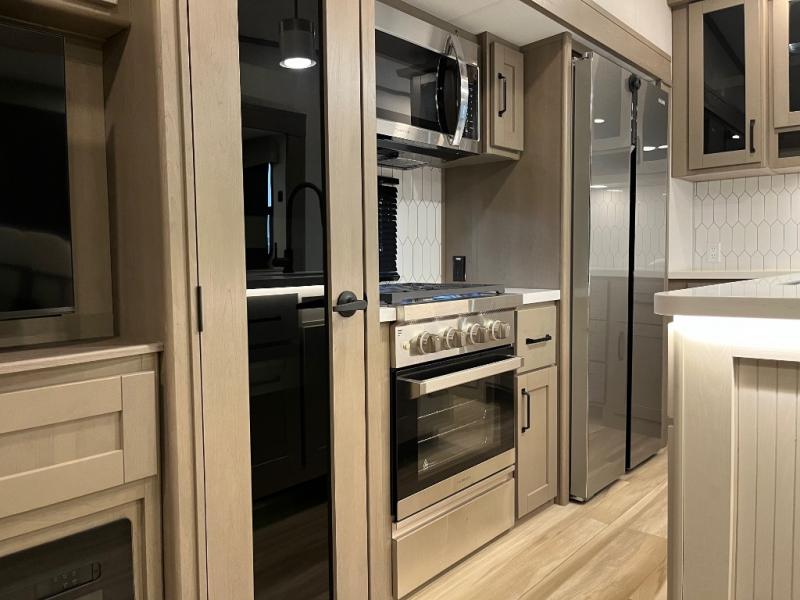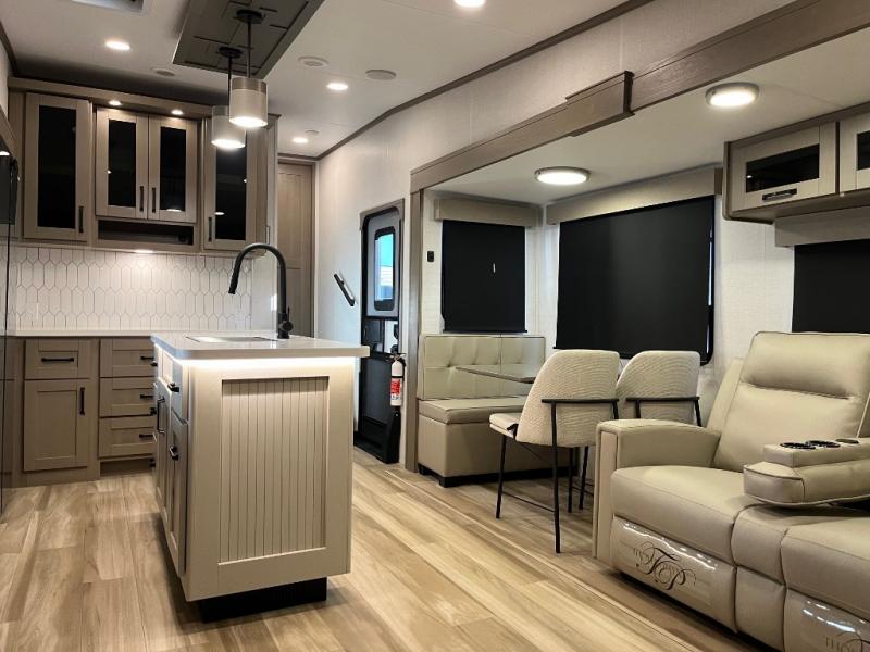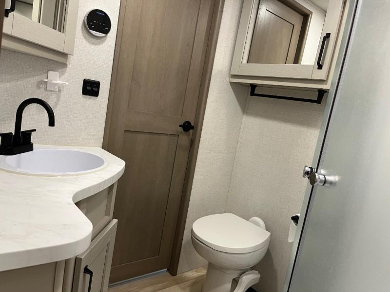 Whether you travel for pleasure or work, you will love the spacious main living and kitchen area with a rear tri-fold sofa that doubles as extra sleeping space, and the theater seating directly across from the entertainment center with a 40" LED HDTV and a fireplace below. The kitchen island will make meal prepping and drying the dishes easier and the hutch is the perfect place to place your picture frames, nice dishes, and extra cooking items. There is even a pantry that is big enough to store all of your favorite snacks, dry ingredients and such. Outside you can enjoy two electric awnings that provide protection from the elements as you relax and visit with other RVers, and your camping chairs can easily be stored in the pass-through compartment. The double entry bathroom is convenient especially at night when you can slide the door to enter from the front master bedroom. You will find plenty of storage for your clothing and gear, plus the bedroom slide out gives you drawers and linen storage that stretches into the full bathroom.
