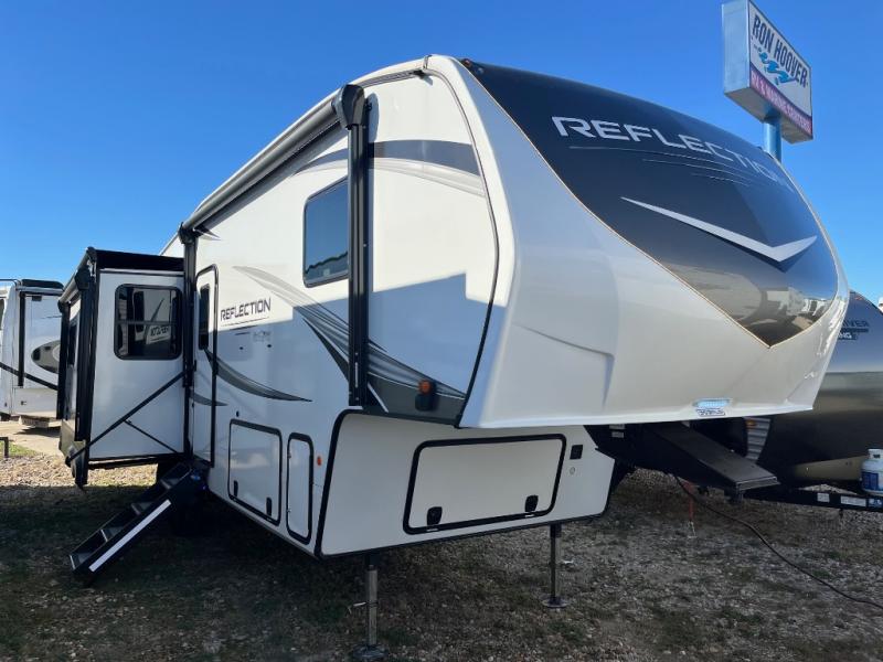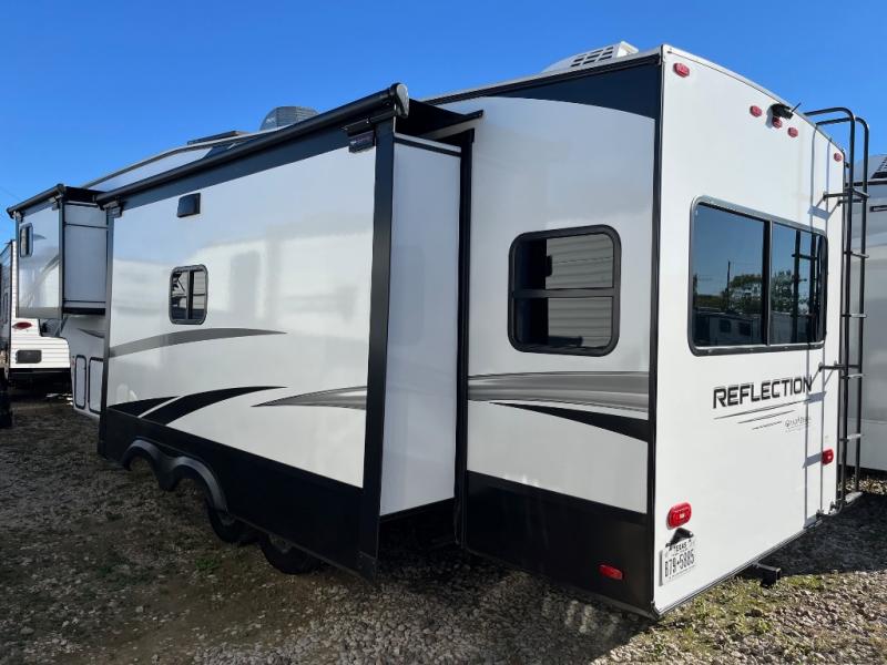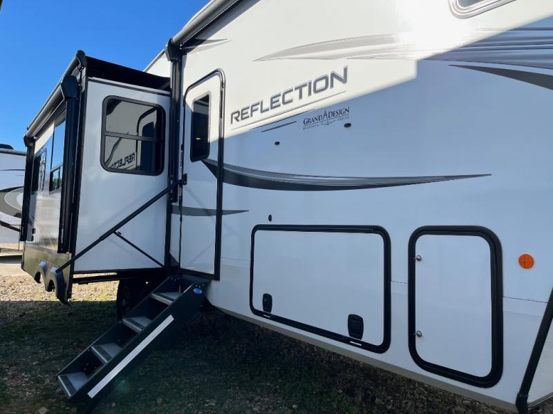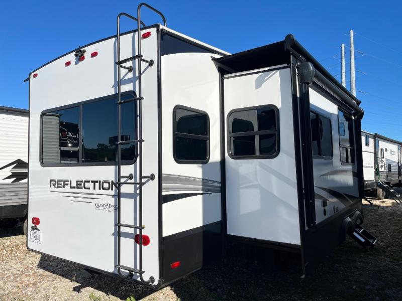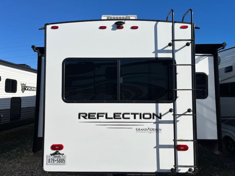 With any Reflection fifth wheel by Grand Design, you will have a solar panel for off-grid camping and a 60 amp charge controller and inverter prep, a Universal All-In-One docking station, unobstructed pass-through storage, and Goodyear Endurance tires. Each is constructed of gel coat exterior sidewalls, residential 5" truss rafters, walk-on roof decking, a fiberglass and radiant foil roof and front cap insulation plus laminated aluminum framed side walls, roof and end walls in slide rooms. Head inside to enjoy residential hardwood cabinet doors, premium Congoleum flooring, a spacious shower with a glass door, and many more comforts!