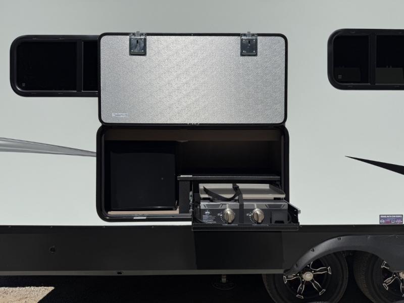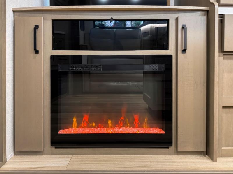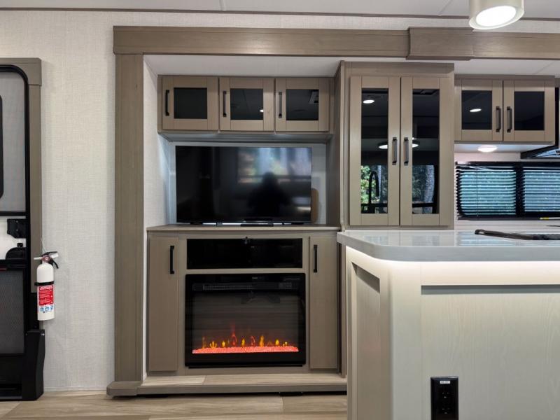 Enjoy a home away from home with this travel trailer! The chef will enjoy cooking either indoors in the rear kitchen with the kitchen island, hutch, and three burner cooktop, or outdoors with the outside griddle and outside 1.6 cu. ft. refrigerator to drink a cold beverage while grilling burgers. If mother nature rains on your parade then you can head indoors and either play games at the booth dinette or relax on the theater seating across from the entertainment center with a 40" TV and fireplace. Rinse the sand out of your hair in the full bathroom with the 30" x 36" shower then head to the front private bedroom and lay down on the queen bed slide which can be replace for an optional king bed.