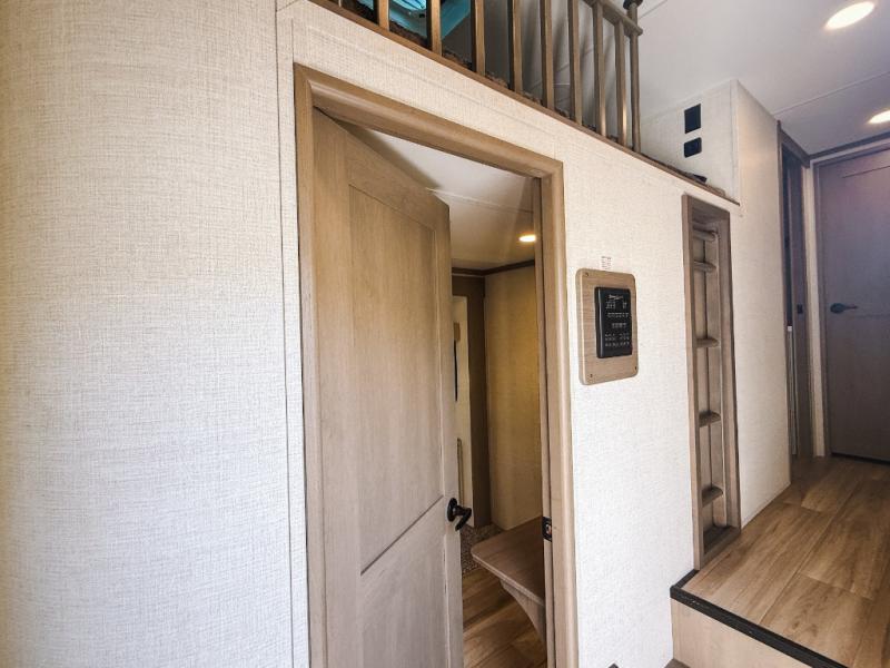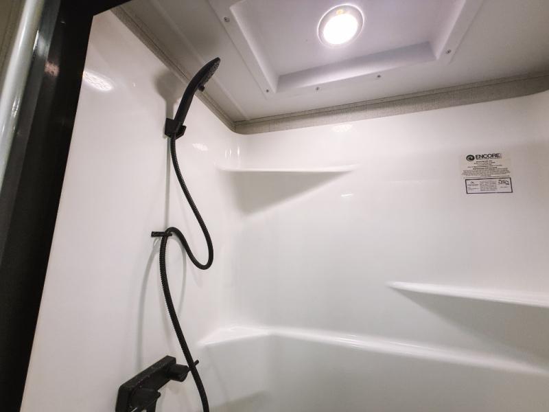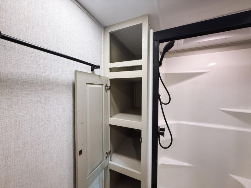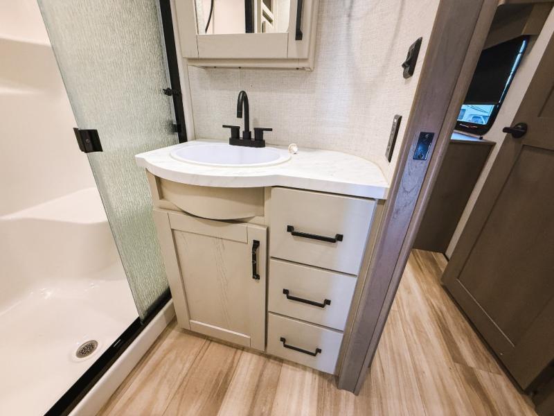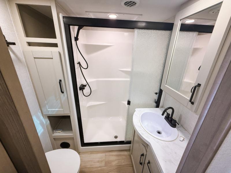 The full bath features a roomy shower, spacious vanity, and smart storage, so you have all the conveniences you enjoy at home — now on the road.
