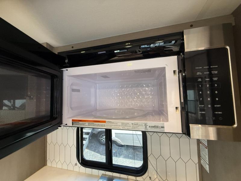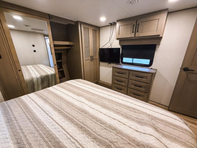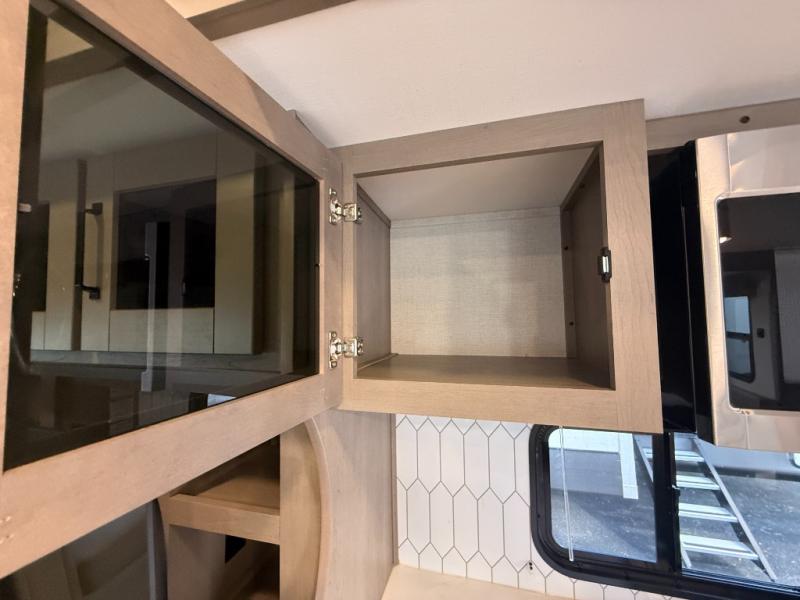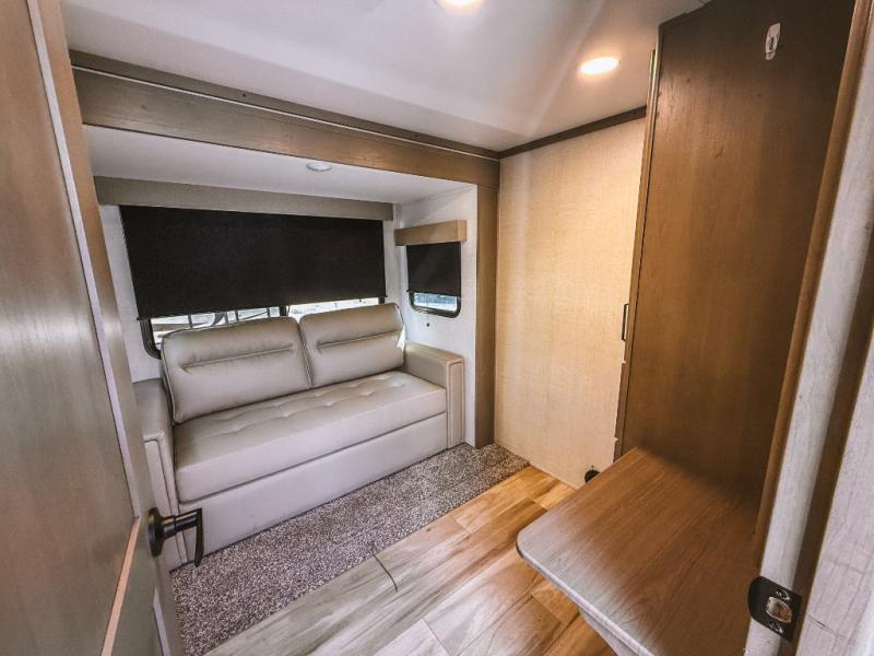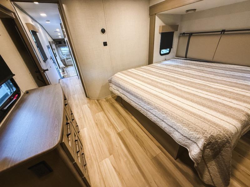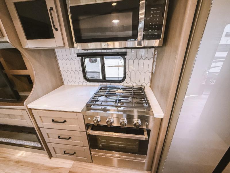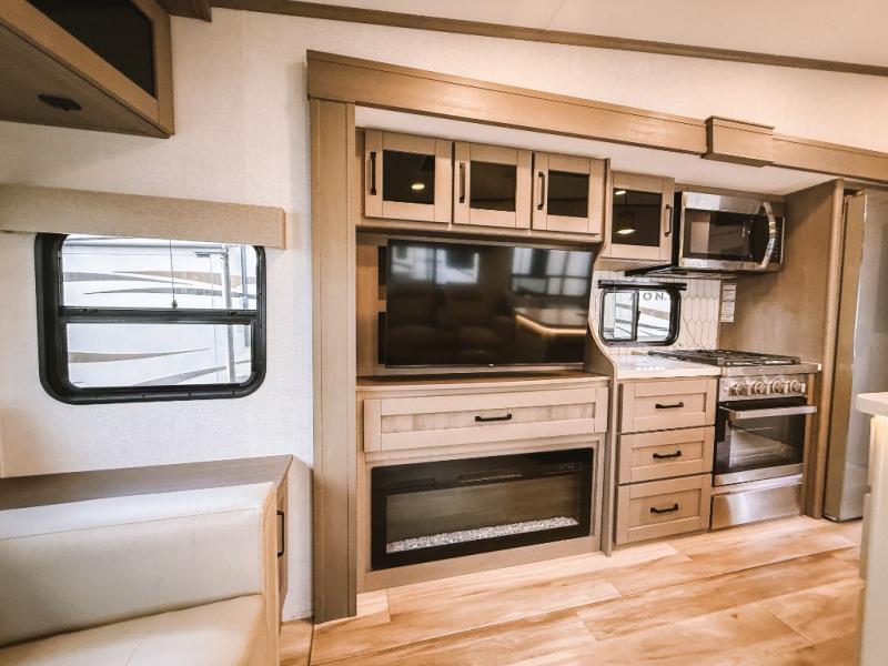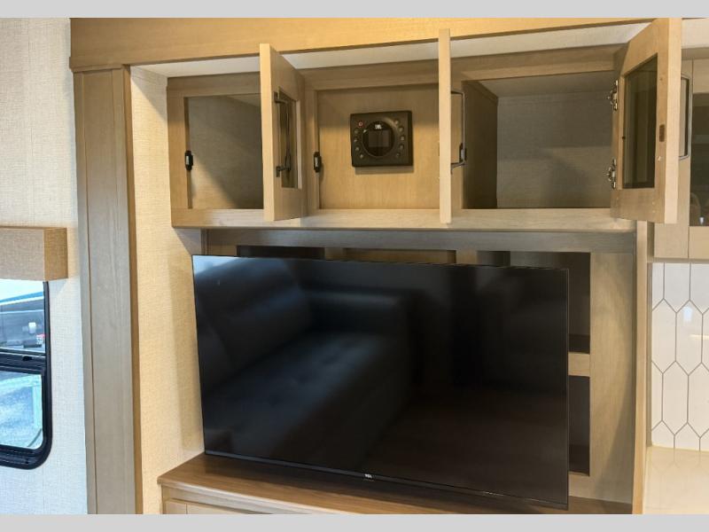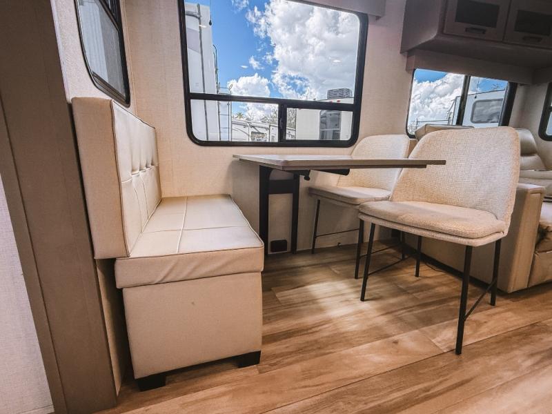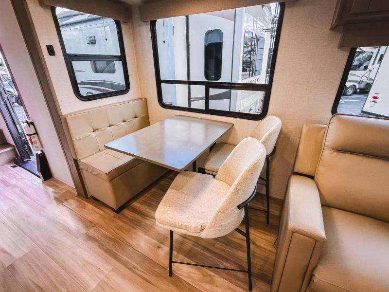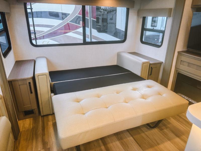 Step inside and you’ll immediately notice how open and comfortable the living space feels. The slide-out expands the interior, creating generous room for seating and movement. Large panoramic windows bring in natural light and stunning views, making this area a great place to relax, entertain, and make memories.