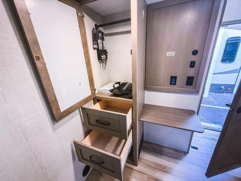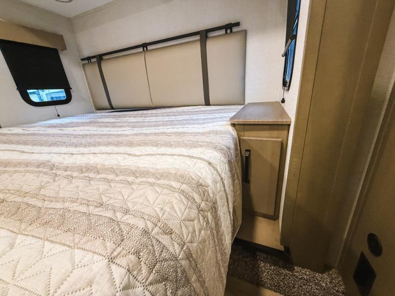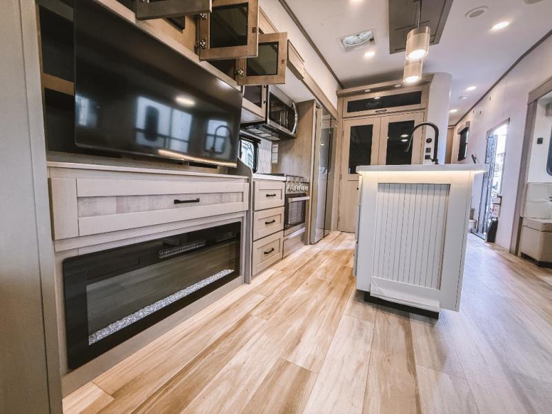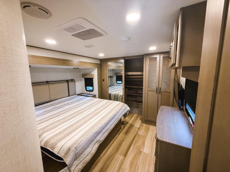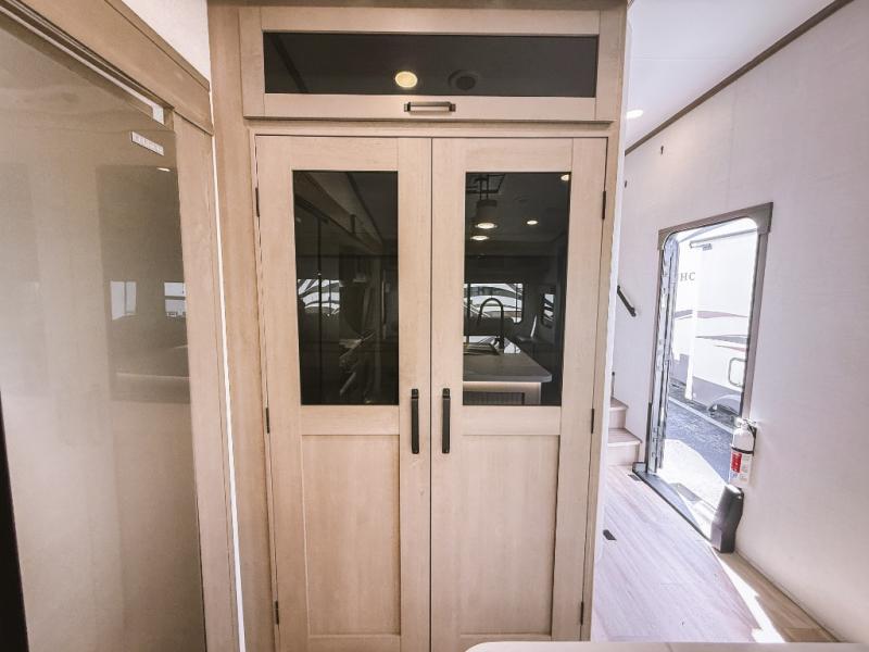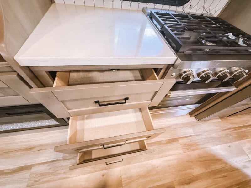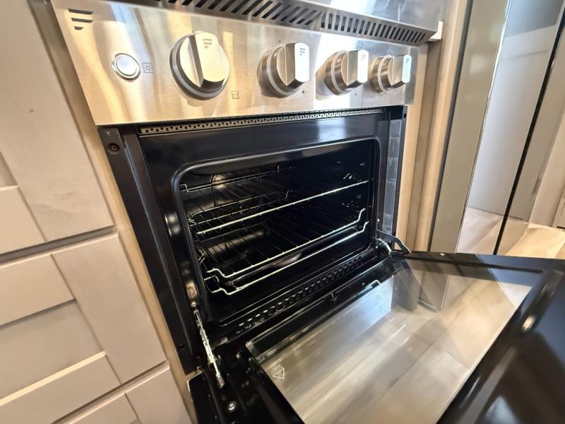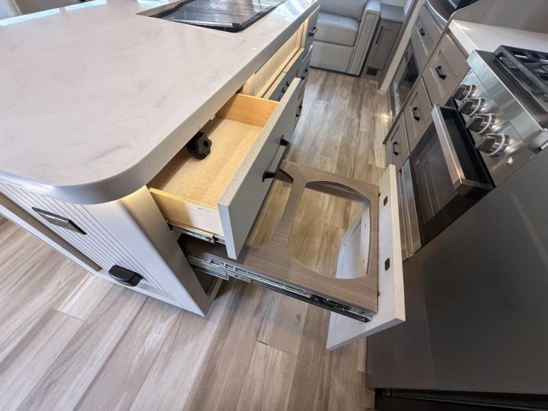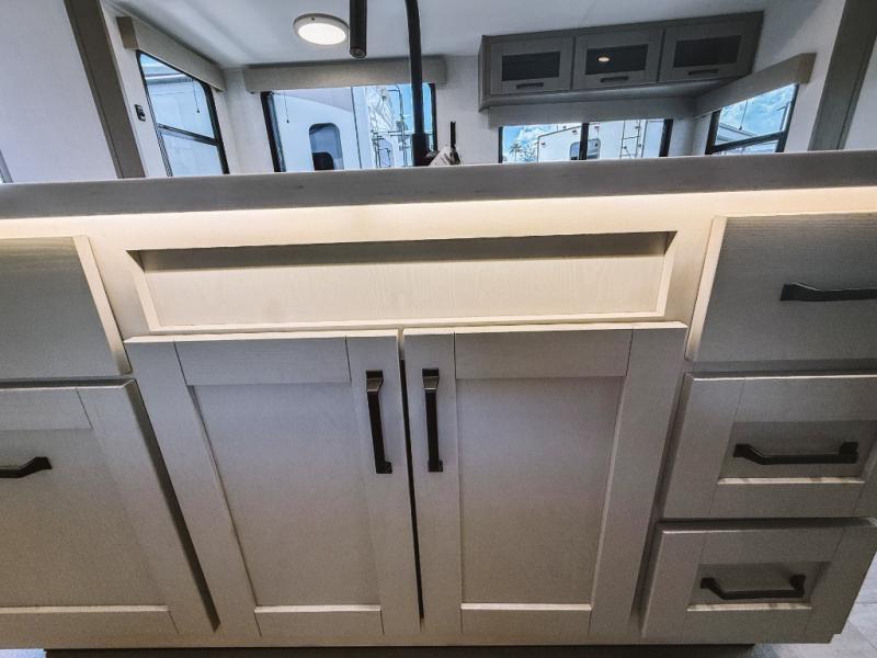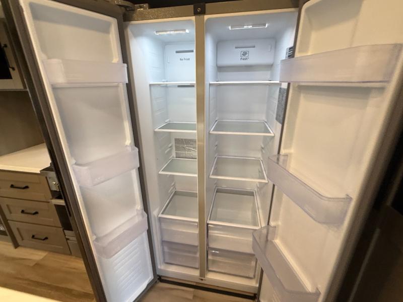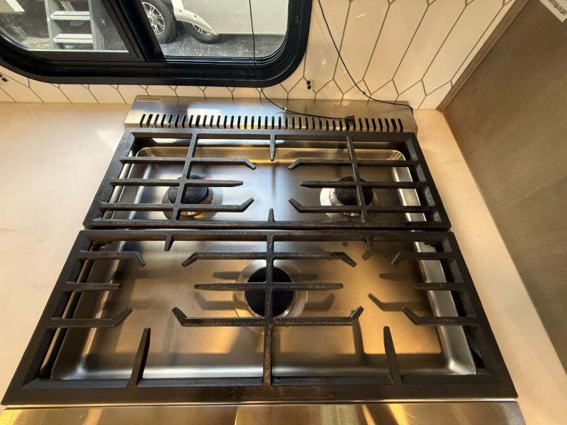 Step inside and you’ll immediately notice how open and comfortable the living space feels. The slide-out expands the interior, creating generous room for seating and movement. Large panoramic windows bring in natural light and stunning views, making this area a great place to relax, entertain, and make memories.