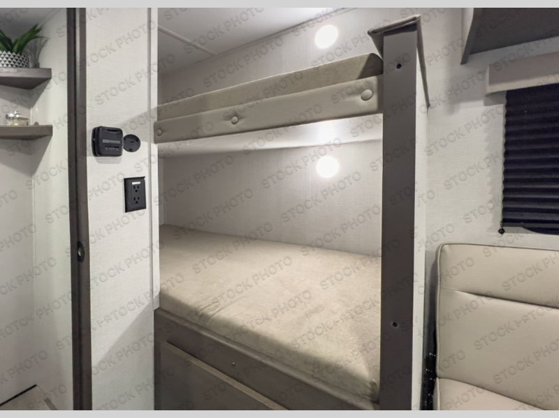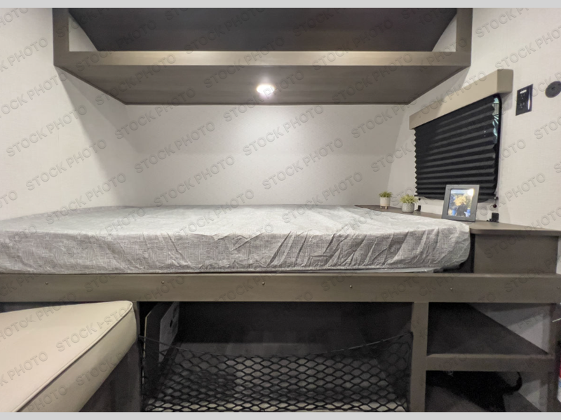 Camping trips to the lake have never been easier than with this travel trailer! The 28" x 67" bunks are right next to the private bath for easy nighttime use, and the front queen bed includes hidden storage for your things. There is also a 66" Jack knife sofa that provides a little more sleeping space for guests. A full kitchen lets you cook meals each day and there is an exterior LP quick connect if you want to fire up your own propane grill.