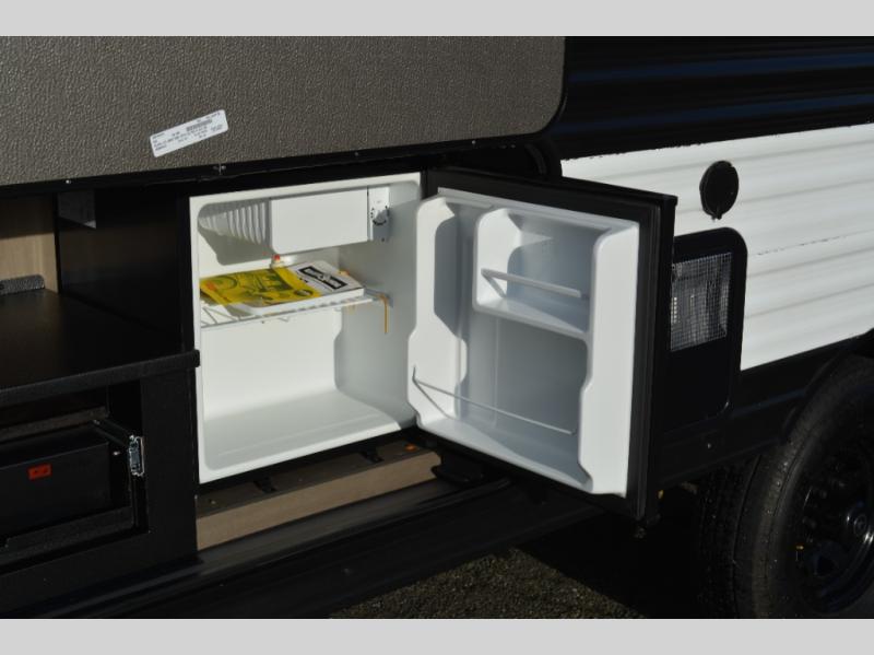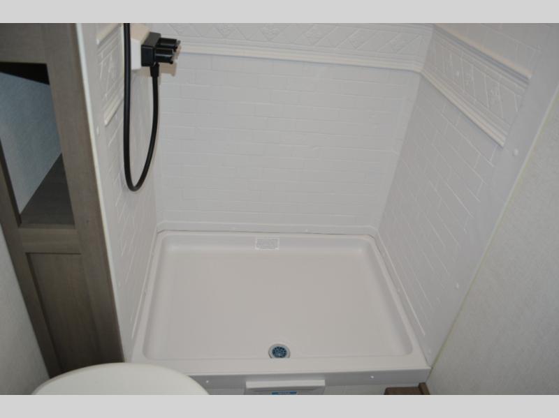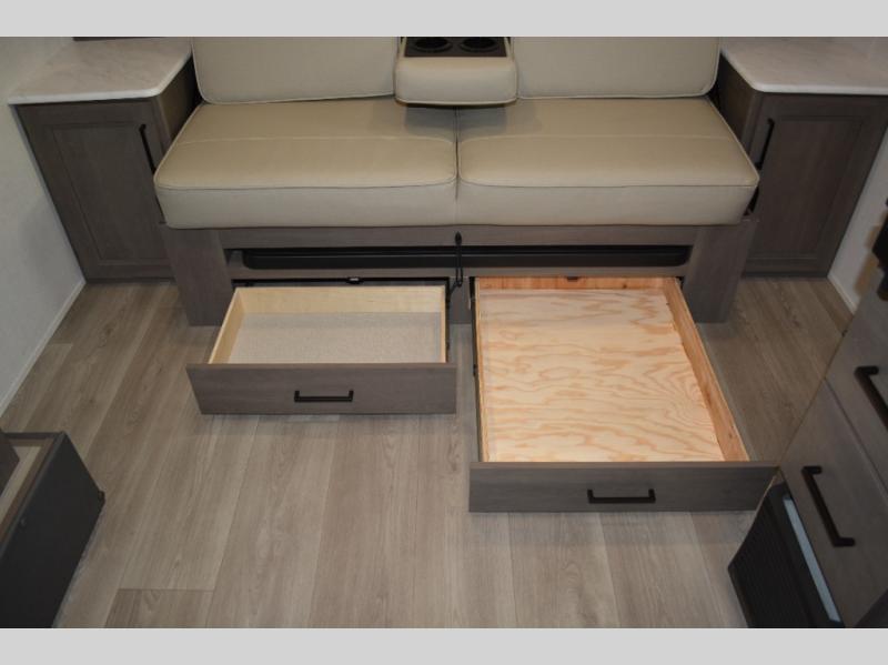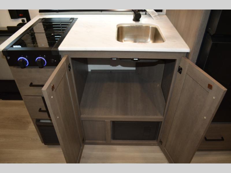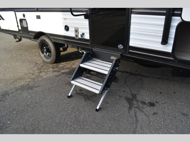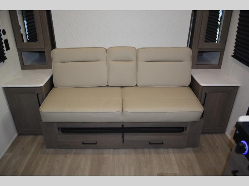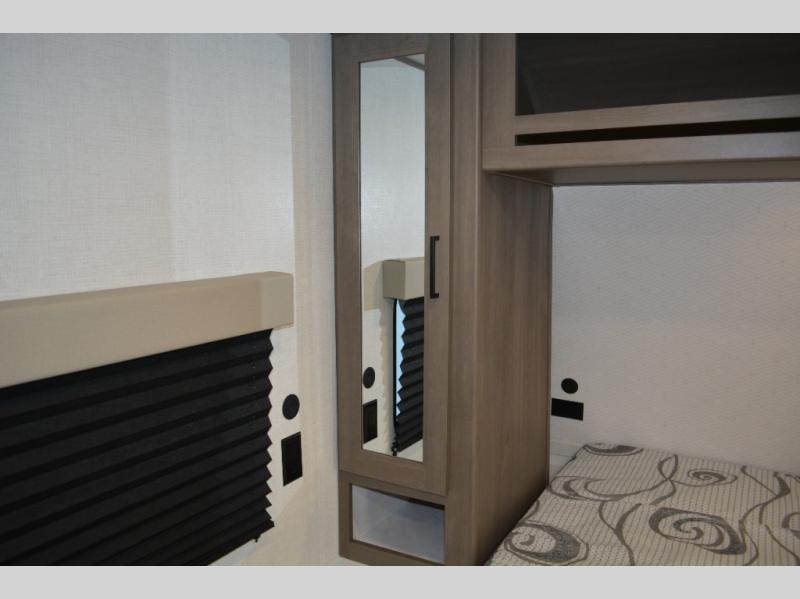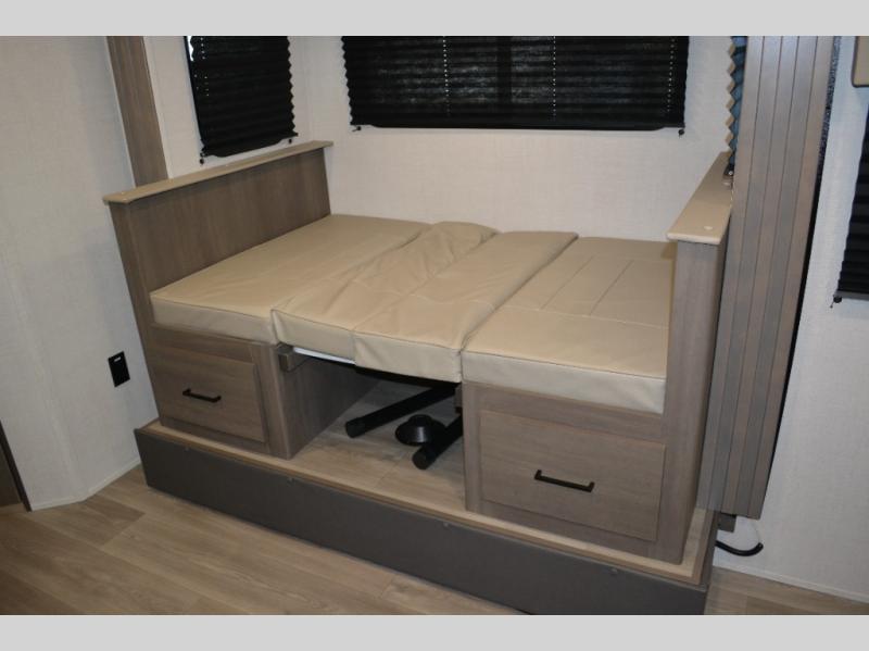 Spacious and versatile, this travel trailer is perfect for weekend trips to the campground or weeklong visits to the lake! There is a front Murphy bed with storage on both sides plus a pull-out pet drawer to keep your furry friends happy. Your guests or little ones will love the double-size bunks with privacy curtains, and the full bath is right next to the bunks for easy nighttime use. Once you make breakfast on the two burner range, you can dine at the booth dinette slide. And this model also includes an outdoor griddle and refrigerator if you want to make breakfast outdoors. Additional exterior features include a 16' power awning, an interior/exterior table, and a pass-thru storage for larger camp gear.
