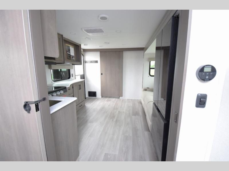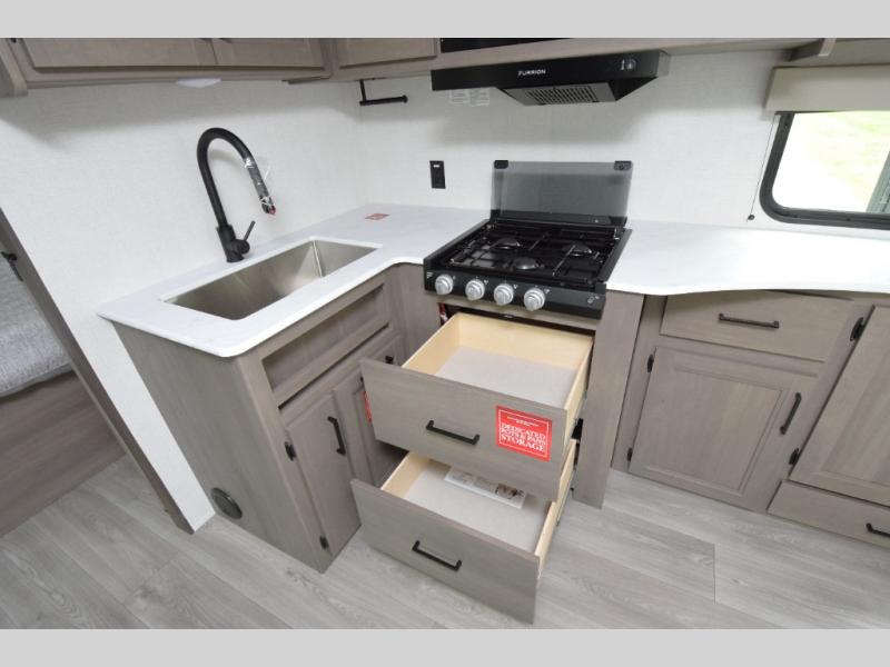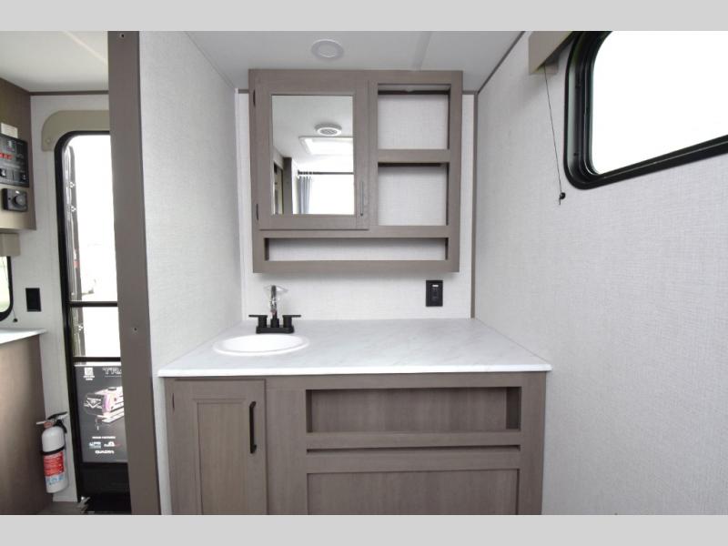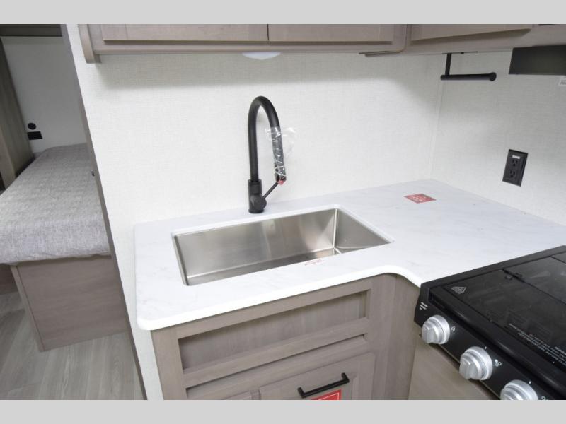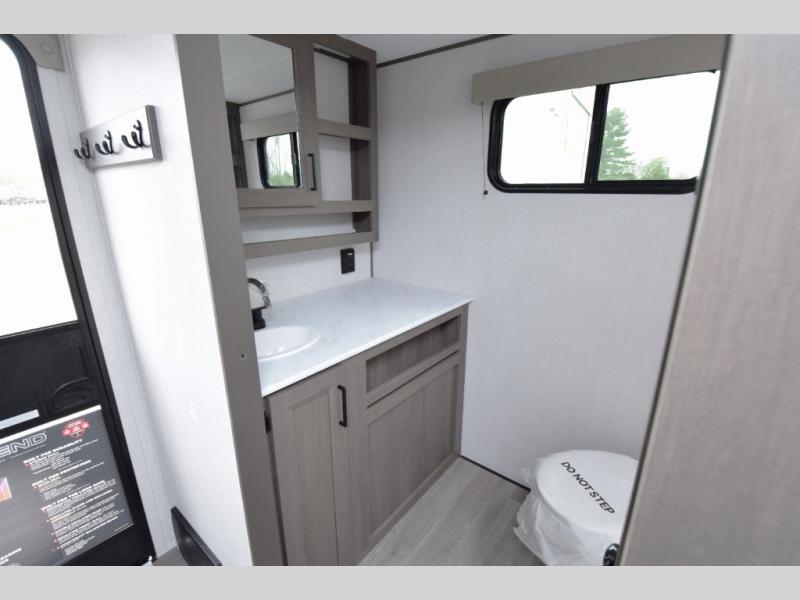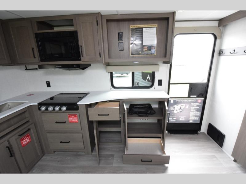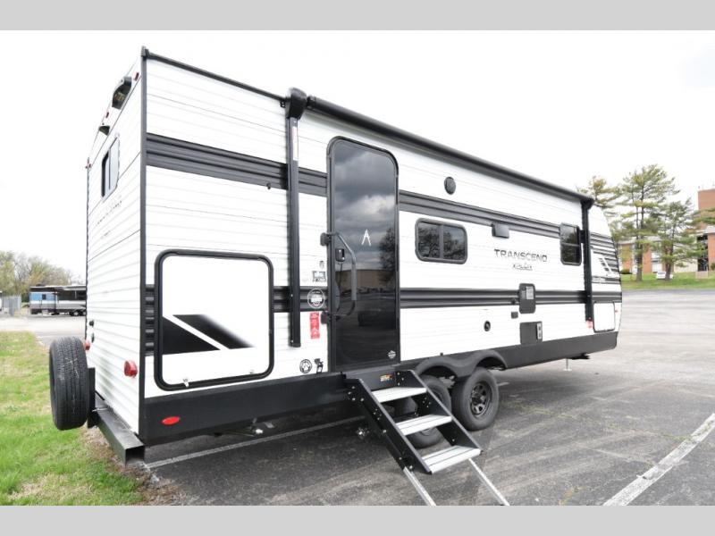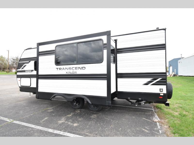 The Transcend Xplor 22RBX is designed for effortless camping with a power tongue jack, all-in-one utility center, and detachable power cord with LED light for easy setup. Inside, upgraded residential furniture, residential countertops, and cabinet doors make you feel at home on the road.