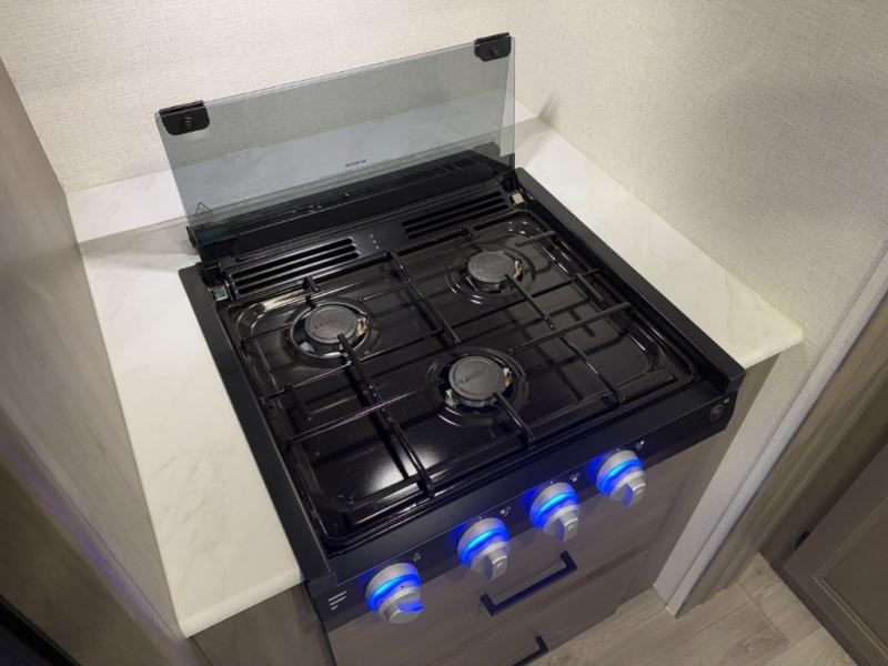 - Indoor kitchen with 3-burner cooktop and overhead cabinets