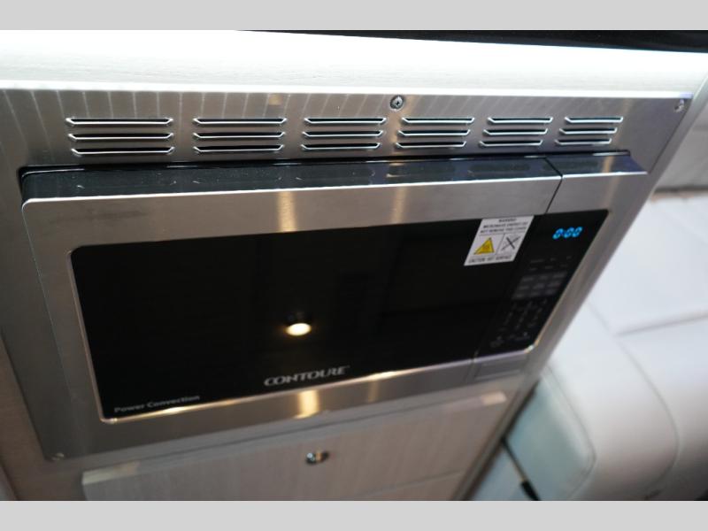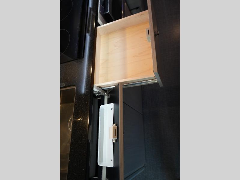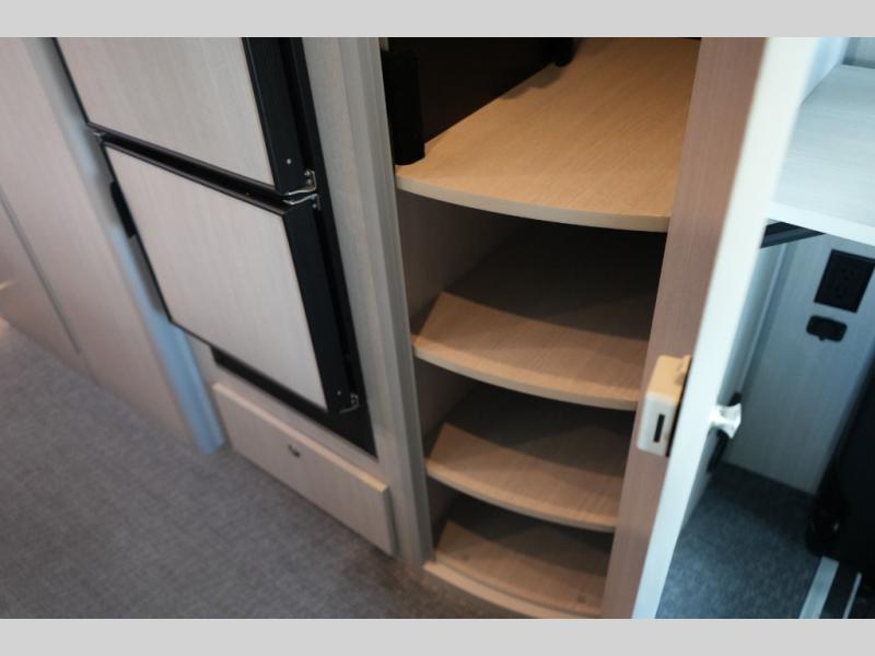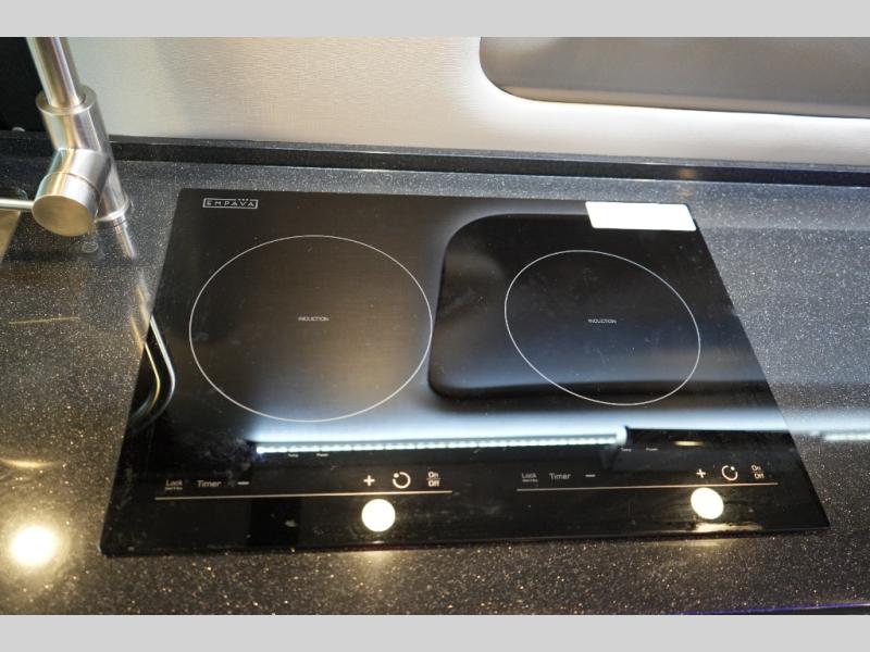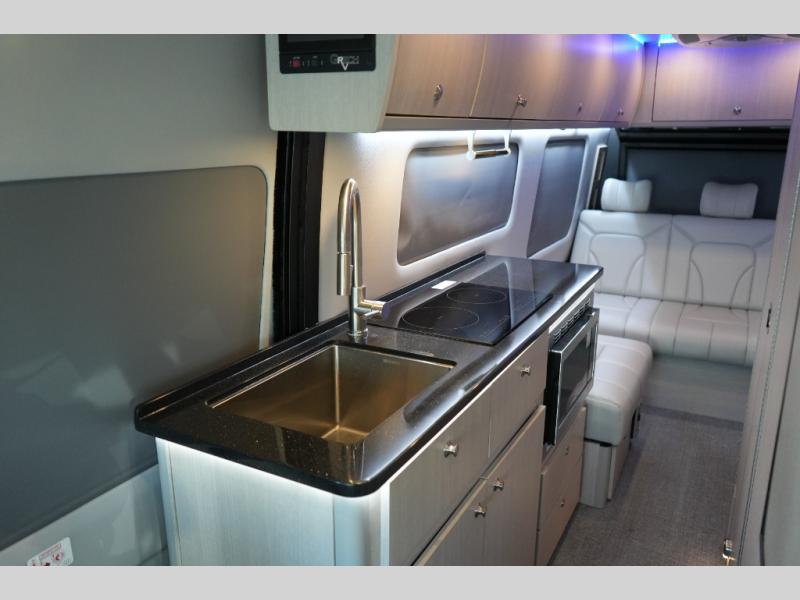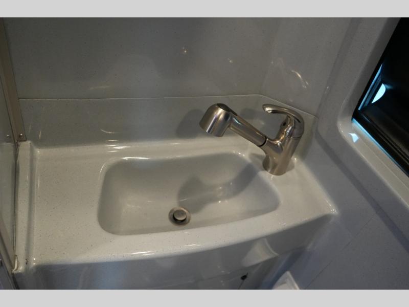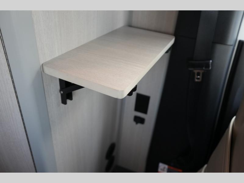 Step inside to find a thoughtfully designed interior where every detail enhances comfort. The power sofa bed converts easily for restful nights, while two captain’s chairs swivel to create additional seating when parked. Enjoy the private wet bath with a window and privacy shade, and take advantage of adjacent storage for clothing and essentials. Meals are a pleasure with the galley kitchen, featuring a farmhouse-style sink, combo microwave/convection/air fryer, and a two-burner induction cooktop. A table with a mount system adds dining or work space wherever you park.