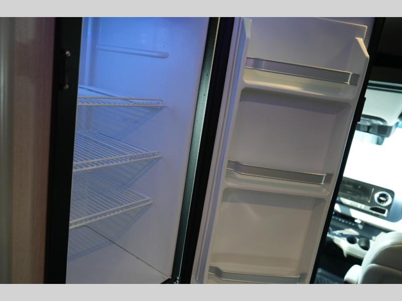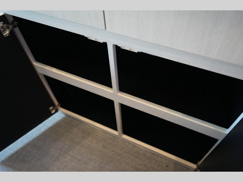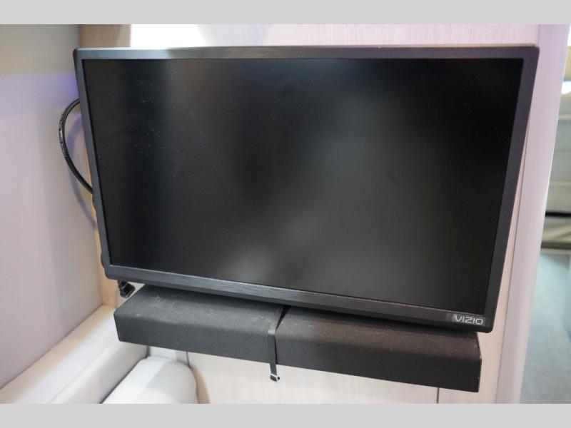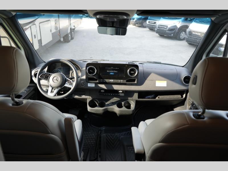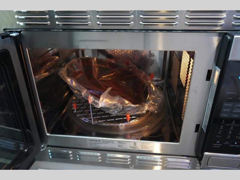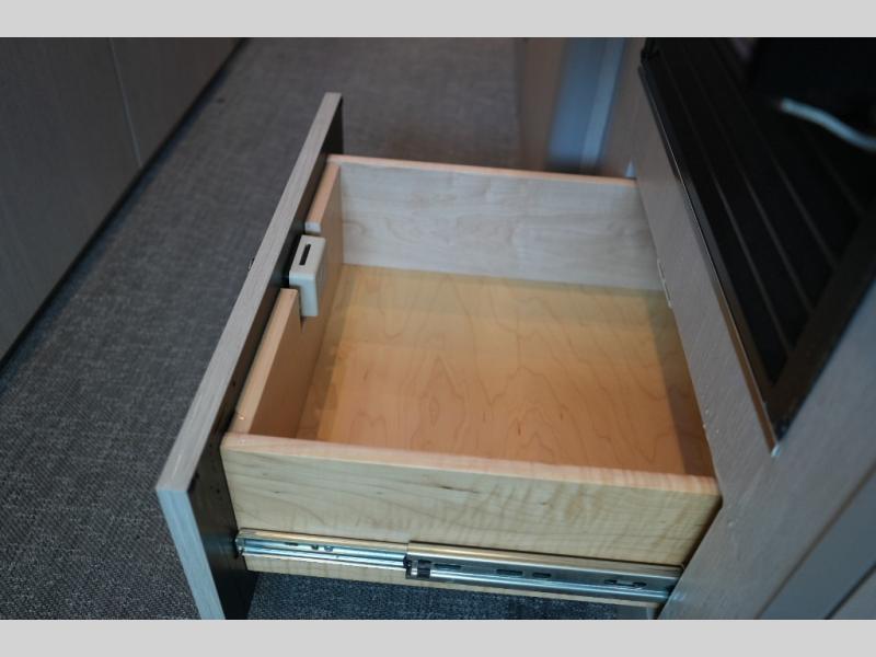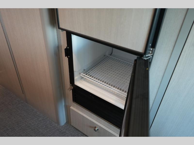 Step inside to find a thoughtfully designed interior where every detail enhances comfort. The power sofa bed converts easily for restful nights, while two captain’s chairs swivel to create additional seating when parked. Enjoy the private wet bath with a window and privacy shade, and take advantage of adjacent storage for clothing and essentials. Meals are a pleasure with the galley kitchen, featuring a farmhouse-style sink, combo microwave/convection/air fryer, and a two-burner induction cooktop. A table with a mount system adds dining or work space wherever you park.