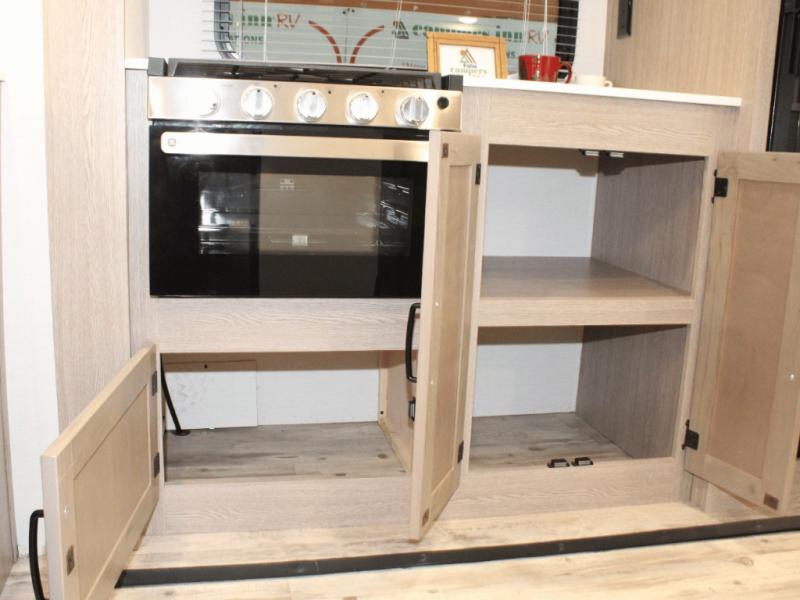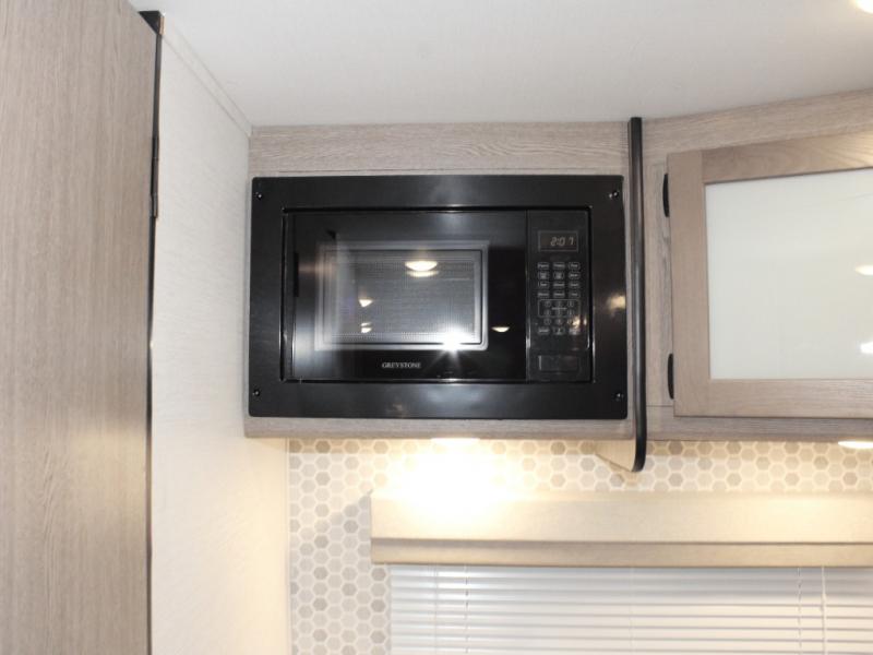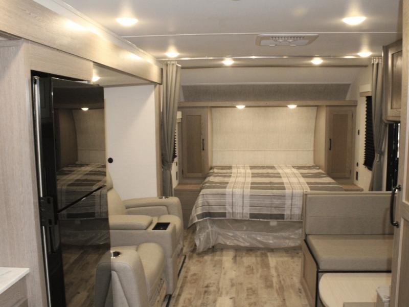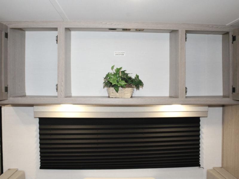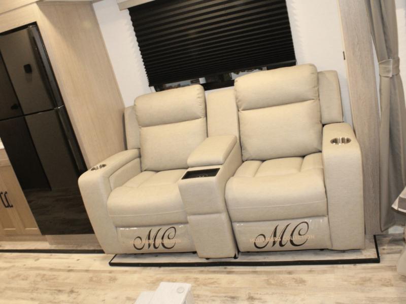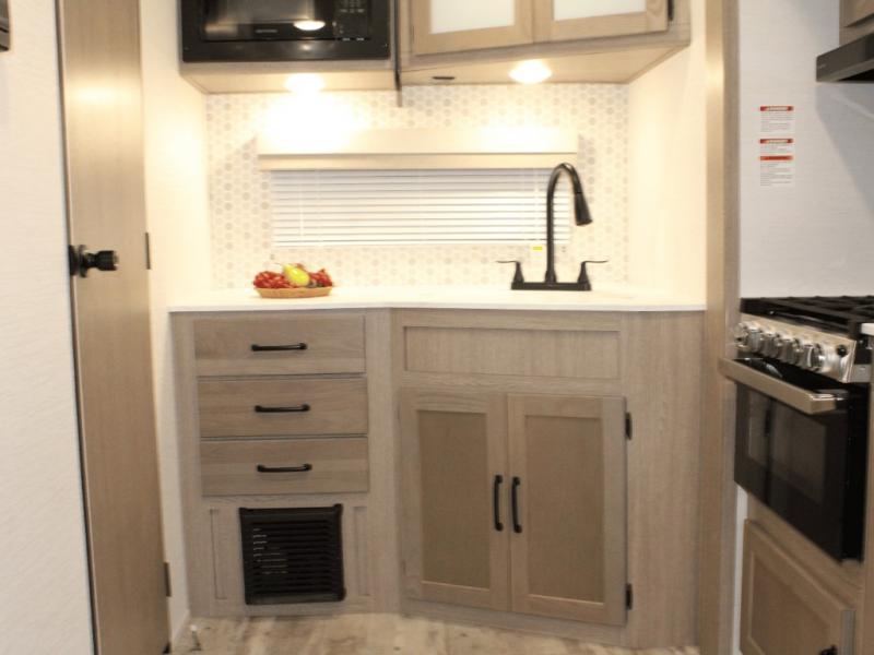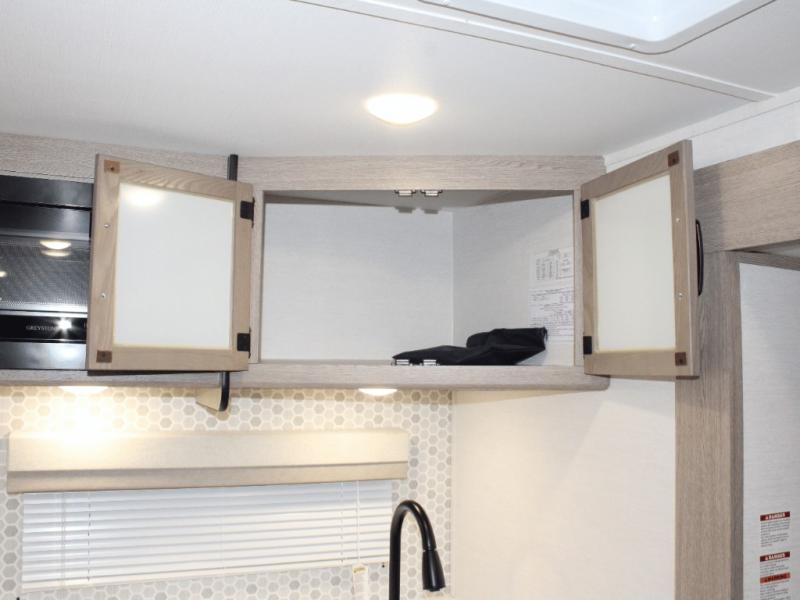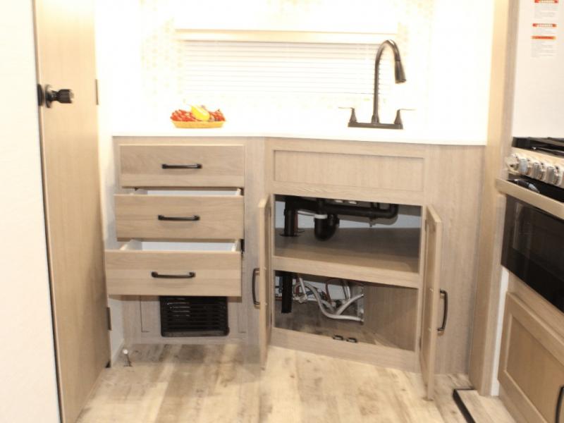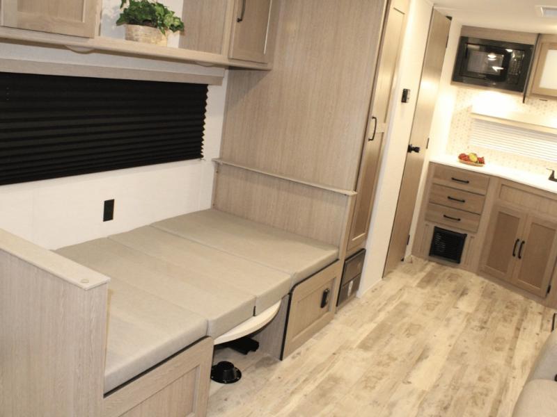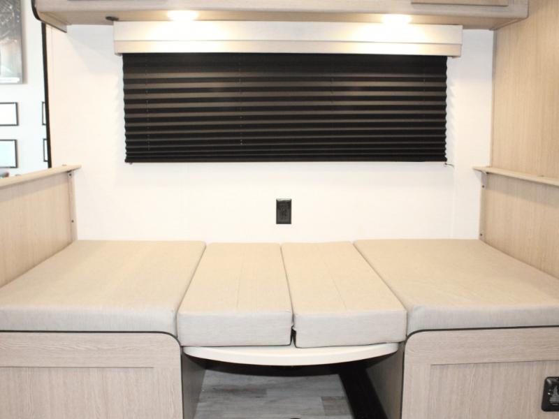 Enjoy modern amenities such as a 13,500 BTU A/C, tankless water heater, central control panel, and multiple USB ports for all your devices. Inside, the warm atmosphere is enhanced by radiant LED lighting, designer kitchen backsplash, pleated privacy shades, and craft-made cabinetry, creating a stylish yet comfortable living space.