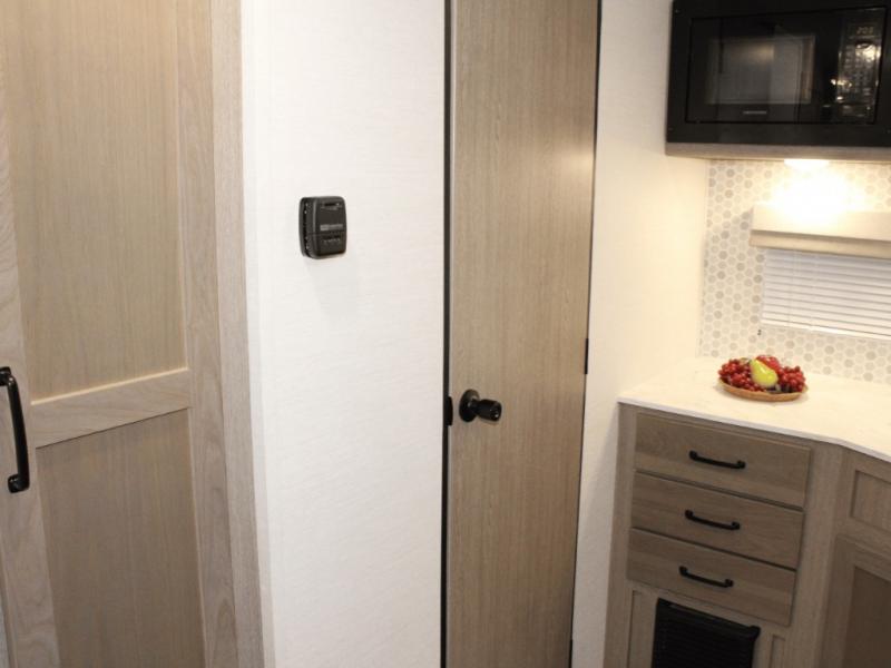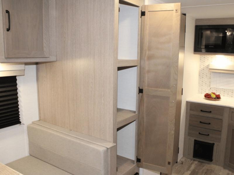 The kitchen is designed for easy, enjoyable meal prep, complete with a refrigerator, three-burner cooktop, microwave, and sink. After cooking, enjoy your meals at the 38" dinette, where you can also watch your favorite shows on the nearby TV. Storage won’t be an issue with pass-thru storage, overhead cabinets, a pantry, and linen closet all included to keep your essentials organized and accessible. The full bathroom features a skylight above the shower, adding a touch of natural light and making it a relaxing space to refresh after your adventures.
