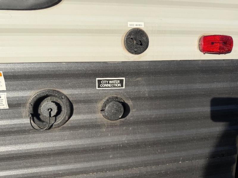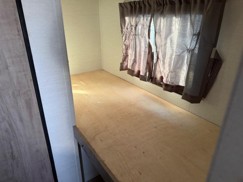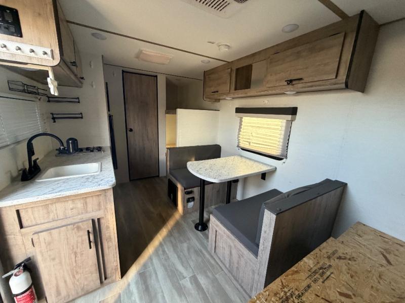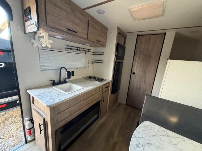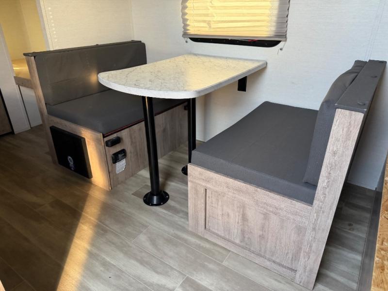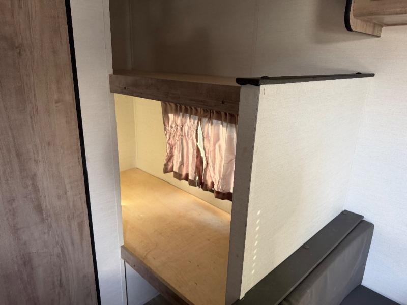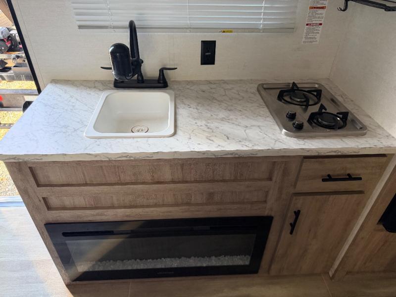 It's easier than ever to enjoy the camping lifestyle with this lightweight travel trailer. There are bunk beds for your guests or little ones, a front bed for you, plus a booth dinette that can double as dining and sleeping space. The private toilet and shower will allow you to stay clean throughout each trip, and since the sink is at the kitchen counter, someone can brush their teeth while the other showers before bed. You will love the fireplace included in this model for a more at-home feel, or you just might find yourselves outdoors under the power awning most of the day!