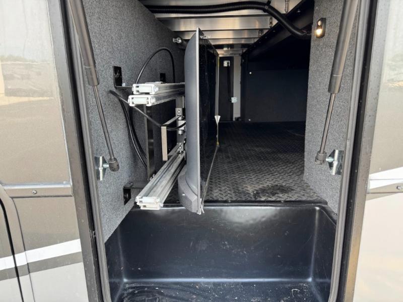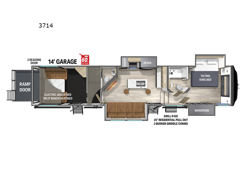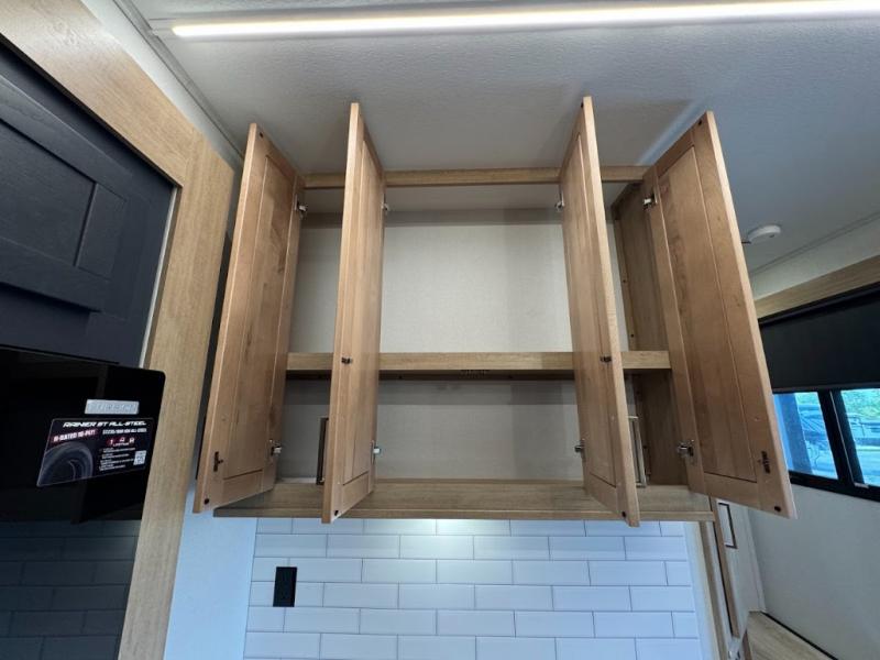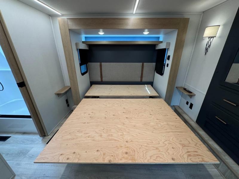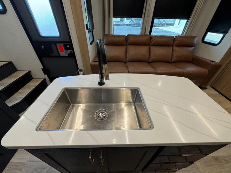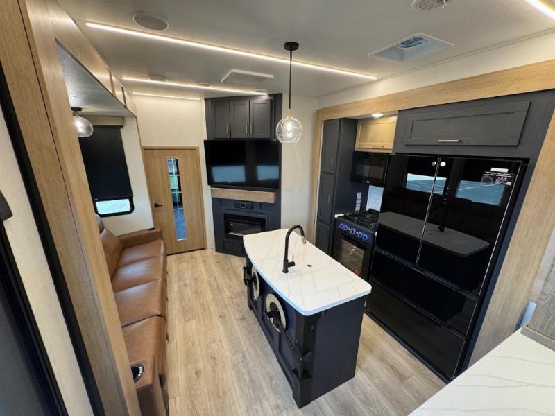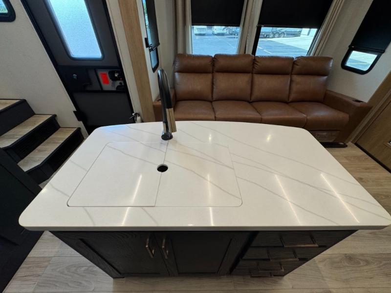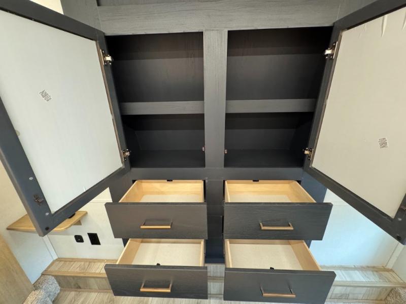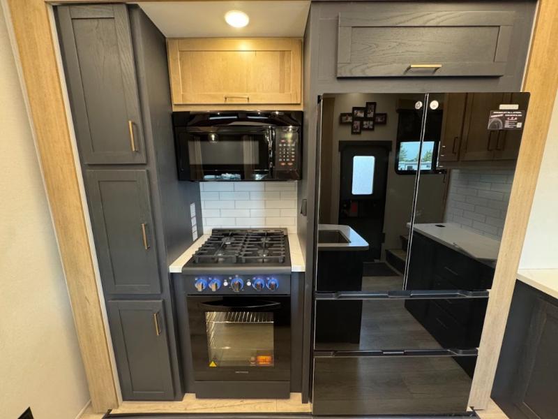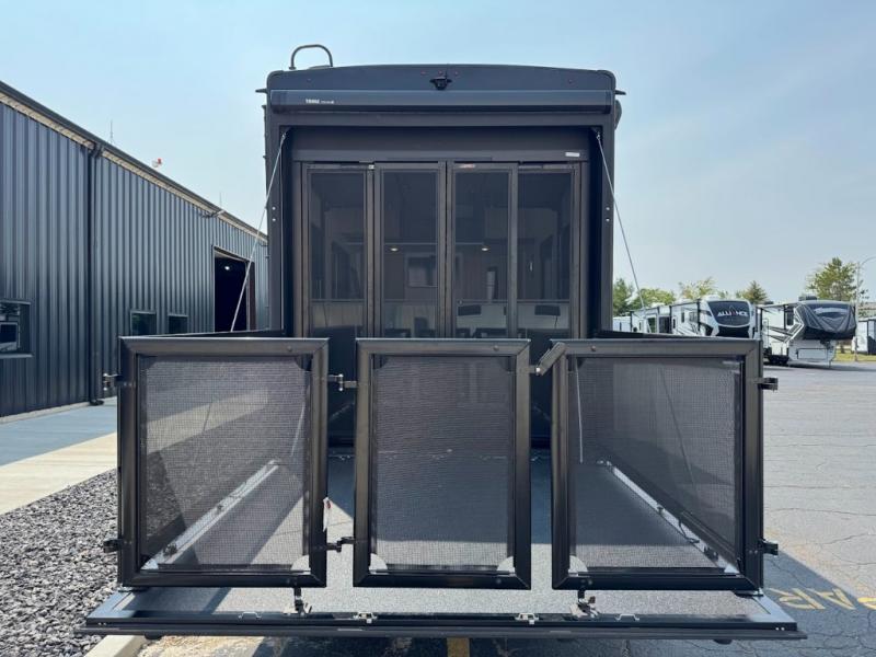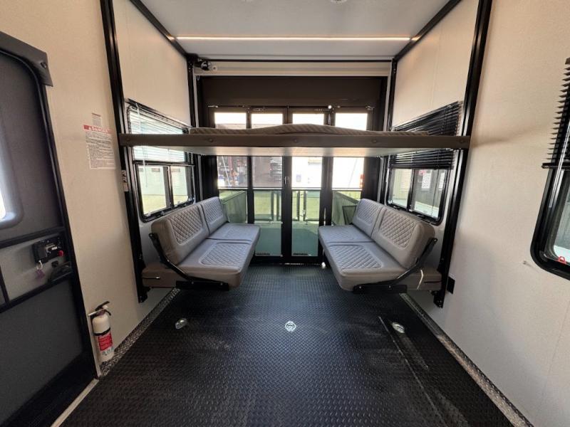 Trips to the lake or woods are made complete in this four slide out toy hauler. You can comfortably sleep eight people each night between the East to West tilting king bed, the electric queen bed with a bed underneath, plus the large sofa in the main living area. There is even a loft for the littles ones or you can use this space for storage! Having a bath and a half on board is sure to come in handy, along with dual entry doors and tons of storage space. This Cyclone kitchen is packed with everything you need while you're away from home, including a massive 24" stand alone oven, a hutch and a pantry for food storage, plus a kitchen island with swing out stools.