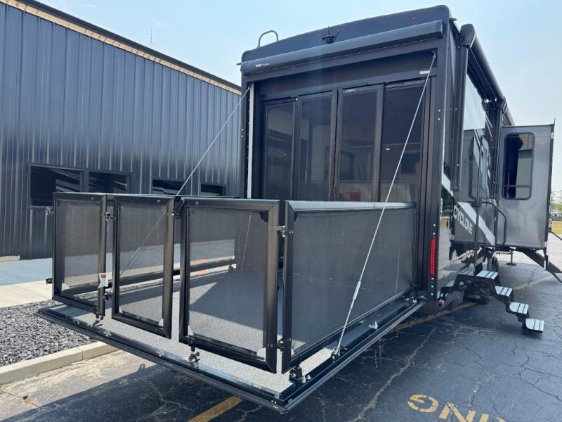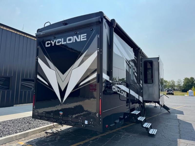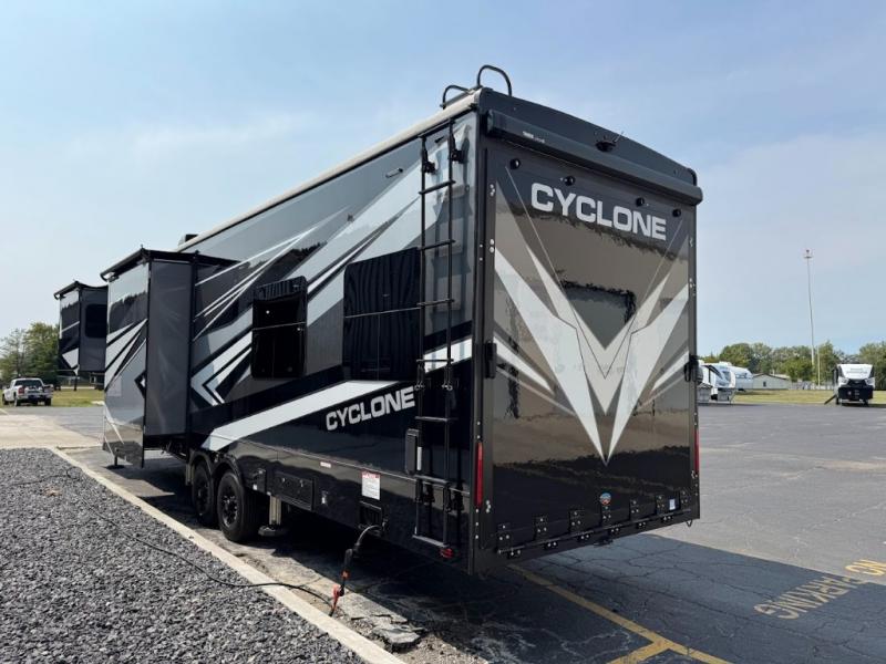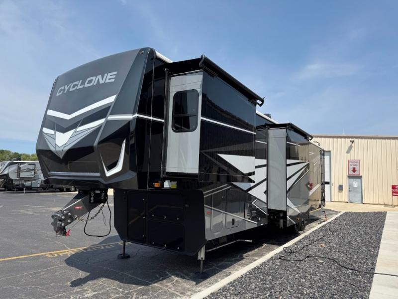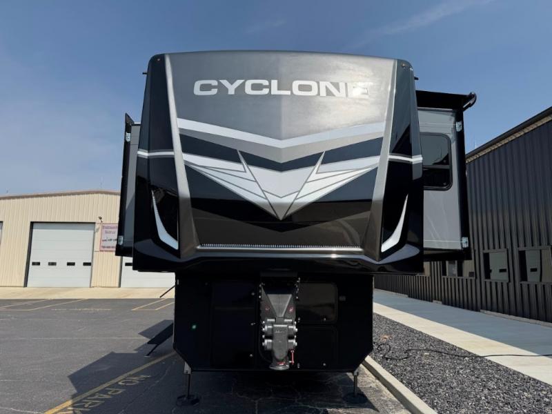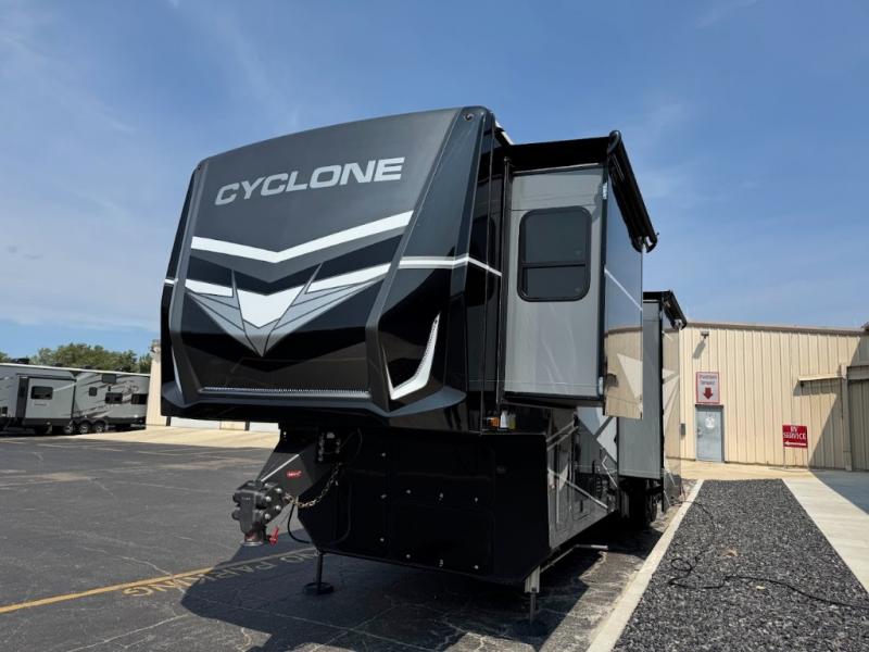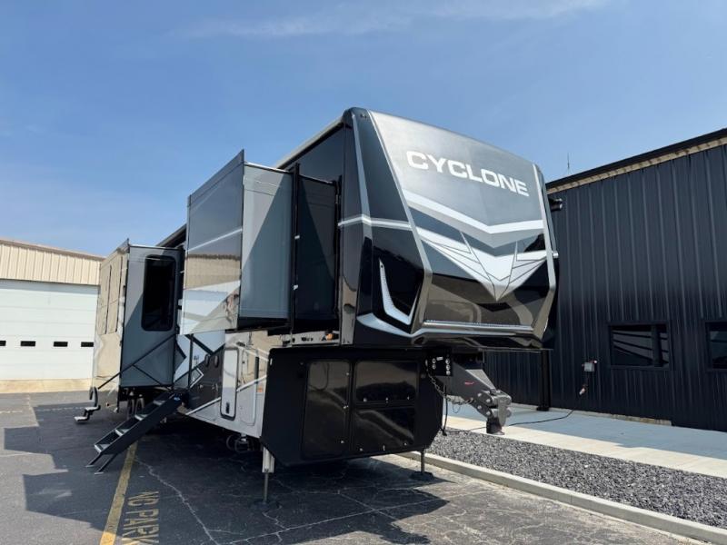 Satisfy your wanderlust with a Heartland Cyclone fifth wheel toy hauler! You won't have to sacrifice any luxury either with indulgent features like the king bedroom suite with an exclusive East to West bed tilt system with 30% more floor space, Stor-Mor three-sided access to the basement with 30% more storage capacity, and Step Caddy folding patio step for better stability as you enter or exit the patio. The industry first Grill and Go 25" residential pull out three burner griddle combo comes on models with an exterior kitchen for an easier cooking experience. The residential furniture gives you a high-quality experience on the road. If you like to dry camp longer then you will appreciate the industry's largest 150 gallons fresh water tanks. Come find the perfect model for you today!