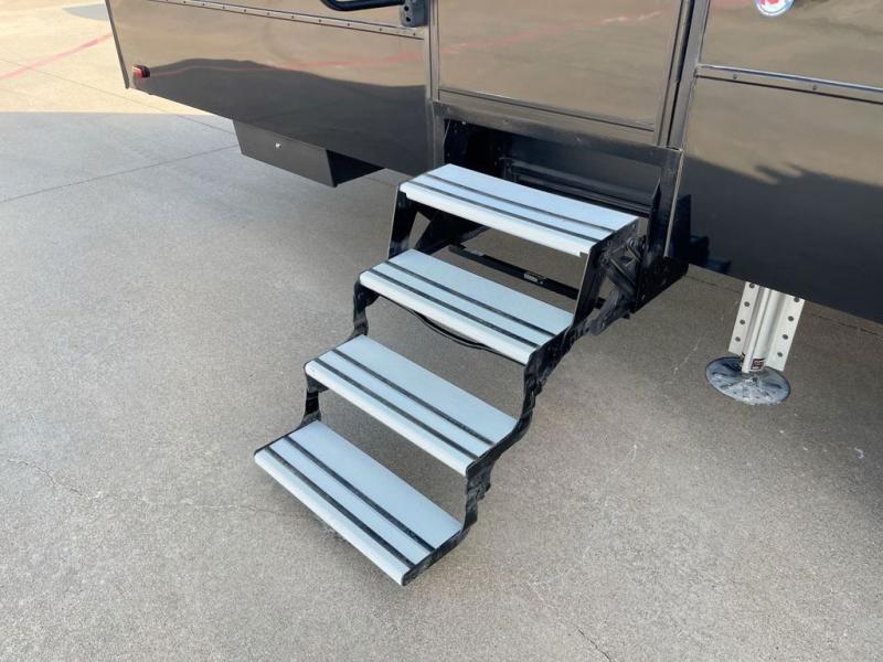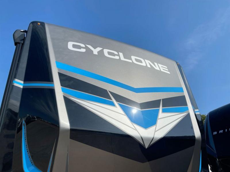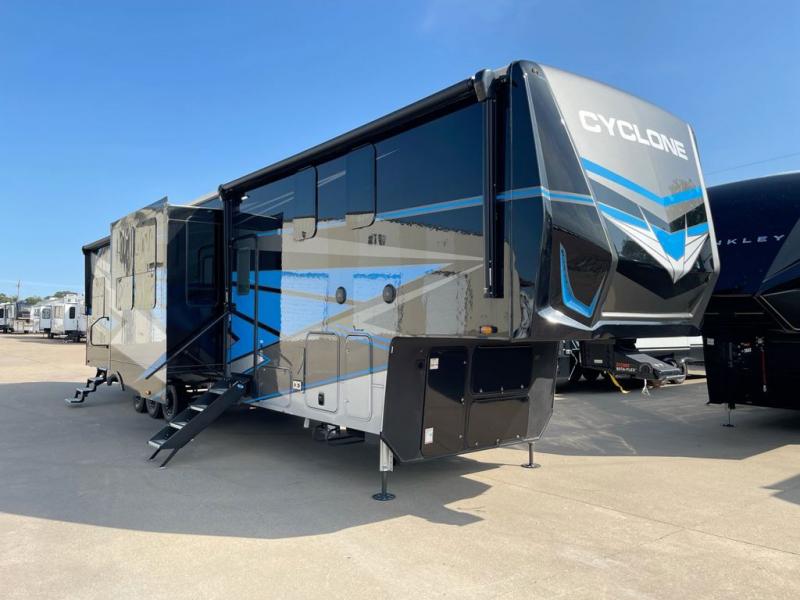 Satisfy your wanderlust with a Heartland Cyclone fifth wheel toy hauler! You won't have to sacrifice any luxury either with indulgent features like the king bedroom suite with an exclusive East to West bed tilt system with 30% more floor space, Stor-Mor three-sided access to the basement with 30% more storage capacity, and Step Caddy folding patio step for better stability as you enter or exit the patio. The industry first Grill and Go 25" residential pull out three burner griddle combo comes on models with an exterior kitchen for an easier cooking experience. The residential furniture gives you a high-quality experience on the road. If you like to dry camp longer then you will appreciate the industry's largest 150 gallons fresh water tanks. Come find the perfect model for you today!