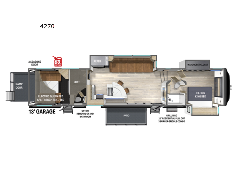 You won't believe all this toy hauler has to offer! The 13' garage includes dual entry doors, an electric queen bed above split bench seating, a loft, and a half bathroom. The chef can prepare their best home cooked meals with the three burner cooktop, and the curved bar top offers the perfect spot to enjoy your morning coffee and eggs. You can exit the kitchen through the two sliding doors and relax on the side patio where you can entertain friends. The exterior not only has two awnings to protect you rain or shine, but also an outside trash access which will come in very handy. When you're ready to wind down your nights, take a hot shower in the dual entry bathroom, then head directly into the front master suite where you can change into your pajamas stored in the wardrobe/closet slide and sleep on the tilting king bed!