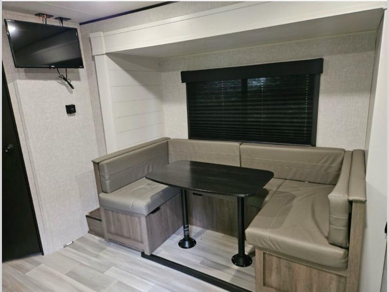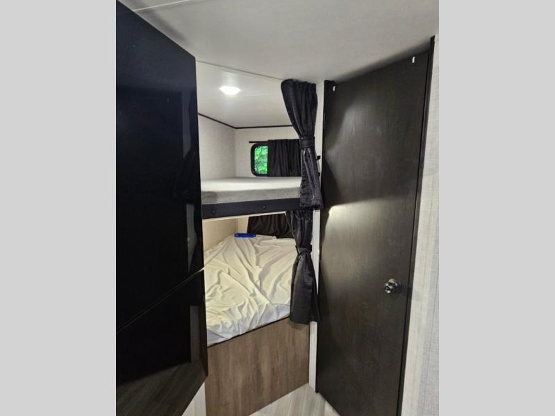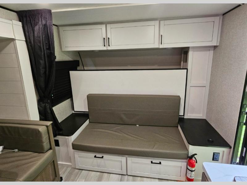 This travel trailer has everything the whole family will need for a comfortable camping trip! The kiddos can sleep on the set of double-size bunk beds, and you can sleep on the front 60" x 76" Murphy bed once converted from the sofa. You could even transform the U-shaped dinette slide into an extra sleeping space when you aren't using it to enjoy a meal prepared with the two burner range. There is even an outside kitchen with a refrigerator to enjoy a cold beverage while you cook dinner and watch the kids play a game of catch. After a fun day at the beach, head to the rear corner bathroom and wash the sand out of your hair in the tub/shower!