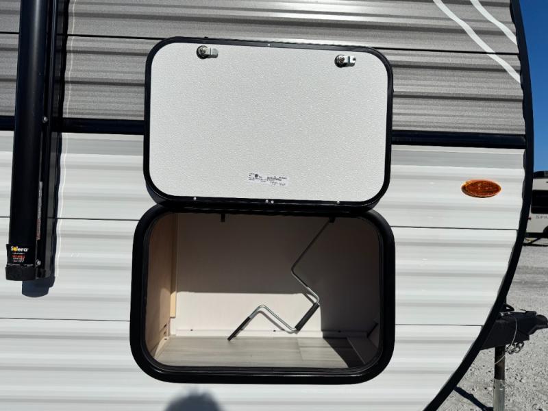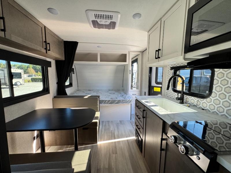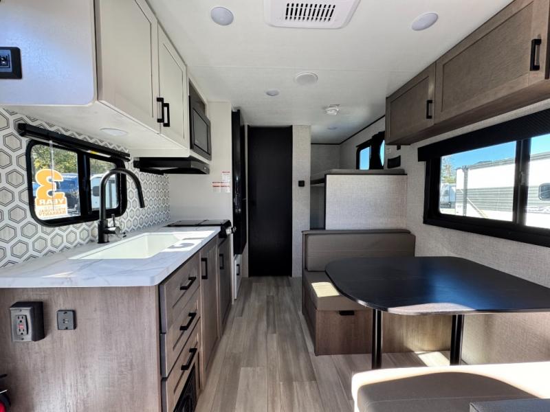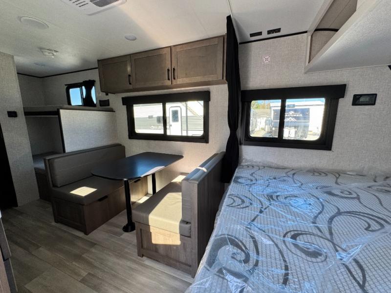 2025 Highland Ridge Open Range Conventional travel trailer 19BH: This single-axle trailer is perfect for outdoor excursions, so head out! You will find bunk beds, a bed up front, plus a booth dinette that can also be sleeping space for one to two people each night. There is a two burner cooktop and a microwave oven to cook breakfast in the morning, and full bath amenities so you can clean up after a long day outdoors. This model also includes outdoor storage that will be perfect for tackle boxes or your tools, and the 13' power awning will provide shade as you visit with friends.