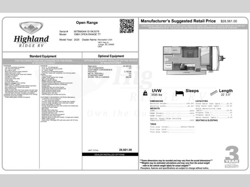 2025 Highland Ridge Open Range Conventional travel trailer 19BH highlights: