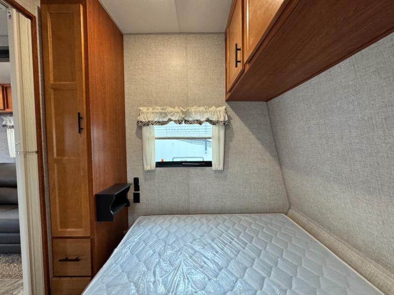 - Front private bedroom with queen bed space and storage