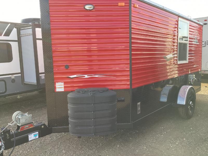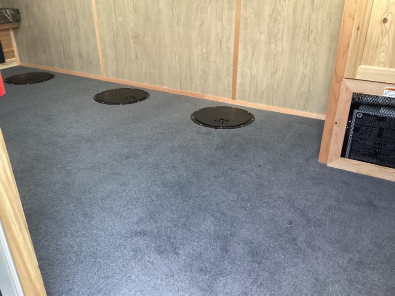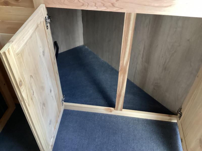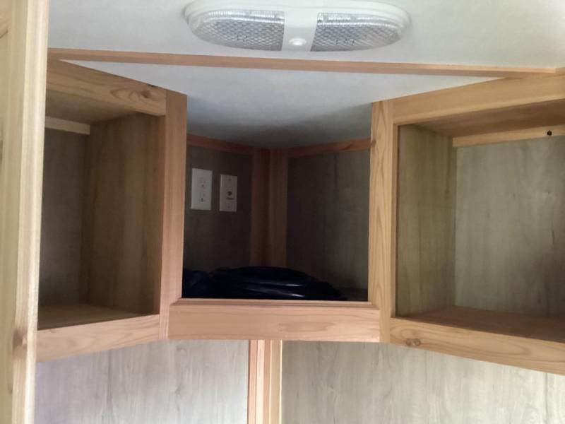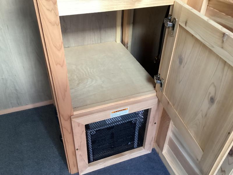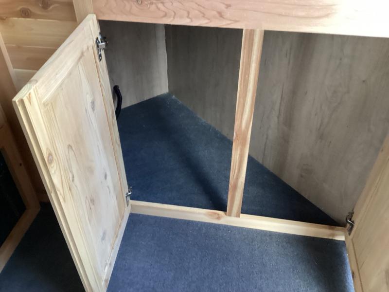 Cedar-style or choice trim, wood-style vinyl flooring, carpeted sleeping areas, and upper storage cabinets give it a cabin-like feel. -