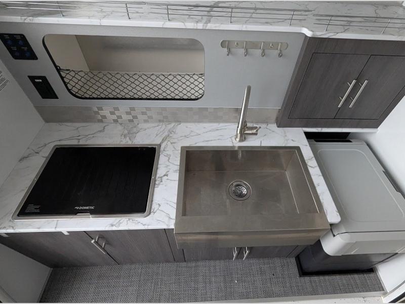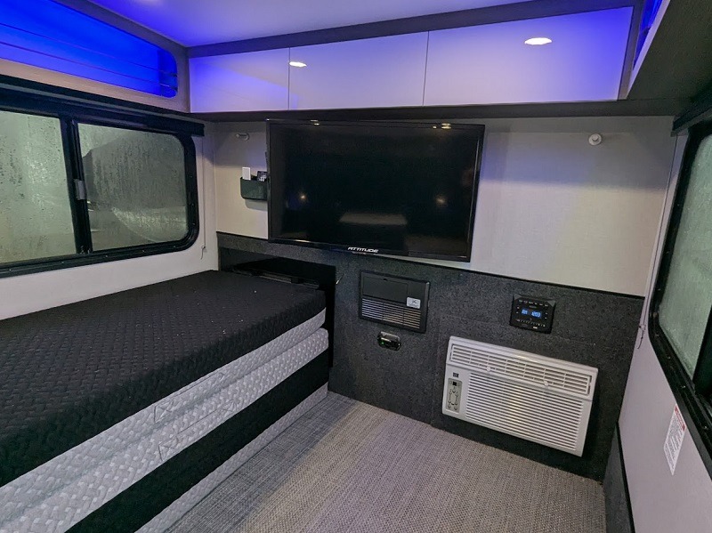 When your adventure is all about the outdoors, but you would rather sleep on a comfortable queen-size bed instead of an air mattress, this Luna teardrop trailer is precisely what you need! The 260-270 lbs. tongue weight and the 550-625 lbs. carrying capacity allow you to hitch up and head out without a worry. With the full kitchen that has been included in the hatch of this model, you have the ability to prepare and enjoy a delicious meal outdoors that isn't hot dogs or s'mores, and the kitchen storage allows you to keep all of your favorite snacks and spices handy while you cook. Every morning you will love waking up to the beautiful and picturesque views of the lake or mountains coming through the large tempered glass panoramic windshield, and when you find yourself camping out in the middle of summer, you will enjoy staying indoors a little bit longer because of the 8,000 BTU air conditioner that will cool you down. The optional straight awning creates a bit more outdoor living space protected from the elements!