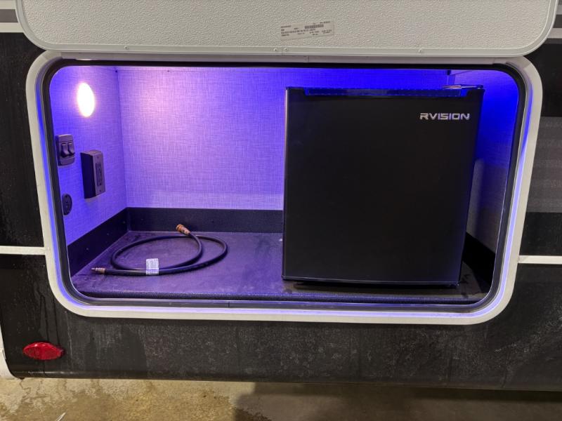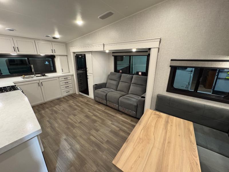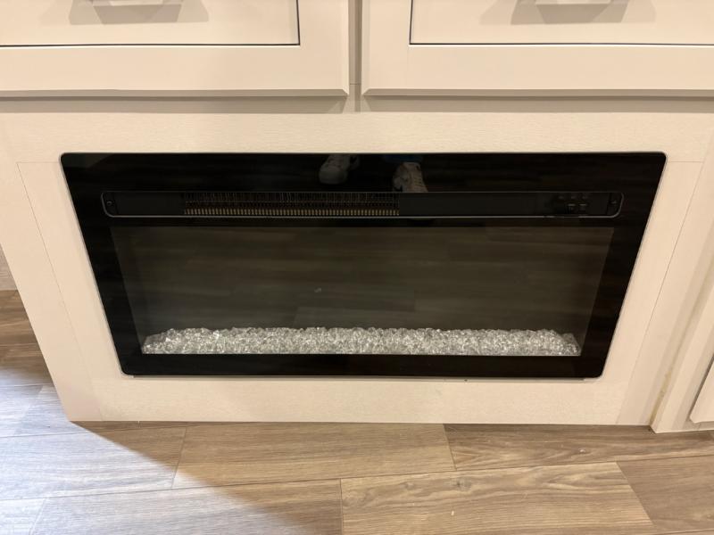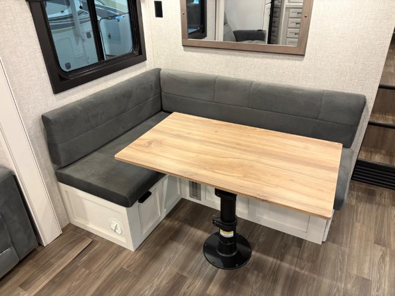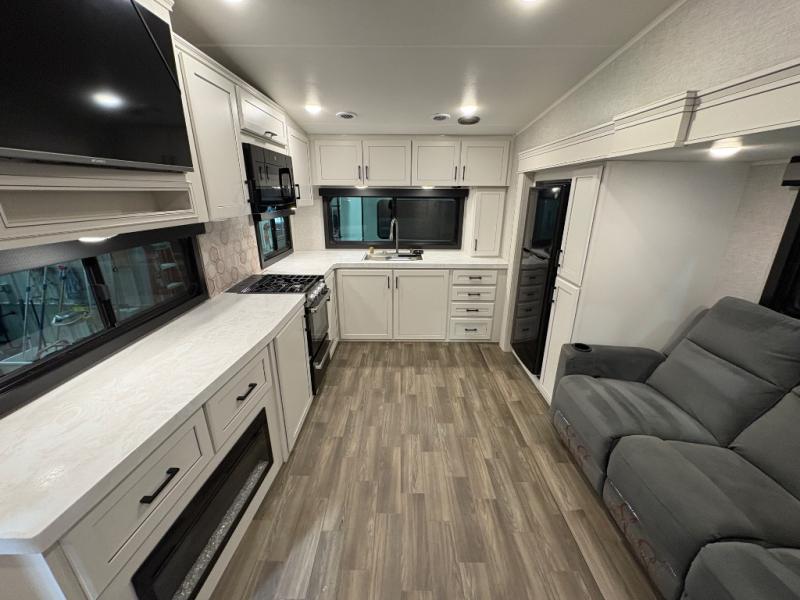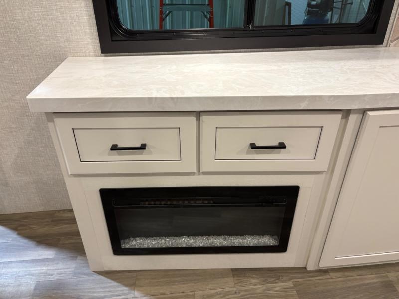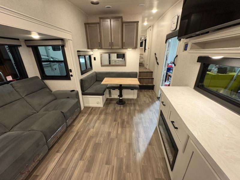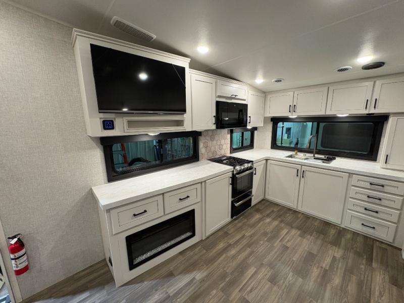 This fifth wheels is perfect for extended stays at the campground or weekend trips to the lake! Once you arrive at your destination, you can set up the 18' electric awning, then make lunch on the outside kitchen. The main living area will be a favorite place to join together since there is a theater seat across from the TV, an L-shaped dinette, and a fireplace option if you want to make this space even more cozy. Up front, a private bedroom includes an Olympic queen bed, dual wardrobes, plus washer and dryer prep if choose to add those appliances.