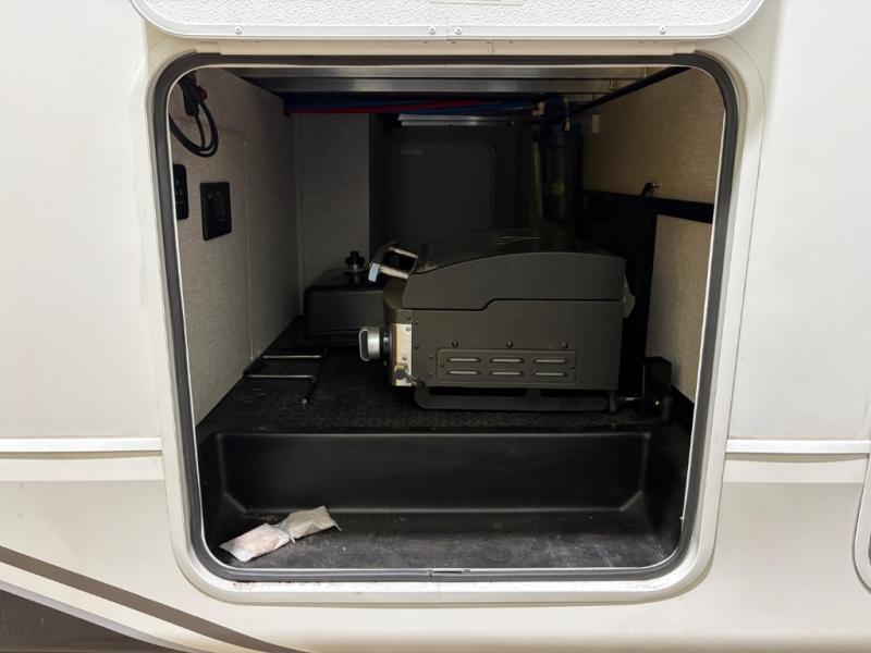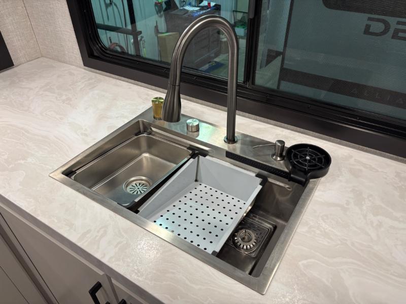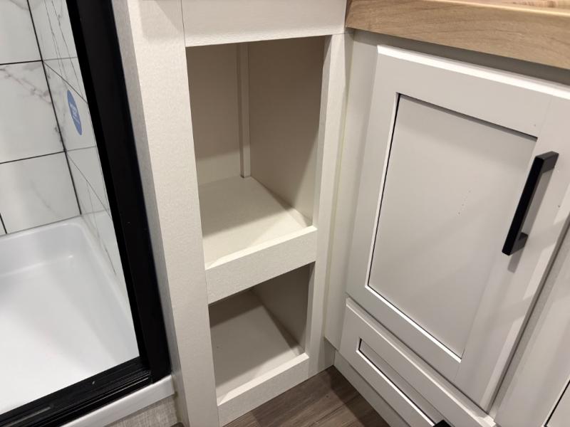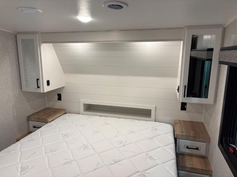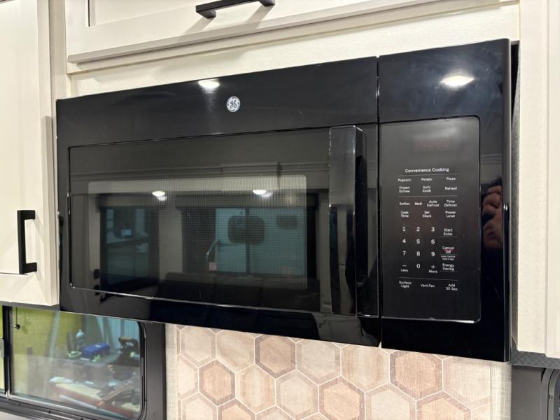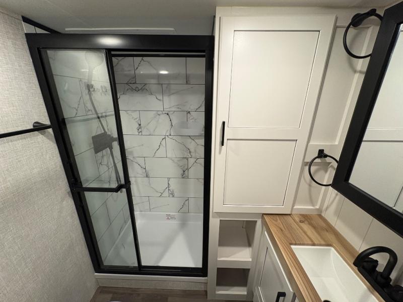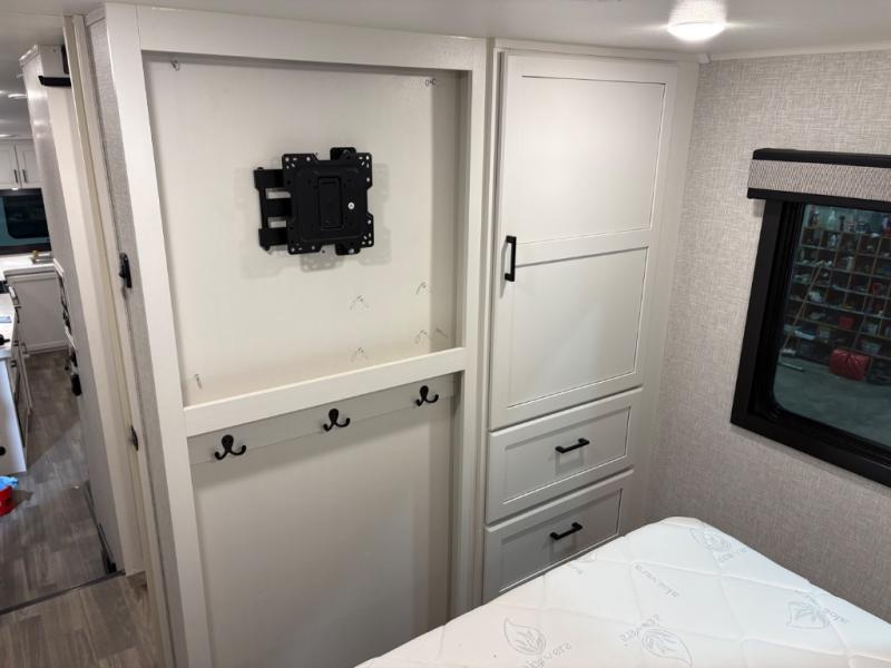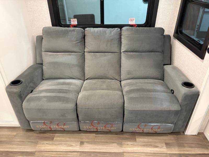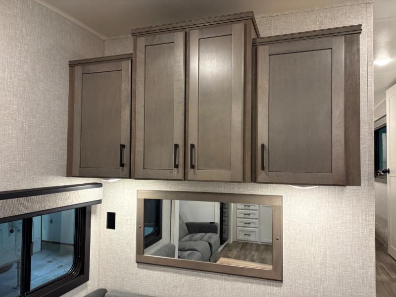 This fifth wheels is perfect for extended stays at the campground or weekend trips to the lake! Once you arrive at your destination, you can set up the 18' electric awning, then make lunch on the outside kitchen. The main living area will be a favorite place to join together since there is a theater seat across from the TV, an L-shaped dinette, and a fireplace option if you want to make this space even more cozy. Up front, a private bedroom includes an Olympic queen bed, dual wardrobes, plus washer and dryer prep if choose to add those appliances.