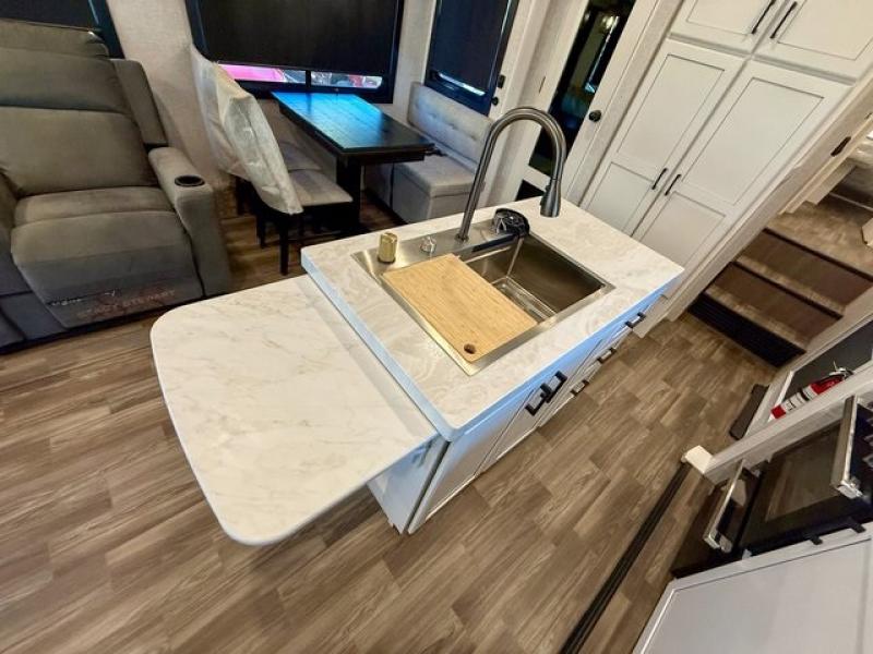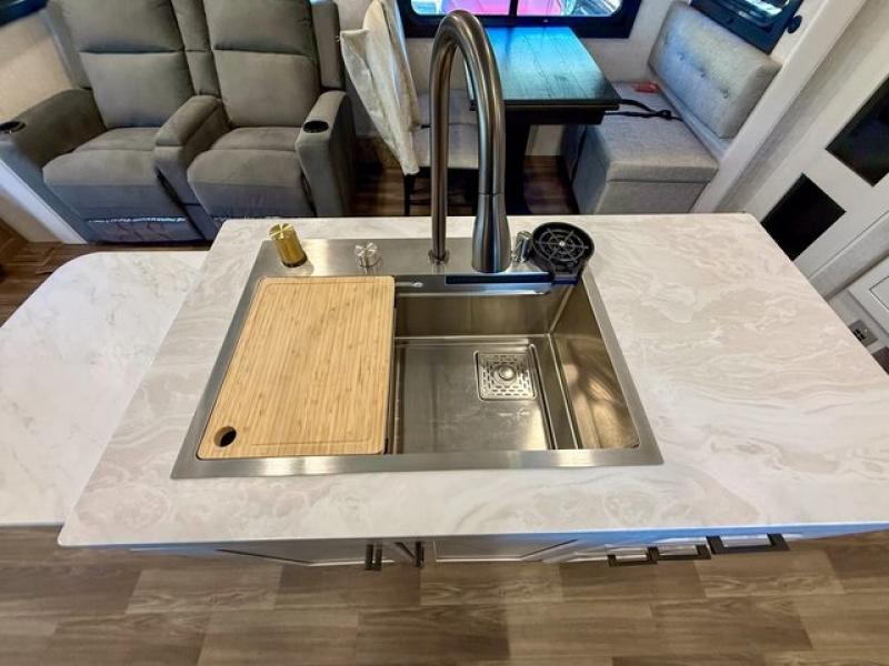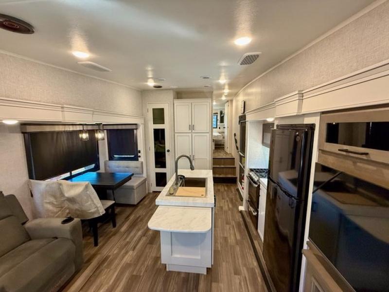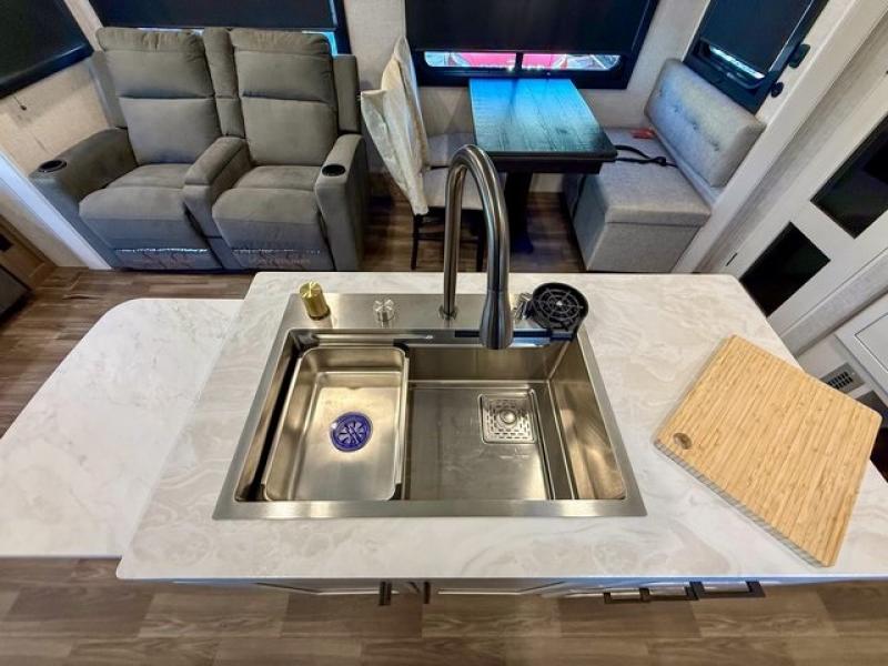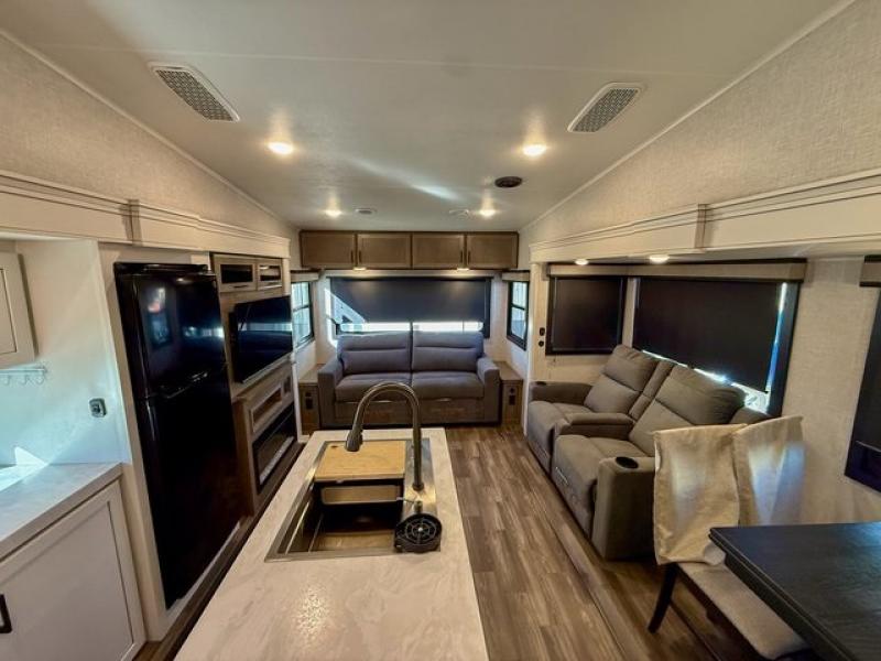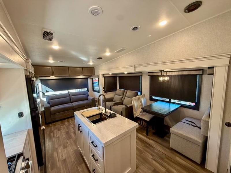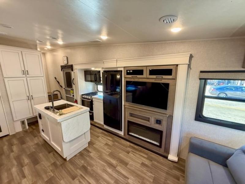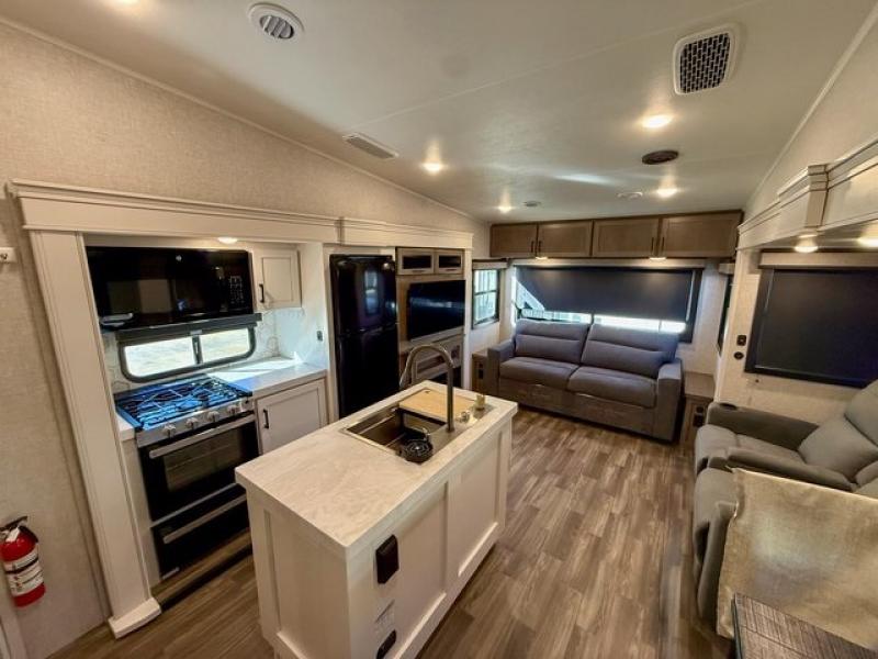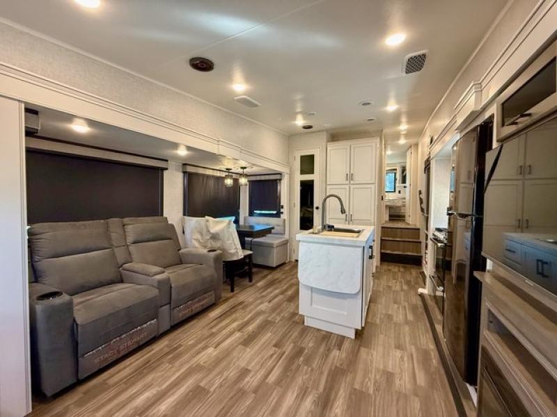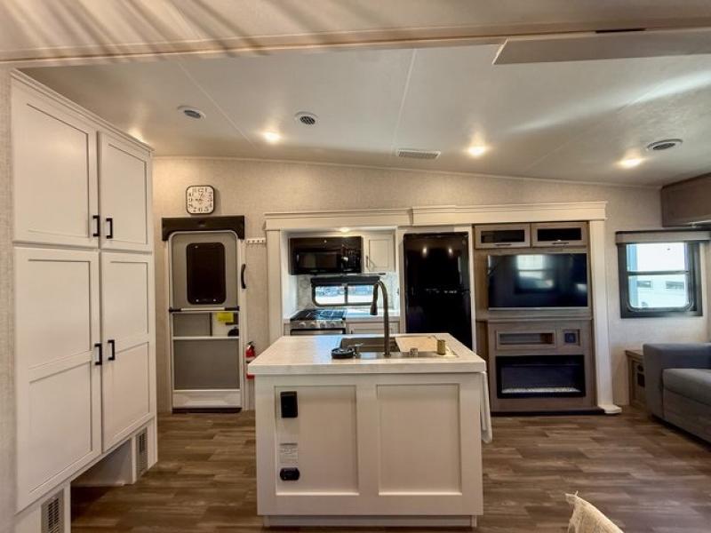 Pack your bags and head off on adventure in this spacious fifth wheel for four! The dual opposing slides in the kitchen and main living area will give your crew more space to relax. Speaking of relaxing, there is a theater seat across from the fireplace and TV plus a tri-fold sofa to make it a movie night. The free-standing table includes two chairs on one side and a bench on the other, and the kitchen island is sure to be appreciated by the chef of your group. There is also a spacious kitchen pantry and an outside kitchen if they'd rather cook outdoors. The front master bedroom includes an Olympic queen bed, dual wardrobes plus a third wardrobe within the bedroom slide out, and TV prep if you want the option to watch a show in bed!