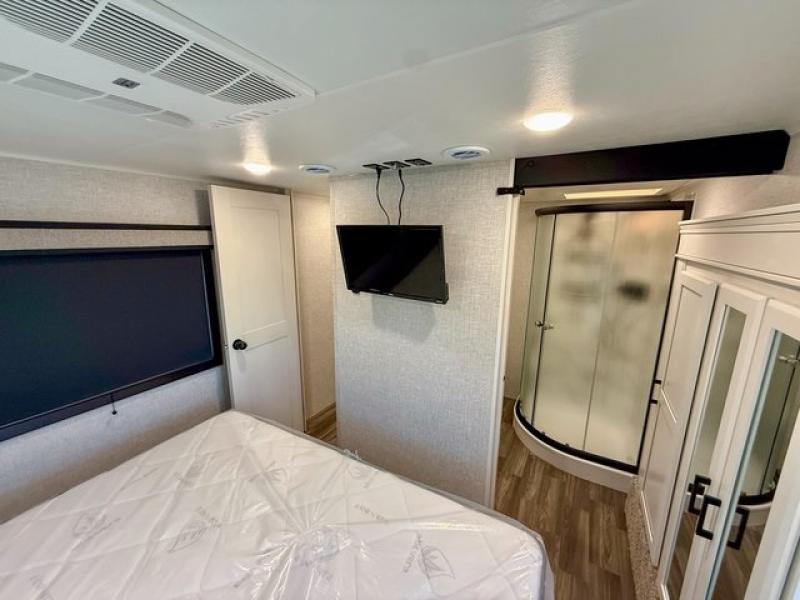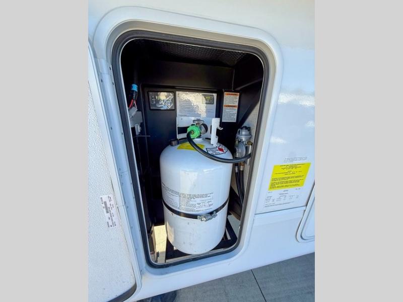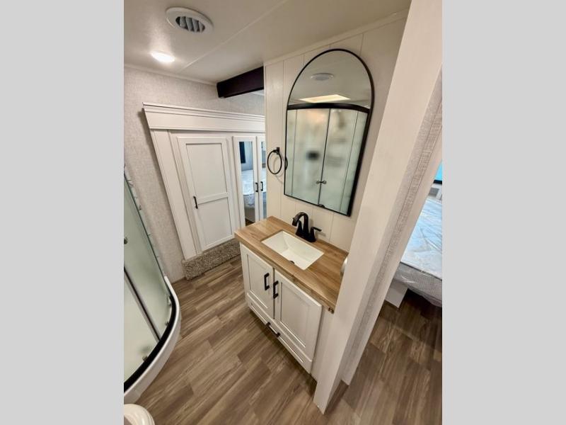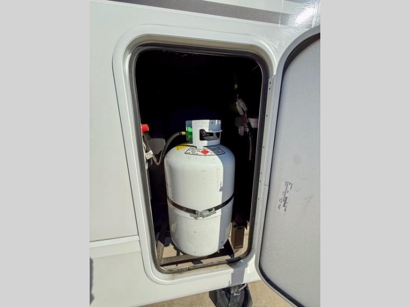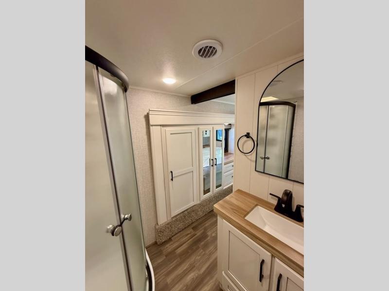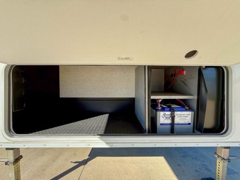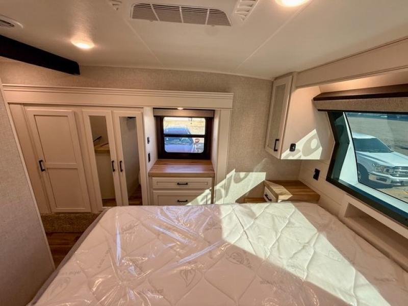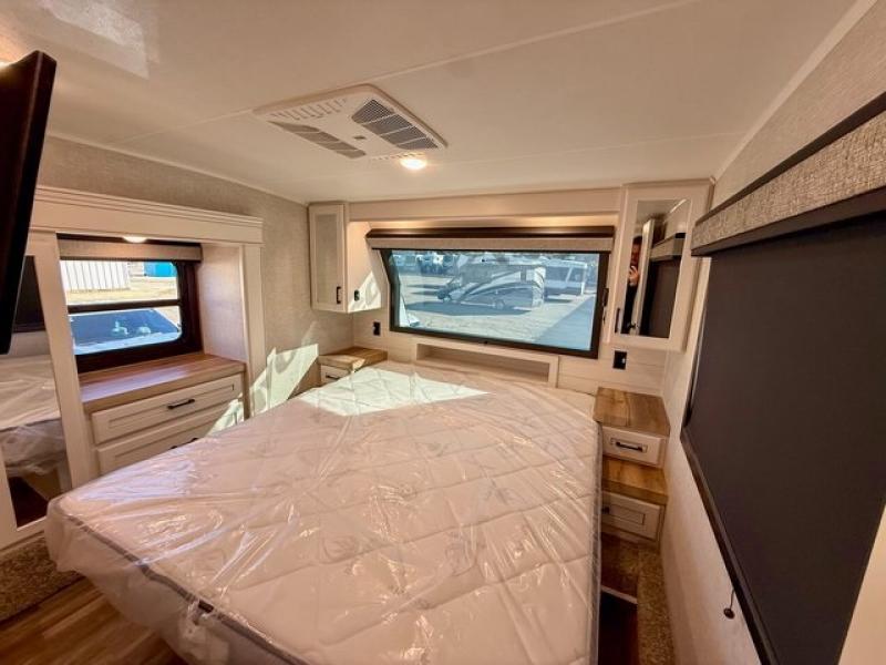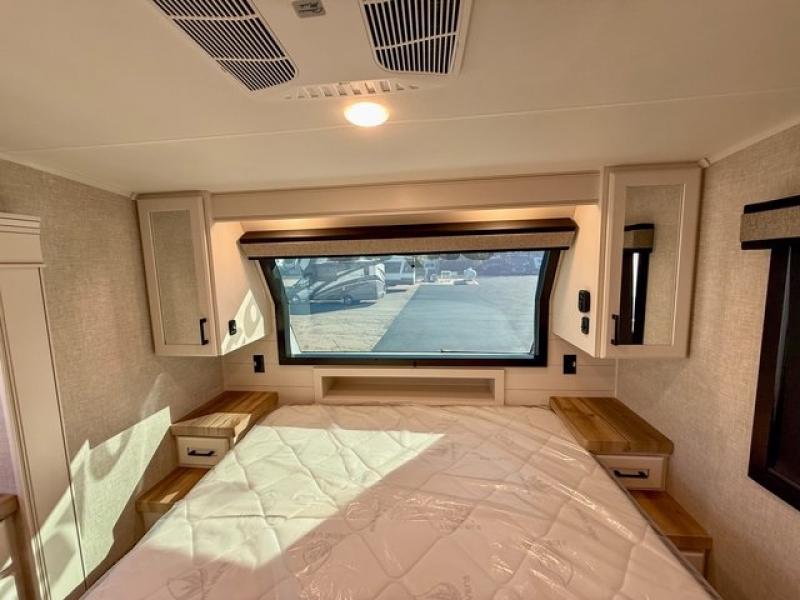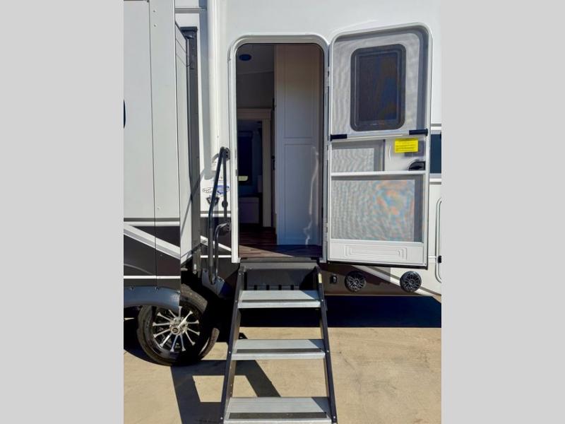 Pack your bags and head off on adventure in this spacious fifth wheel for four! The dual opposing slides in the kitchen and main living area will give your crew more space to relax. Speaking of relaxing, there is a theater seat across from the fireplace and TV plus a tri-fold sofa to make it a movie night. The free-standing table includes two chairs on one side and a bench on the other, and the kitchen island is sure to be appreciated by the chef of your group. There is also a spacious kitchen pantry and an outside kitchen if they'd rather cook outdoors. The front master bedroom includes an Olympic queen bed, dual wardrobes plus a third wardrobe within the bedroom slide out, and TV prep if you want the option to watch a show in bed!