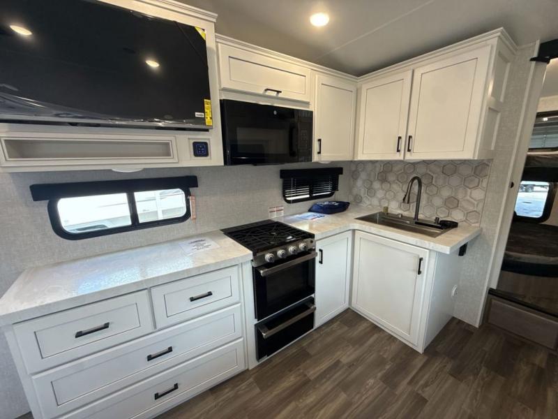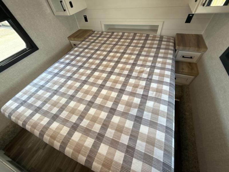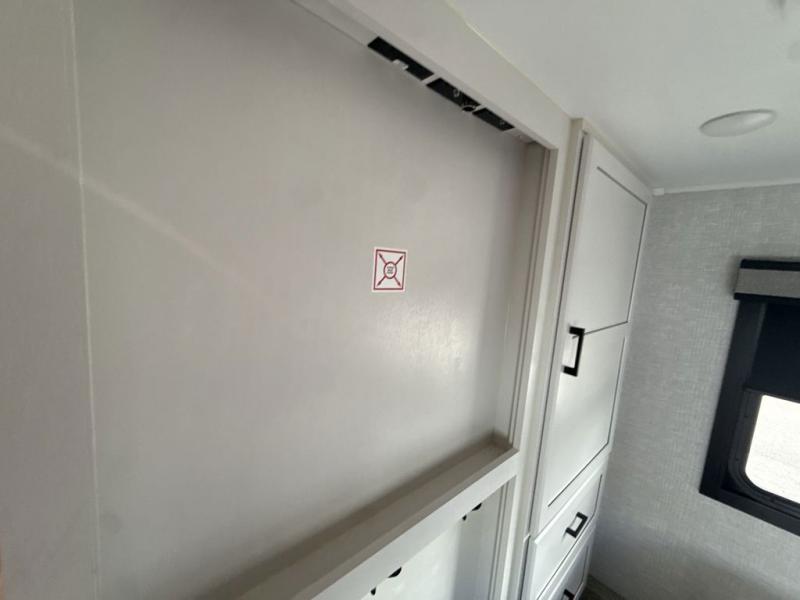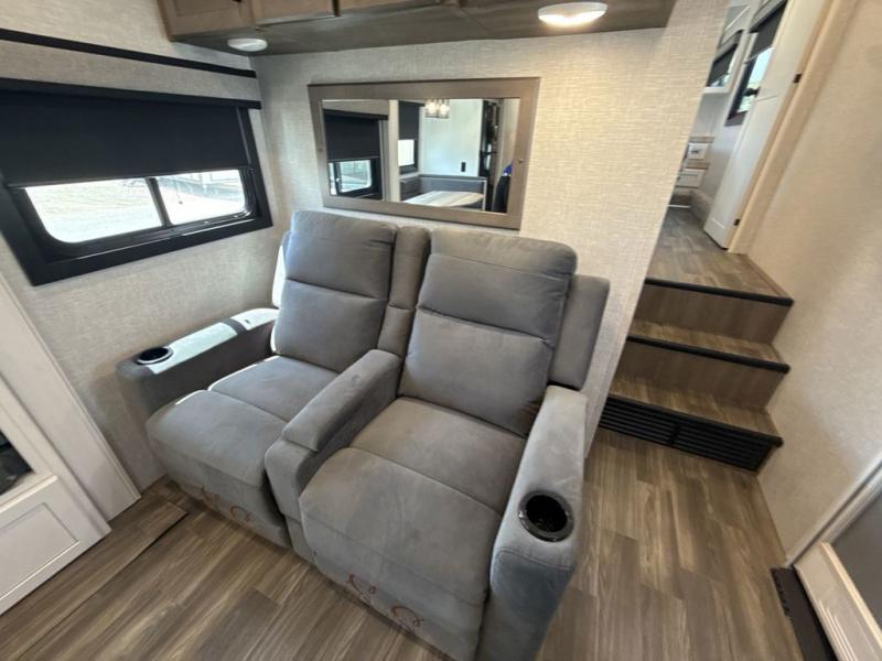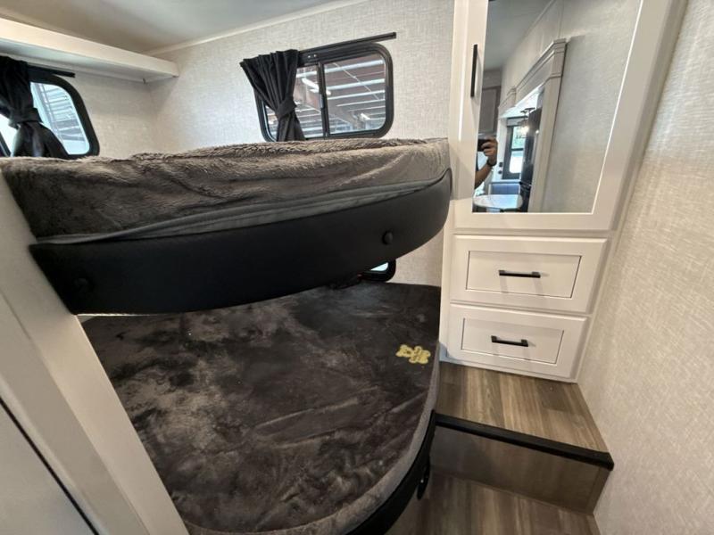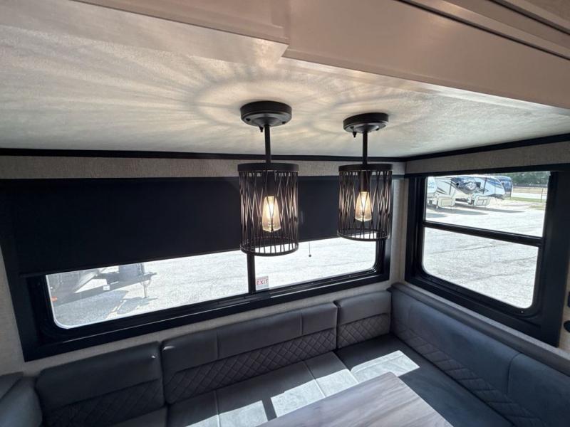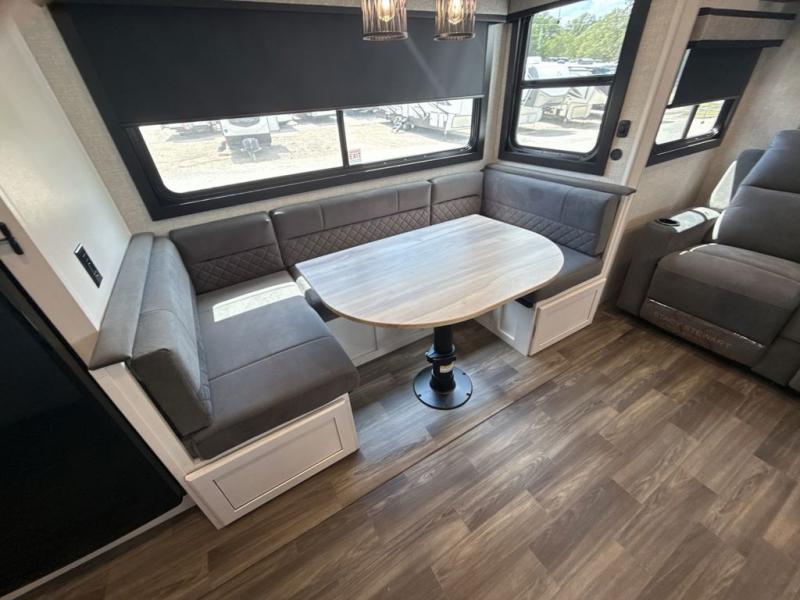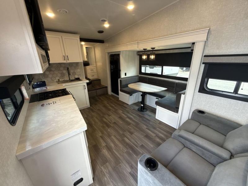 If you're needing a fifth wheel with more sleeping space, this unit will be perfect for you! There are double-size bunks in the back with a wardrobe for your guests' things and TV prep if you want to add a TV here. The front private bedroom up front will have you feeling right at home with its Olympic queen bed and dual wardrobes, and any additional guests you have can sleep on the U-shaped dinette within the slide out. There is also a theater seat here where you can relax with a good book in the evenings.