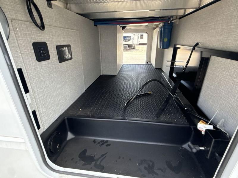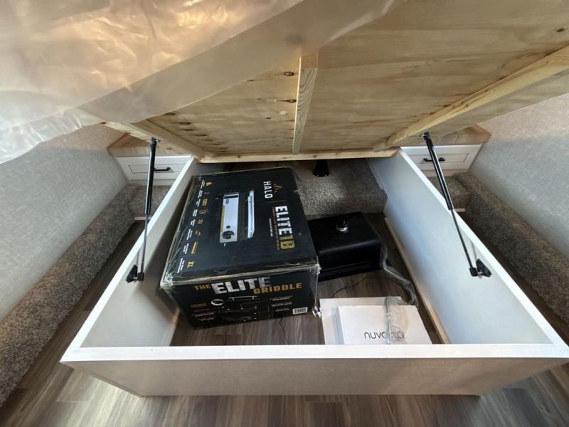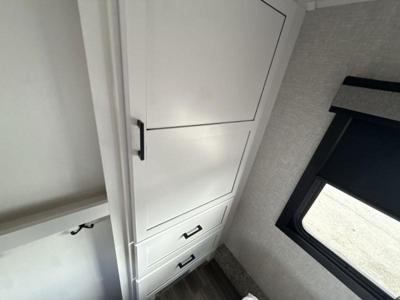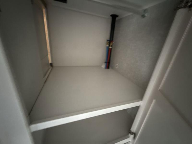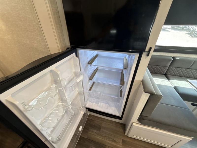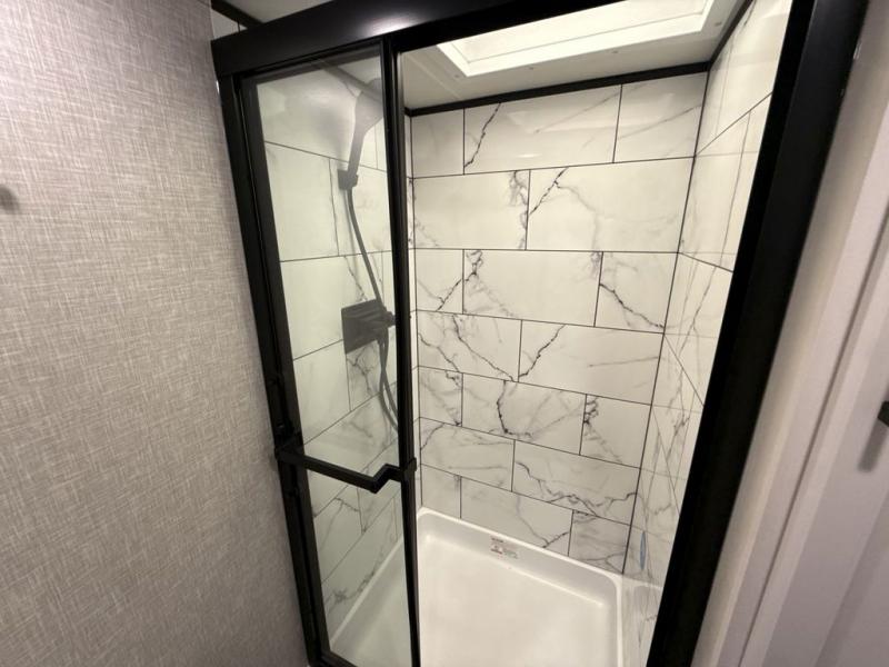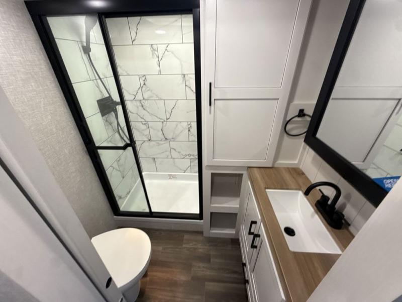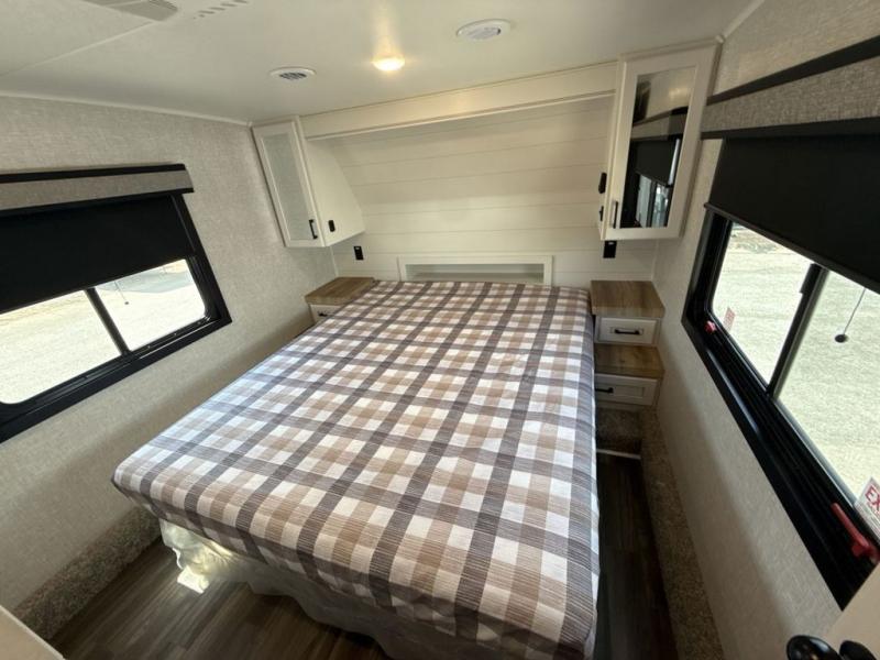 If you're needing a fifth wheel with more sleeping space, this unit will be perfect for you! There are double-size bunks in the back with a wardrobe for your guests' things and TV prep if you want to add a TV here. The front private bedroom up front will have you feeling right at home with its Olympic queen bed and dual wardrobes, and any additional guests you have can sleep on the U-shaped dinette within the slide out. There is also a theater seat here where you can relax with a good book in the evenings.