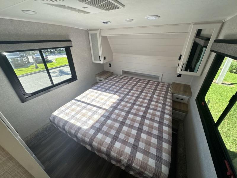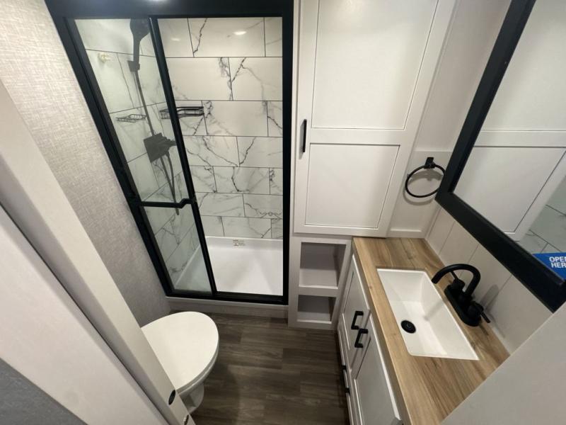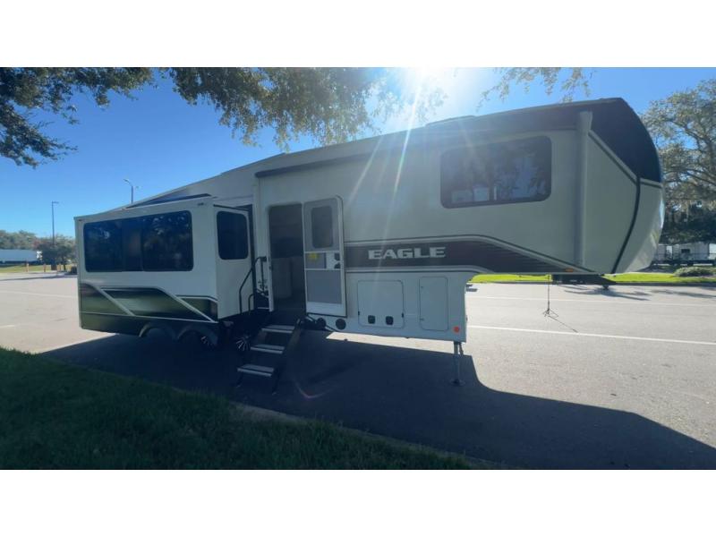 With any Eagle HT fifth wheel or travel trailer by Jayco you will enjoy a smooth drive thanks to the 4 Star Handling Package and MORryde CRE-3000 rubberized suspension. The Customer Value Package includes amenities that are sure to make camping easier than ever, like the 60K on-demand water heater, Keyed-Alike lock system, 15,000 BTU "Whisper Quiet" A/C, and more. Handcrafted and glazed door/drawer fronts will make your space feel more like home, along with residential vinyl flooring throughout, GE appliances, and blackout roller shades with reflective side throughout to keep the sun out when you want to sleep in. Each model also includes a NuVo H2O water treatment system with filters included, interior and exterior "Blue Sync" audio connect with MB Quart Sound for your TV and phone, and 100% no floor vents for added comfort and convenience!