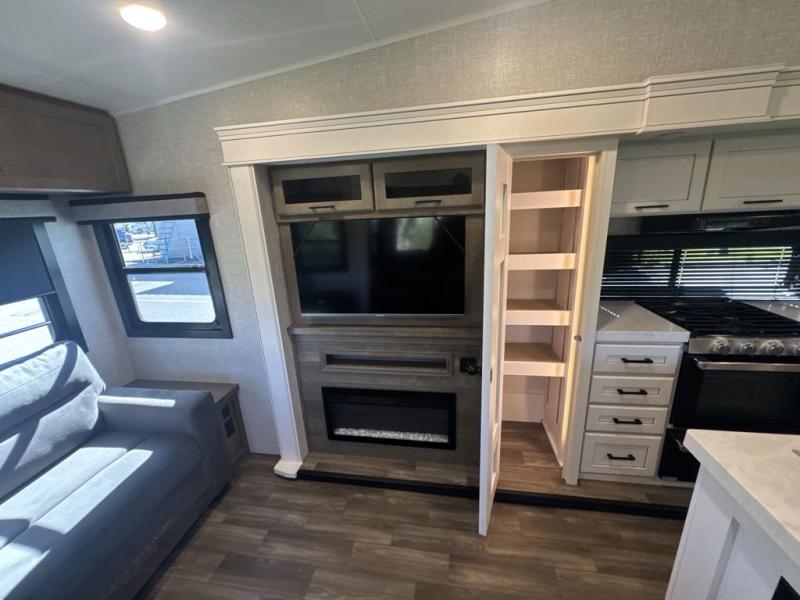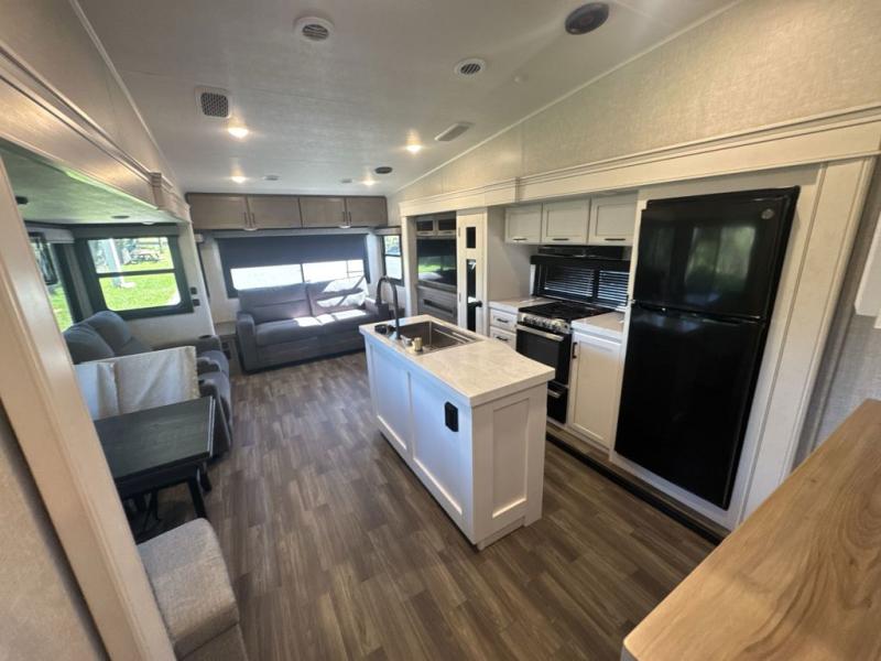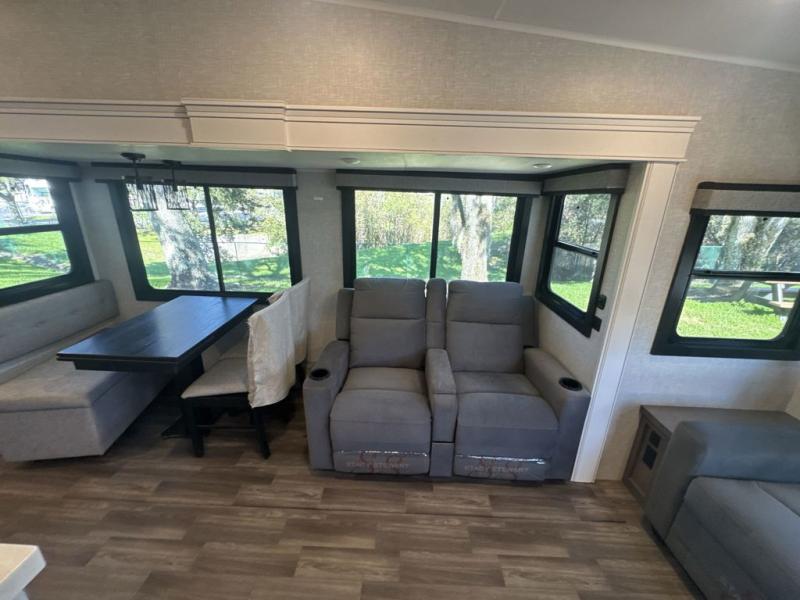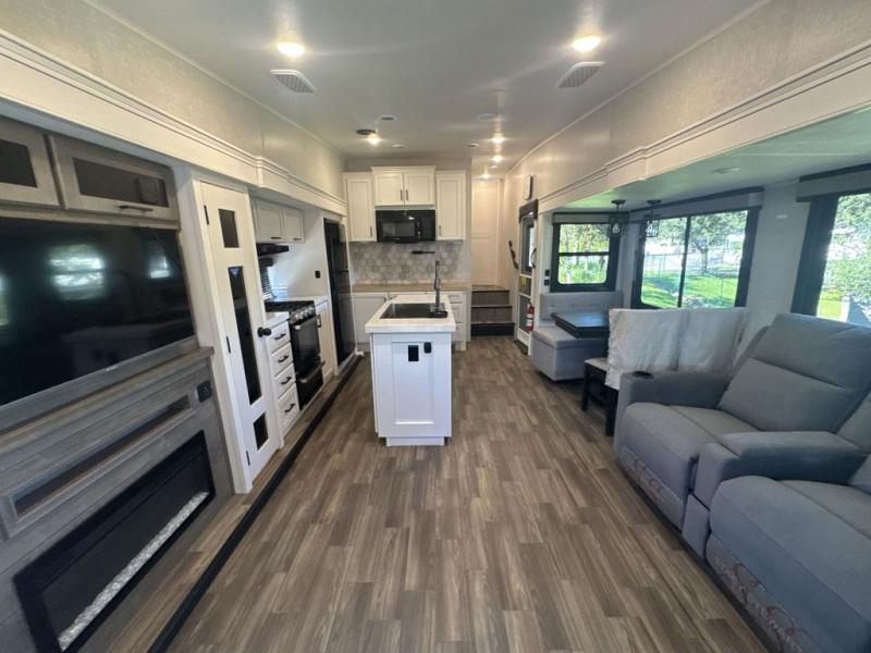 You will love how much interior space you have in this fifth wheel thanks to the dual opposing slides in the combined kitchen and living area! While your crew is relaxing on the theater seat or tri-fold sofa, you can prepare dinner on the GE black and stainless 21" range. There is also an entertainment center and fireplace across from the theater seat for easy viewing, and the table and chairs with a bench will be the perfect place to play a board game at. Head to the front to enjoy the private bedroom with an Olympic queen bed, and the full bath is close by for easy nighttime use!