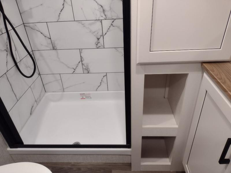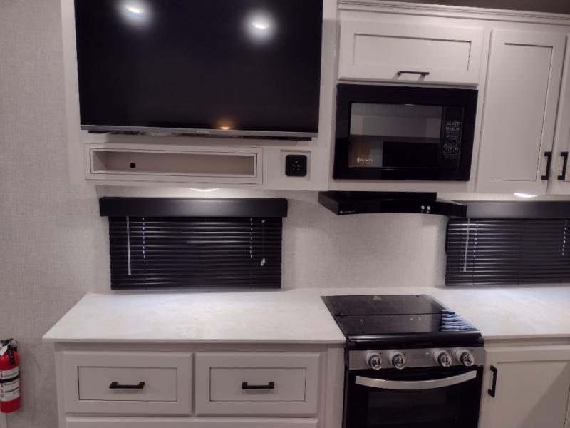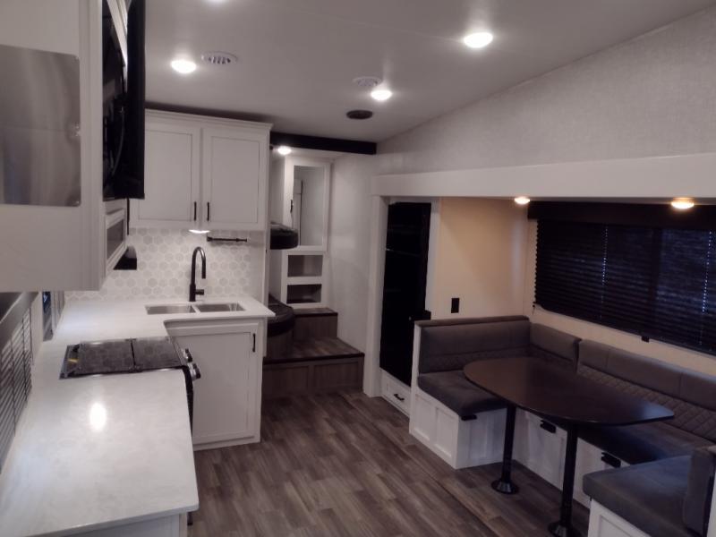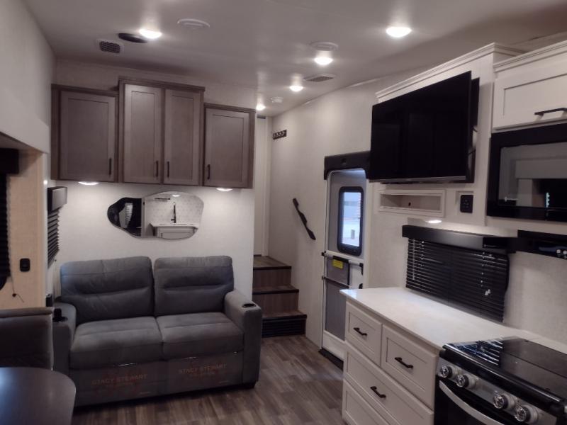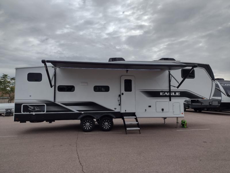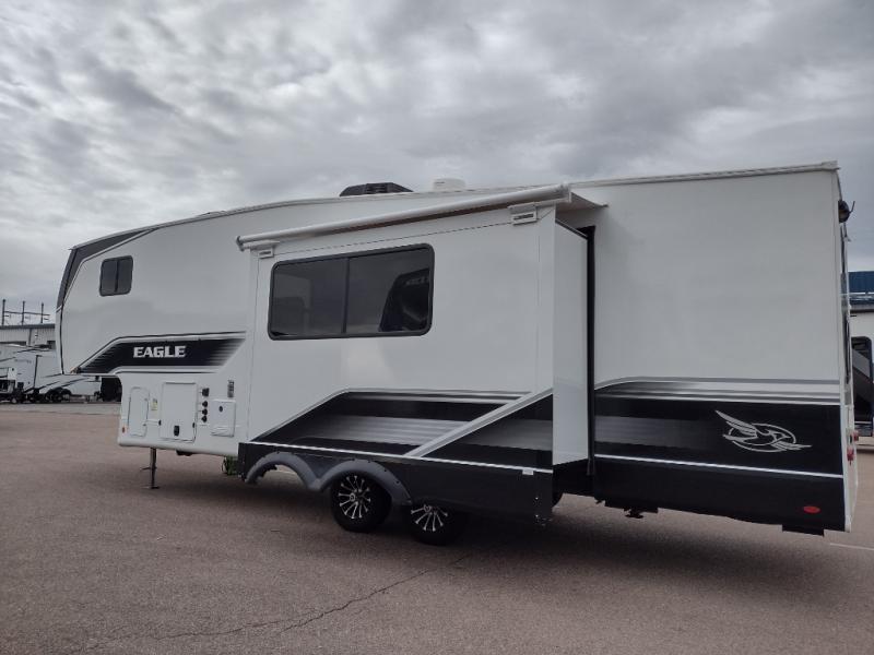 With any Eagle SLE fifth wheel by Jayco, you will enjoy a lighter tow weight, high-end finishes, and the same quality construction you've come to expect from Jayco! There is an Alpha Ply TPO roof membrane, a fully enclosed and heated underbelly, plus Stronghold VBL walls for added durability. There is also a rear 2" towing receiver outside, along with metal slam latch baggage doors, MORryde Step Above entry steps, and a Winegard Air 360 antenna with router prep if you want to stay connected as you camp. Once inside you'll enjoy the handcrafted and glazed door/drawer fronts, blackout pleated shades throughout, and residential vinyl flooring throughout with no carpet for an easier clean. The on-demand water heater, 30K BTU furnace, and 15K BTU "Whisper Quiet" A/C will ensure your comfort year around, and the optional Overland 1 Solar Package can be added if you need off-grid capabilities!